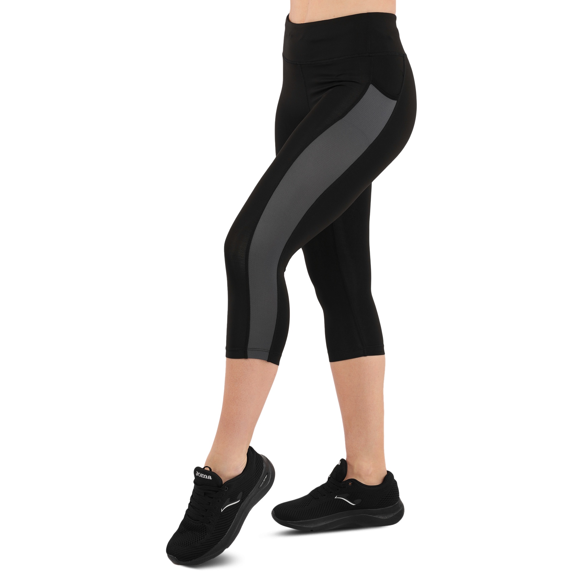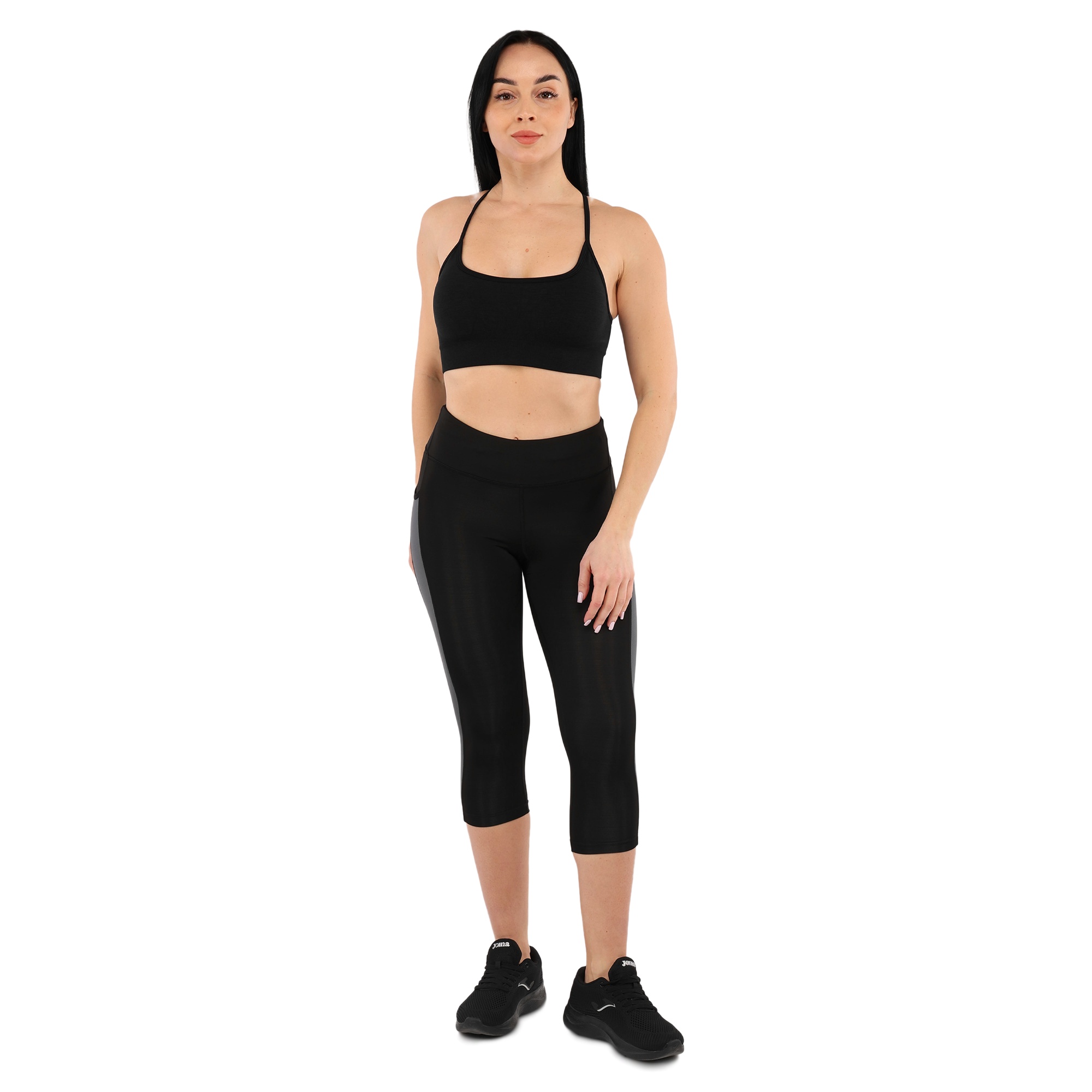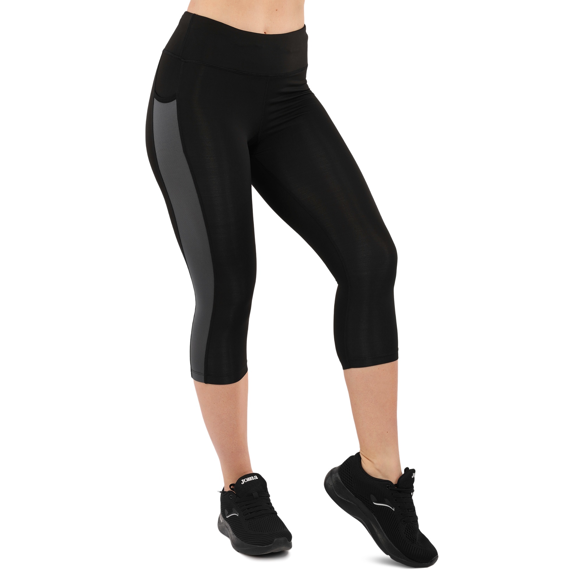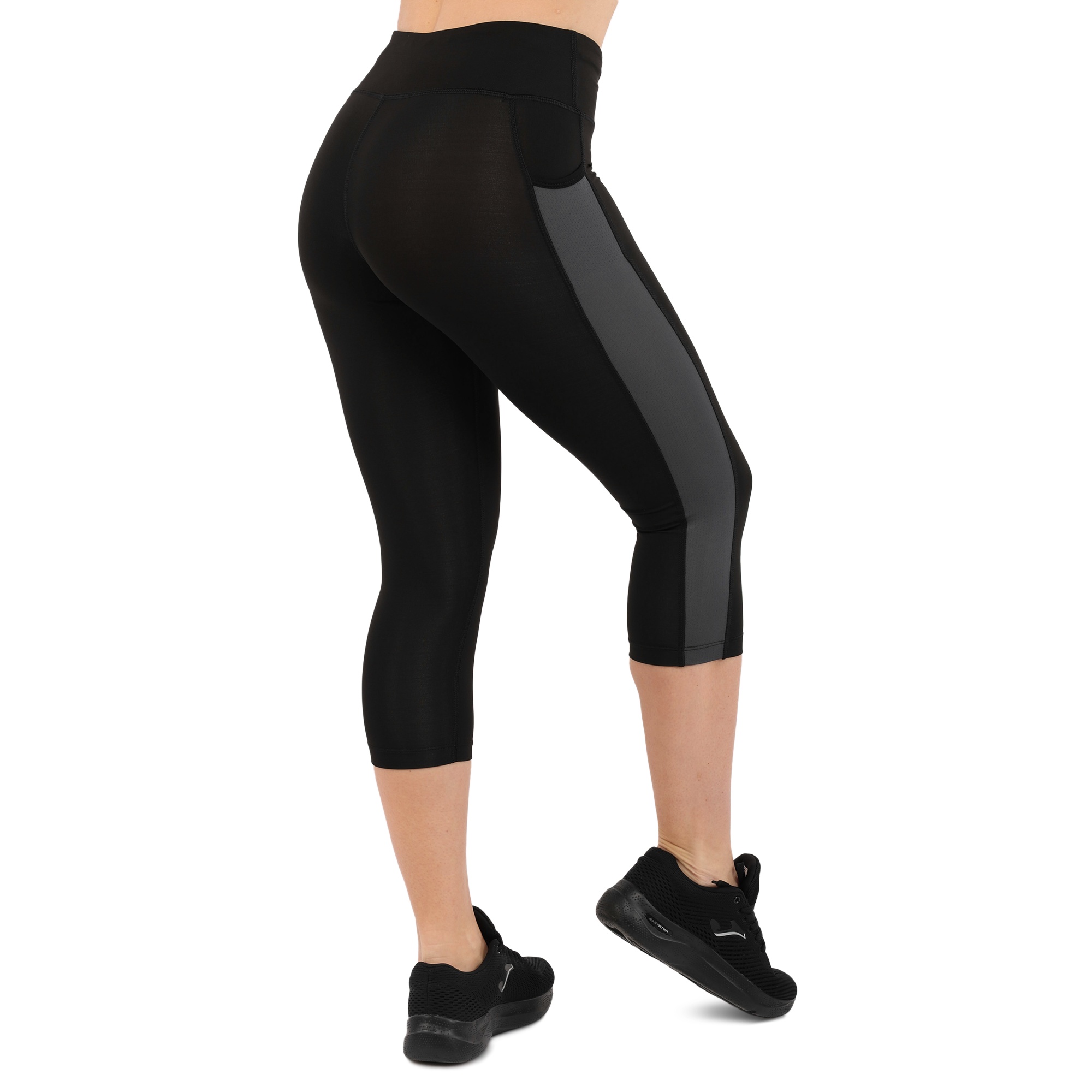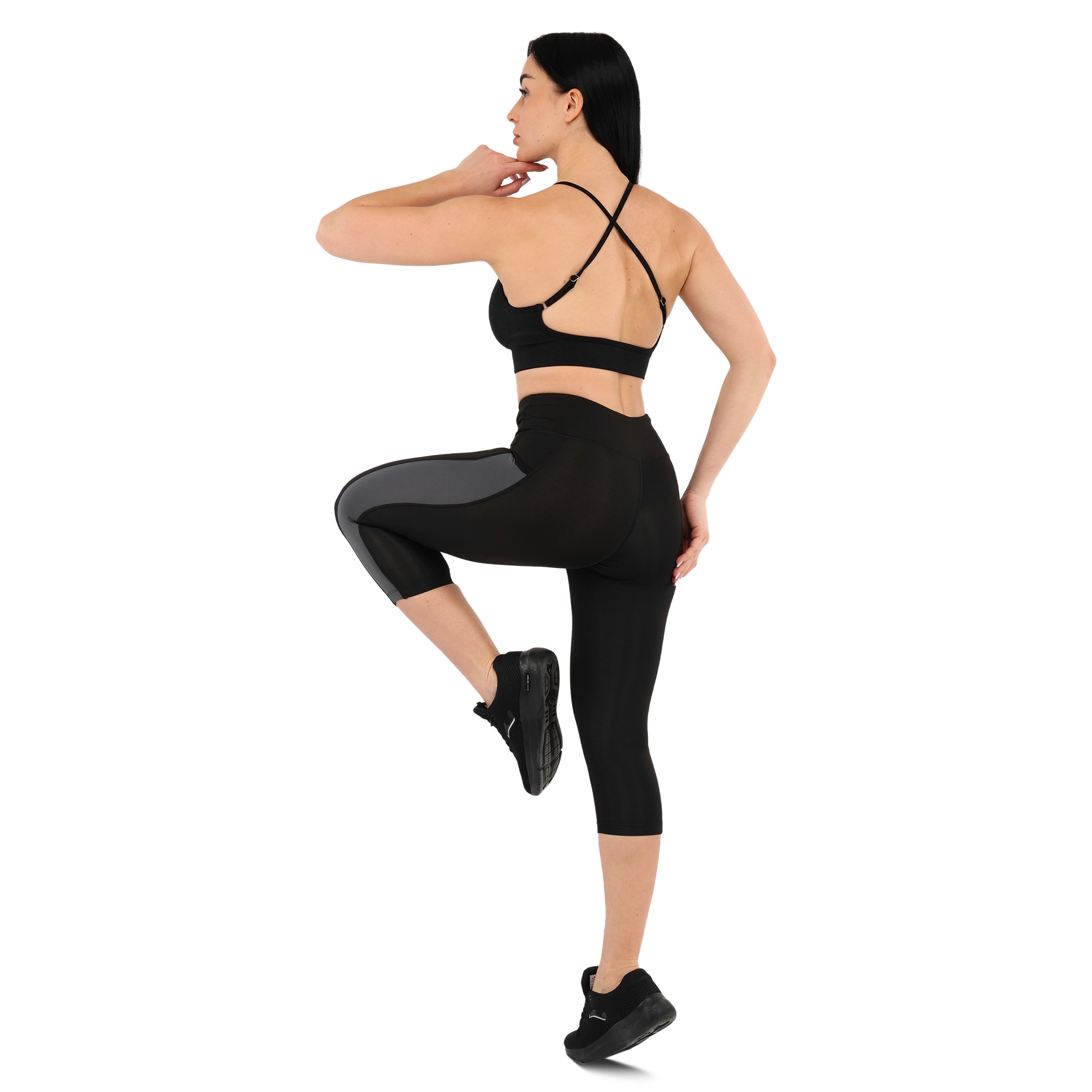 Жіночі спортивні лосини виготовлені з лайкри. Даний матеріал забезпечує високу еластичність і міцність виробу. Крім привабливого дизайну, лосини також мають ряд інших переваг. З боків у них є кишені, які дозволяють взяти з собою на тренування телефон, навушники, ключі або інші невеликі особисті речі. Кишені накладні і теж виготовлені з еластичної тканини, тому надійно утримують вміст на місці. Легінси мають зменшену довжину і закривають ноги до рівня трохи нижче коліна. Це відмінний варіант для тренувань в теплу пору року. Широкий еластичний пояс дозволяє надійно зафіксувати екіпіровку на тілі, а плоскі шви не натирають.