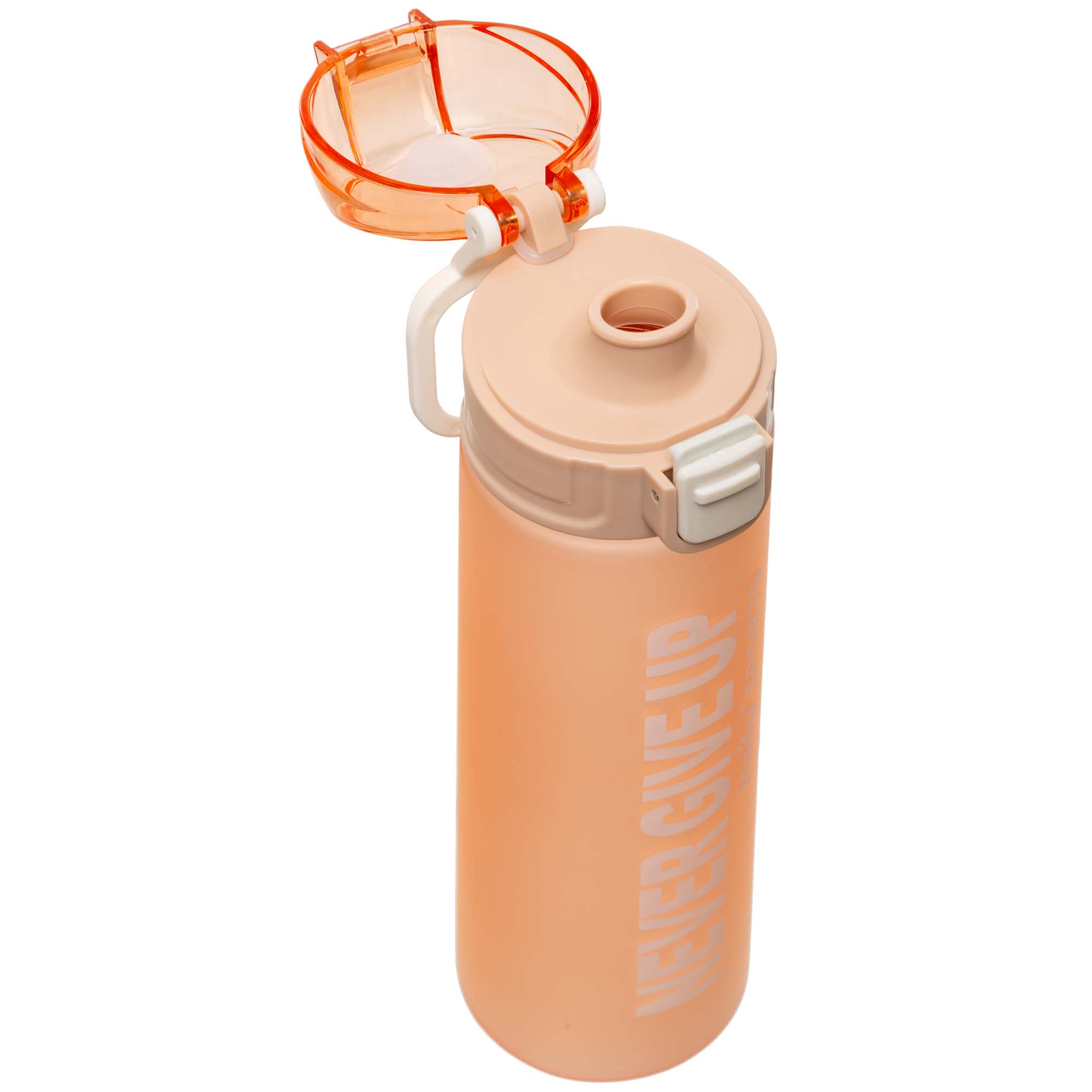 Однією з помітних особливостей дизайну стає напис “NEVER GIVE UP”, нанесений яскравим шрифтом. Це не просто слоган, це маленький щоденний тригер, здатний нагадати про ваші цілі. Широка кришка з округлою формою гармонійно доповнює форму пляшки й забезпечує зручне захоплення навіть під час інтенсивних тренувань.