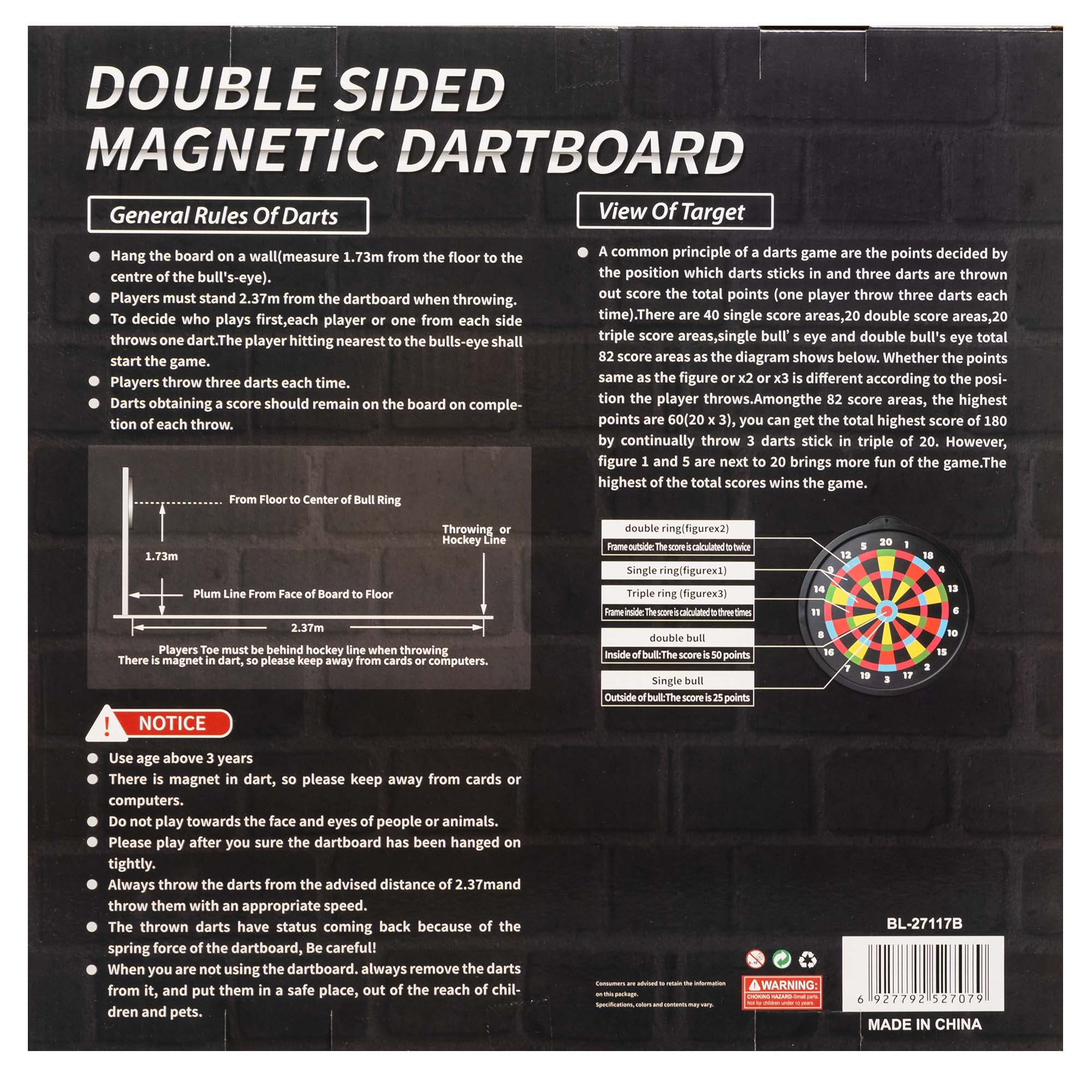 Мішень для магнітного дартсу Baili BL-27117 виготовлена з пластику і має спеціальне магнітне покриття, яке забезпечує фіксацію дротиків на ній. Дротики мають класичний дизайн, проте замість гострого наконечника на них розміщується магніт, який прилипає до мішені і не дозволяє дротику впасти. Така гра в дартс є повністю безпечною як для дорослих, так і для дітей: дротики не пошкоджують меблі або стіни в разі промаху. Діаметр мішені становить 16 дюймів, що дозволяє легко влучити в таку велику мішень навіть маленькій дитині. Використовувати набір рекомендується дітям старше 6 років.