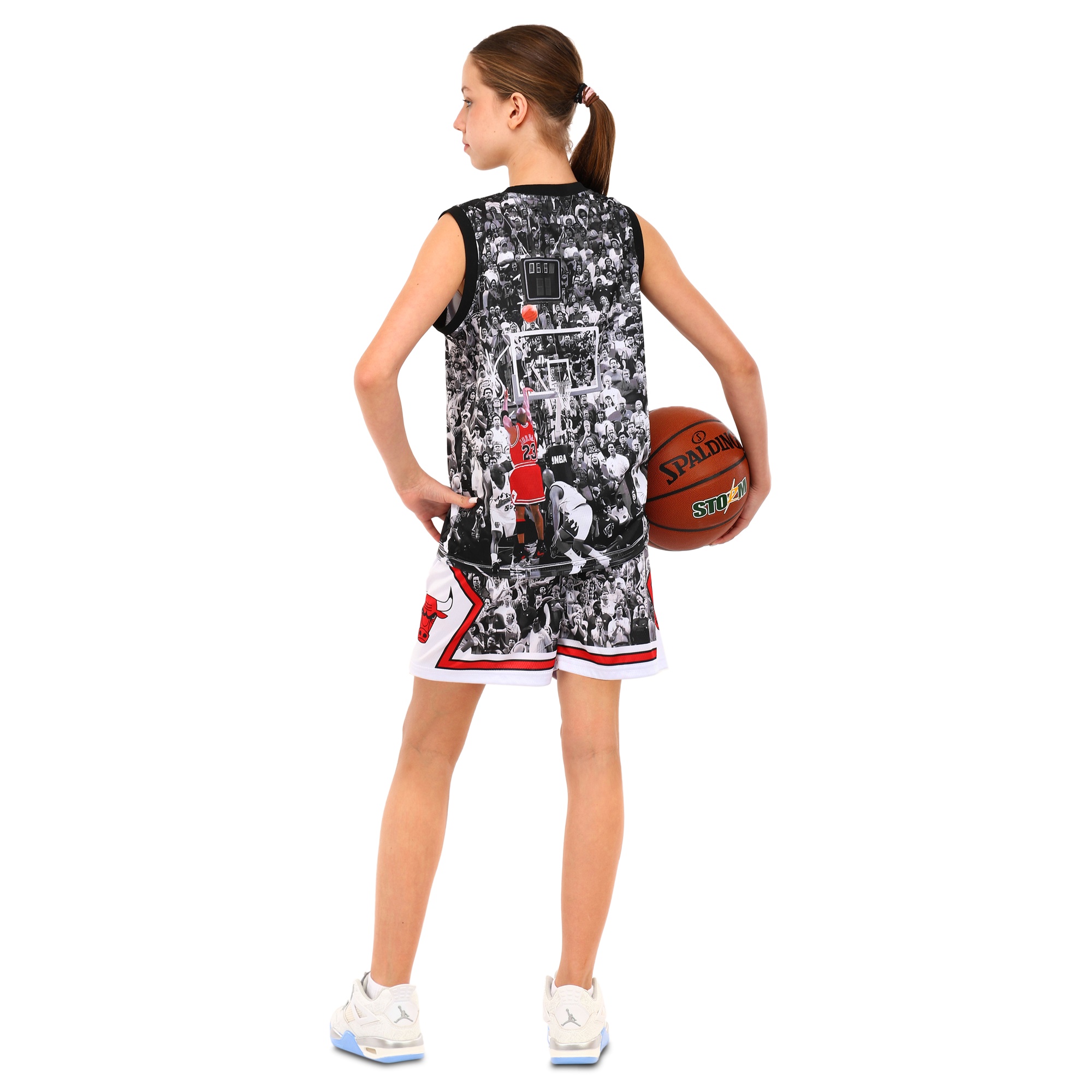 Комплект баскетбольної форми включає шорти і майку, виготовлені з поліестеру. І шорти, і майка мають вільний крій і забезпечують гравцеві можливість вільно рухатися по майданчику, здійснювати прискорення, різні кидки та інші рухи. Еластична гумка на шортах забезпечує надійну фіксацію на поясі, також в цій області присутній шнурок для регулювання по посадці. Майка має круглий виріз горловини, який дарує свободу руху. Дизайн форми дуже яскравий, на ній є символіка і назва популярної баскетбольної команди Chicago Bulls.