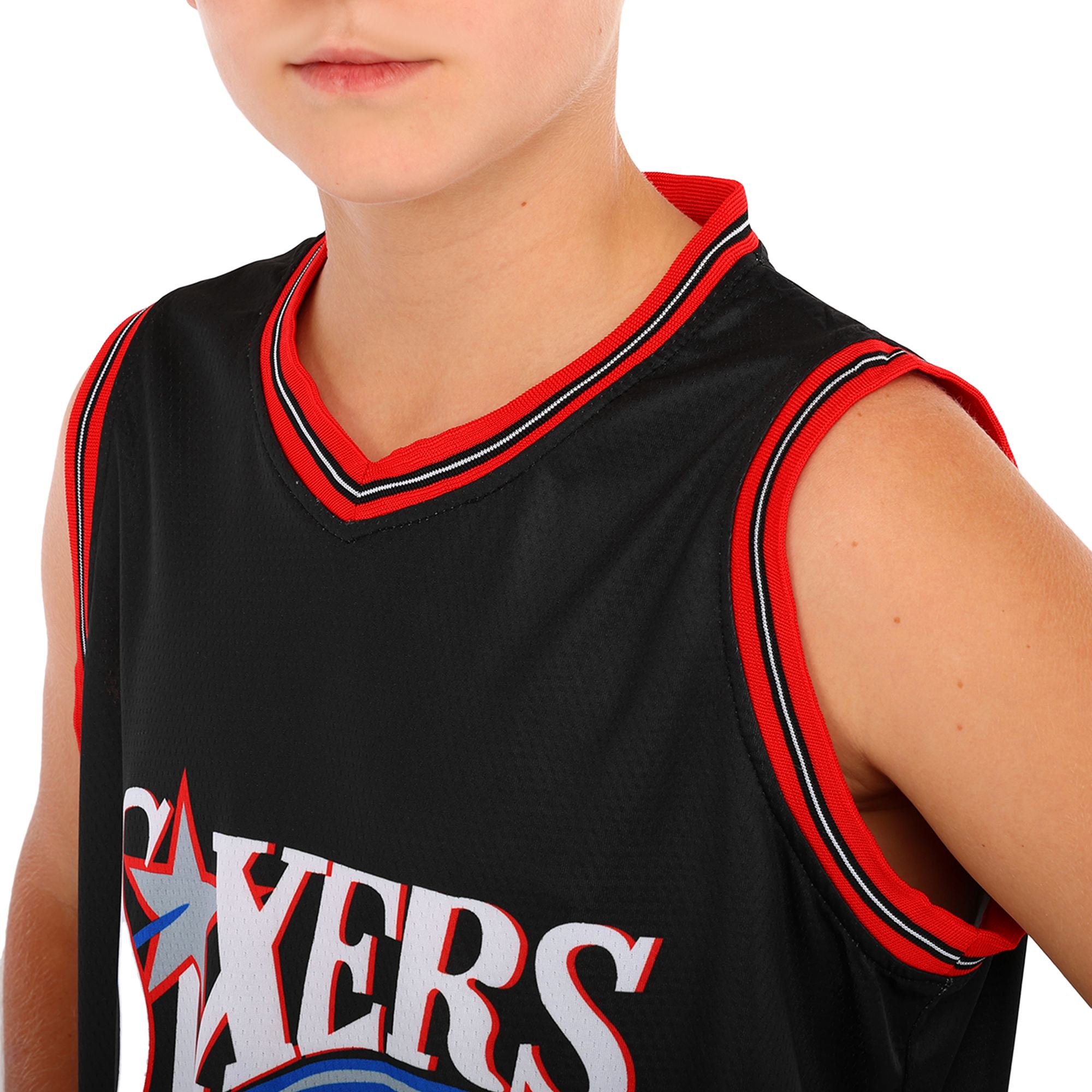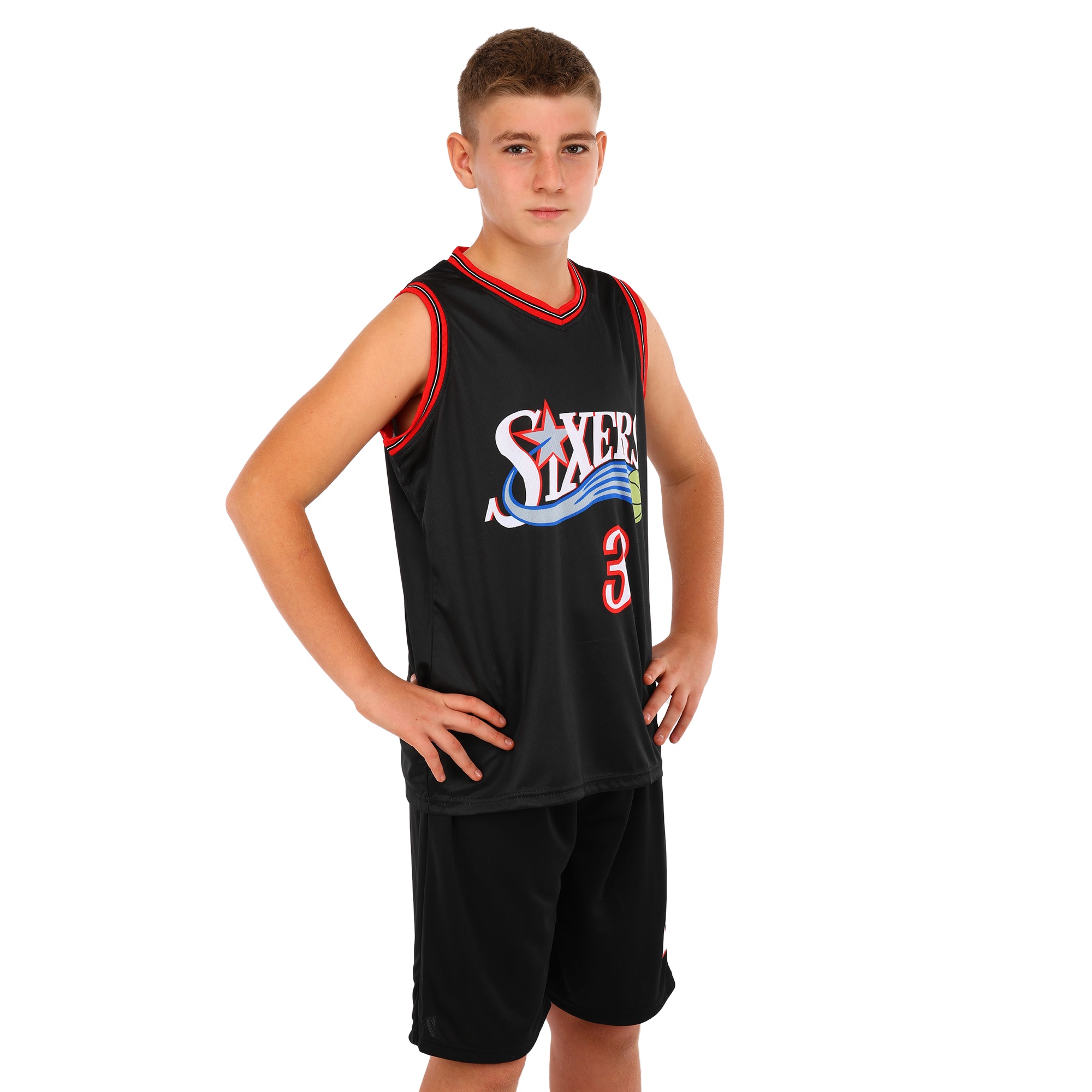 Баскетбольна форма з символікою клубу Sixers призначена для дітей. Вона виготовлена в чорно-червоному кольорі. Шорти і майка пошиті з поліестеру. Це синтетична тканина, яка відрізняється високою міцністю, стійкістю до вигоряння кольору і легкістю. Форма настільки легка, що дозволяє з комфортом тренуватися навіть у спекотну пору року. Вона не перешкоджає циркуляції повітря, як наслідок, - охолодженню тіла. Також тканина швидко відводить вологу від тіла і висихає, дозволяючи йому залишатися сухим протягом усього тренування. Вільний крій сприяє активним рухам і дозволяє спортсмену швидко пересуватися по майданчику, передавати м'яч і здійснювати кидки.