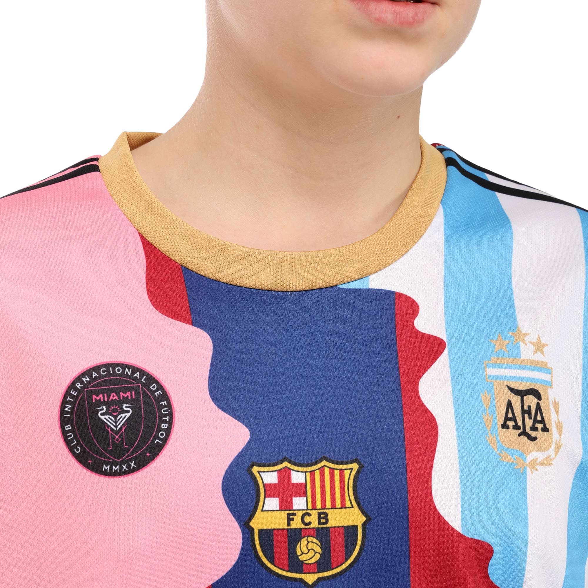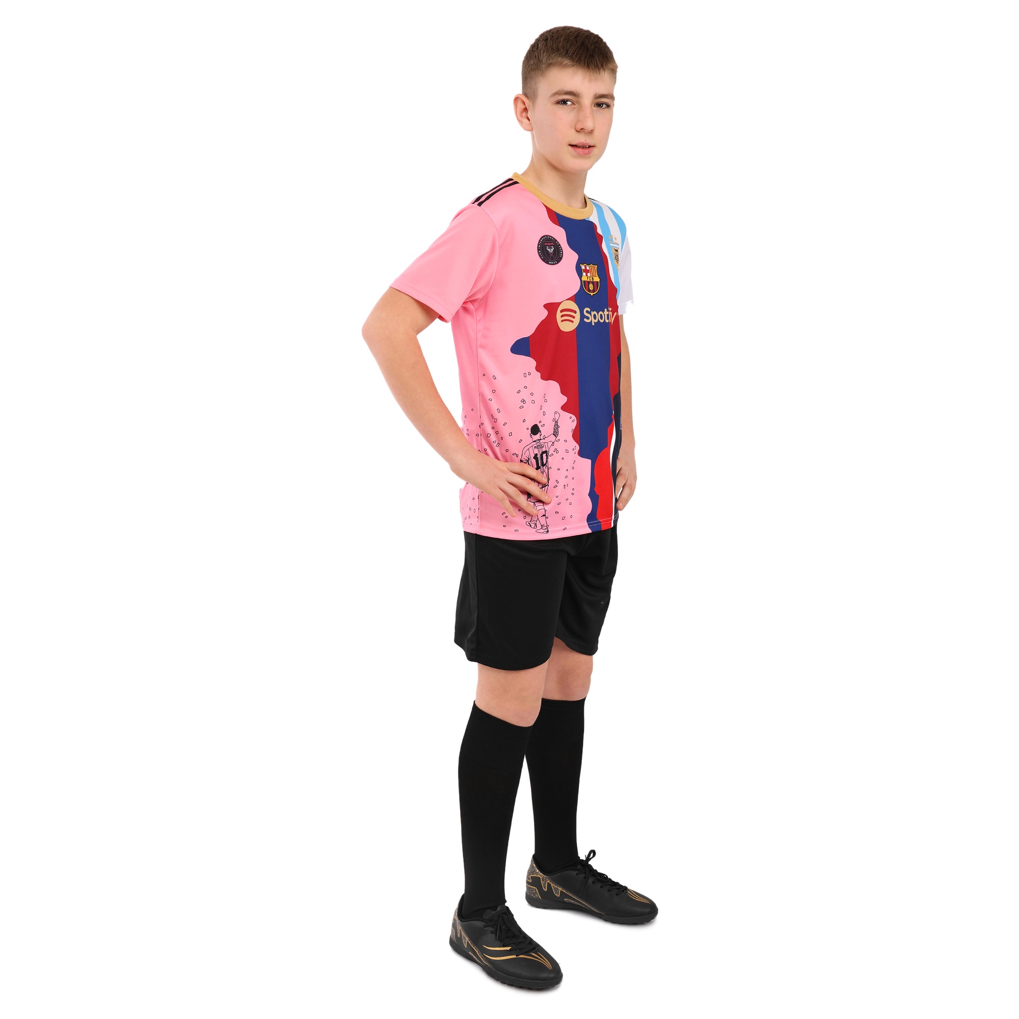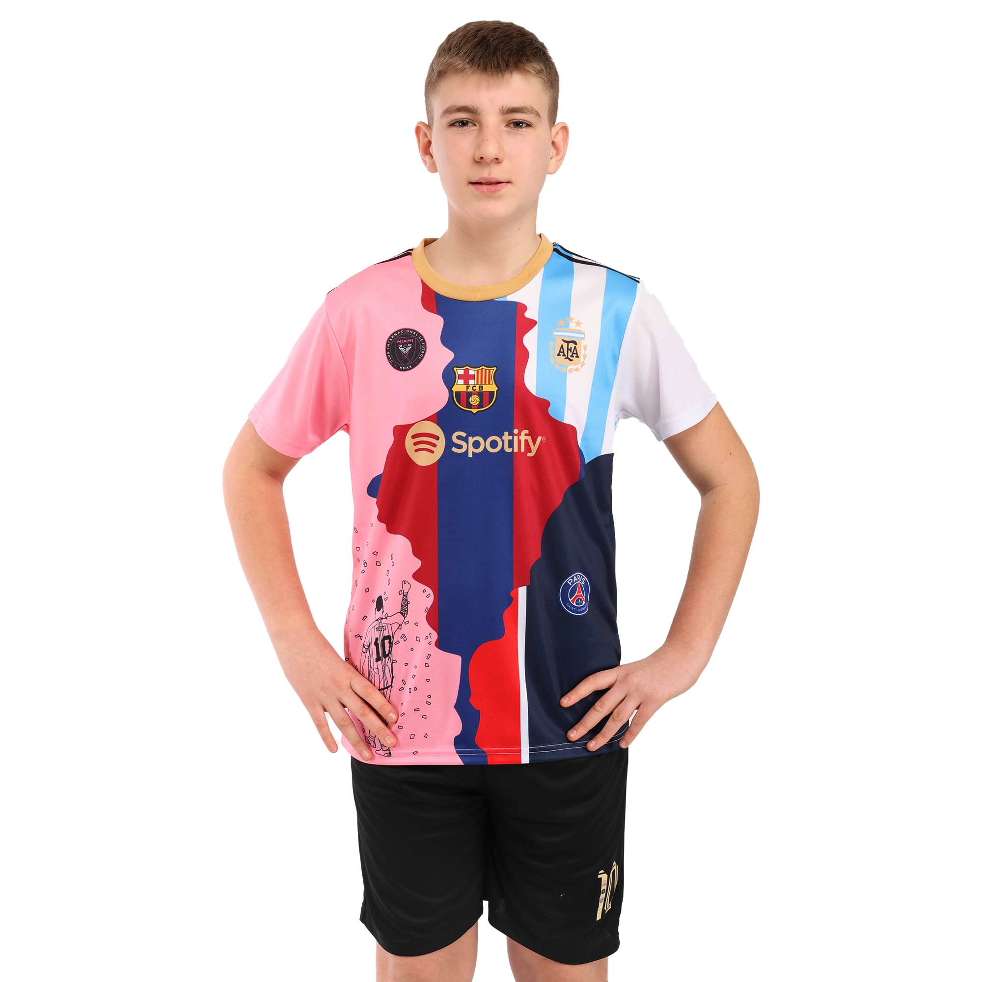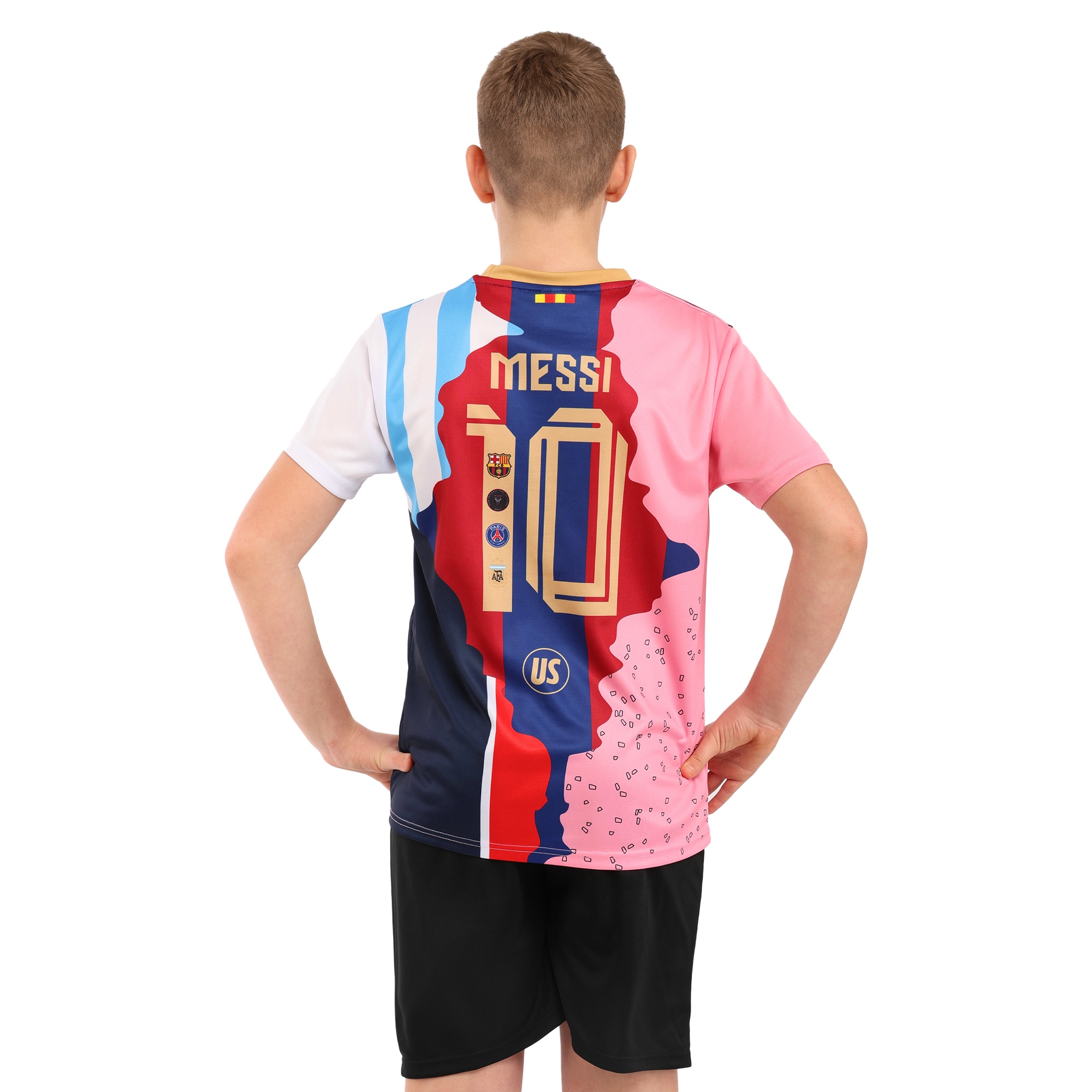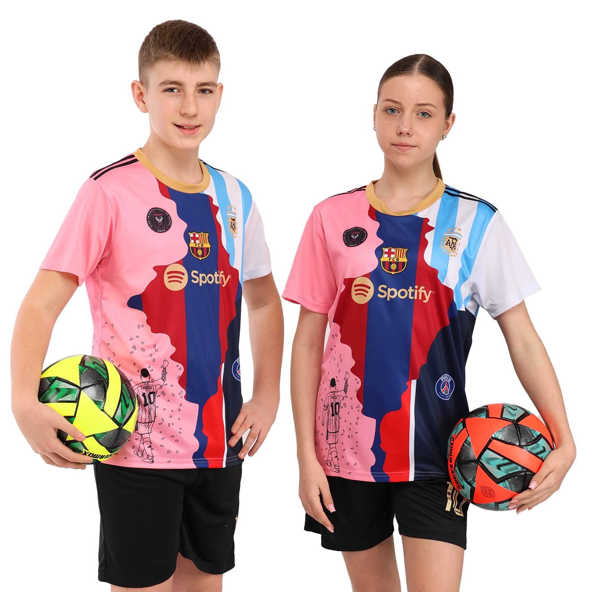 Якщо ваша дитина займається футболом або просто є фанатом Мессі, то найкращим подарунком для неї буде футбольна форма з номером і прізвищем цього футболіста на спині. Форма має яскравий дизайн. Футболка з коротким рукавом і круглим вирізом виконана в різних кольорах і має символіку клубів, в яких грав відомий спортсмен. Шорти виконані в темному кольорі, на них також присутній номер футболіста. І футболка, і шорти виготовлені з поліестеру. Ця тканина дозволяє повітрю легко проникати до тіла, що сприяє природній терморегуляції. При цьому поліестер швидко висихає і відводить вологу від тіла.