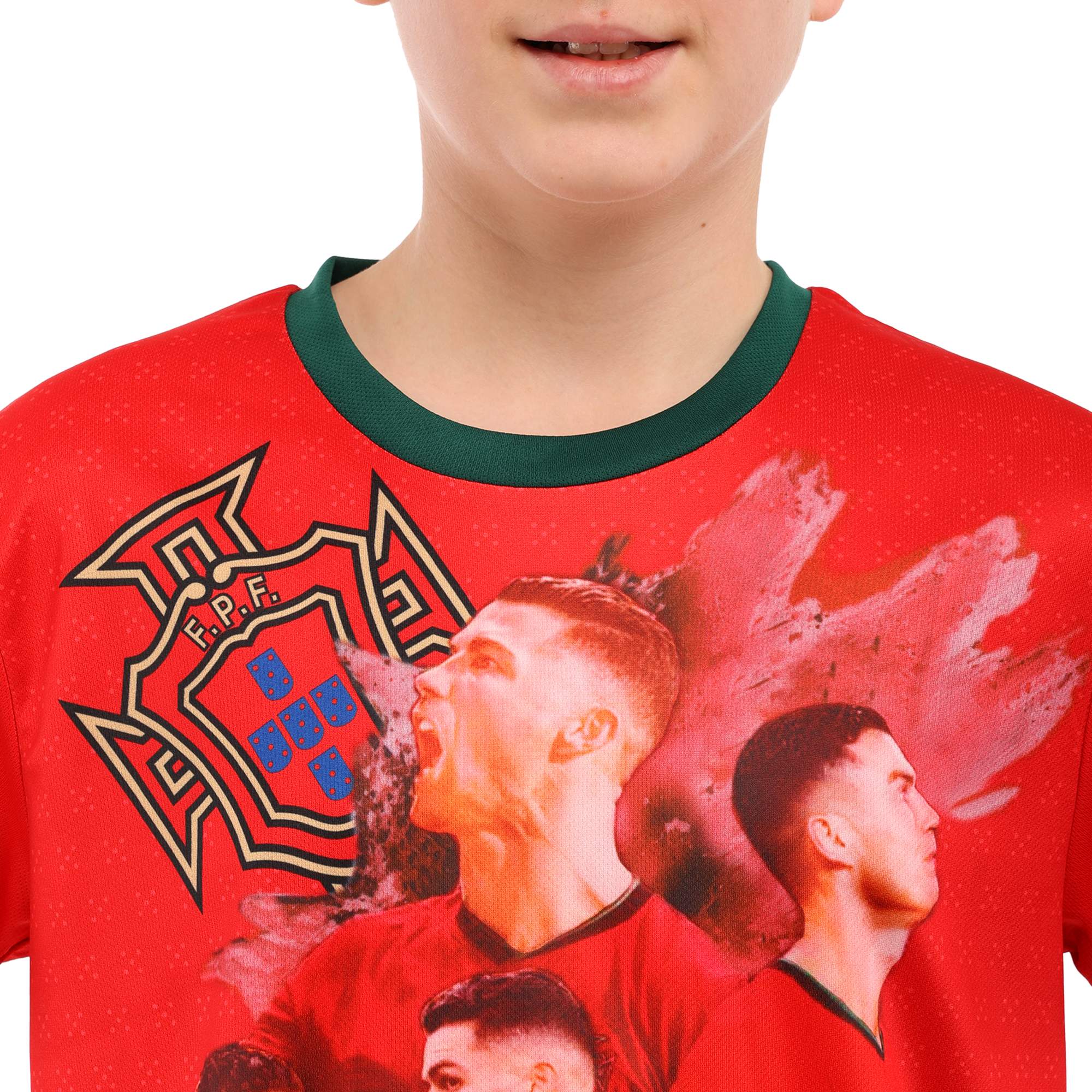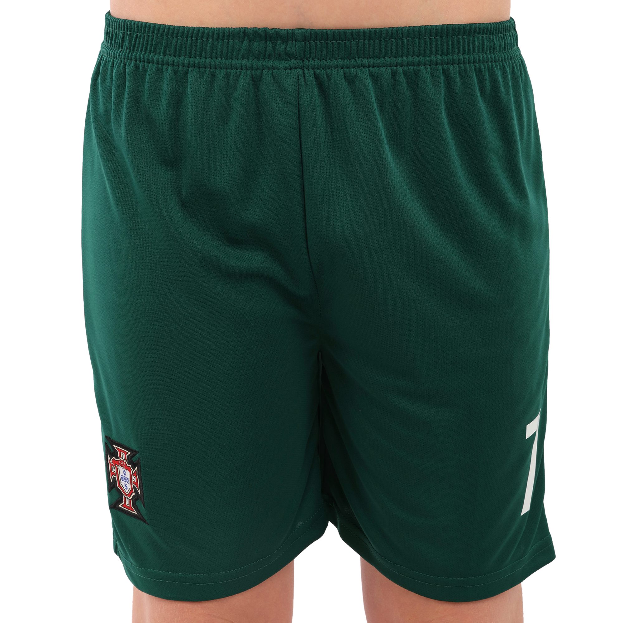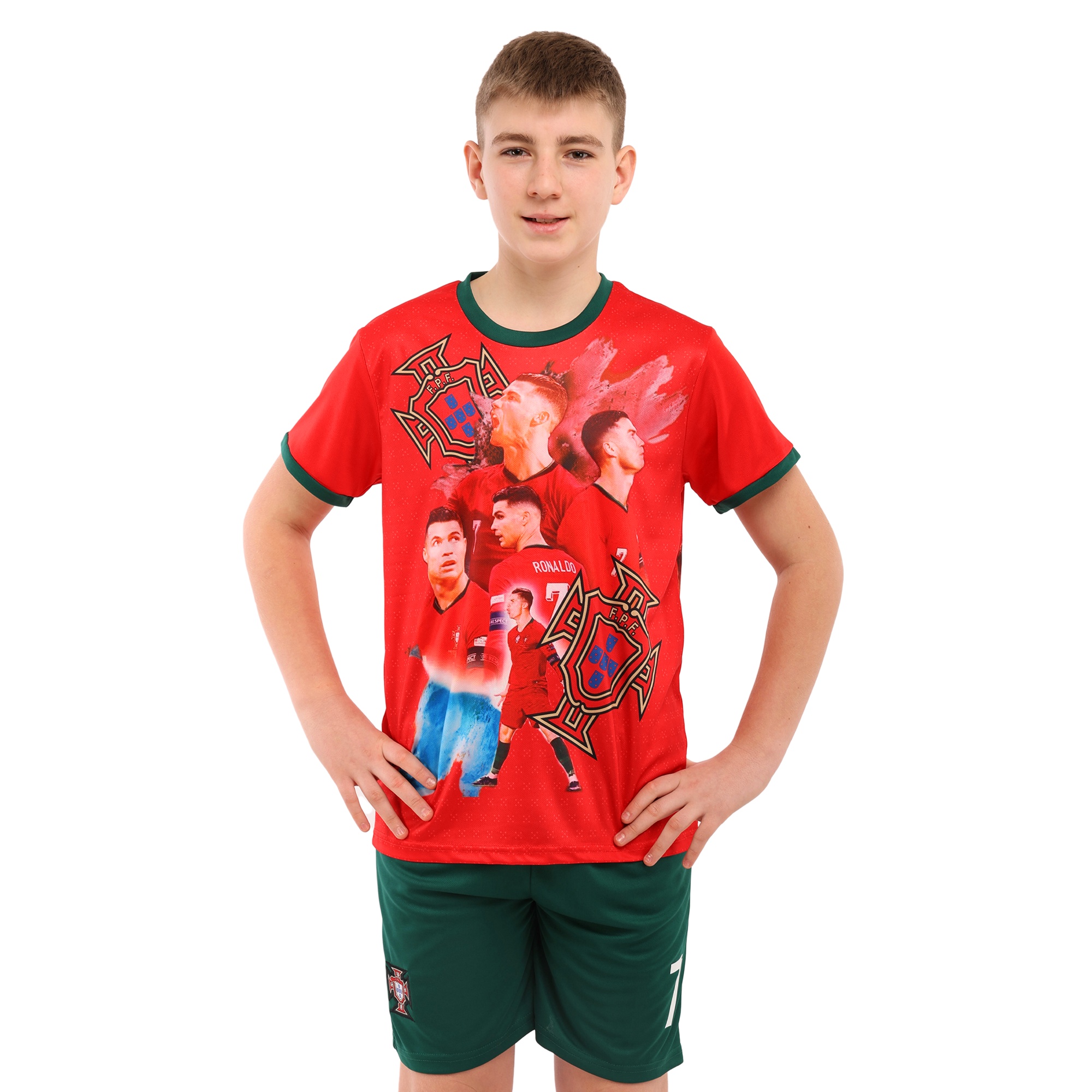 Футболка має прямий крій зі зручною круглою горловиною і коротким рукавом. Спереду і ззаду на ній зображений сам футболіст і символ Португальської федерації футболу. На спині розташований ігровий номер - 7. Шорти вільного крою виконані в темному кольорі, на них також є номер і символіка.