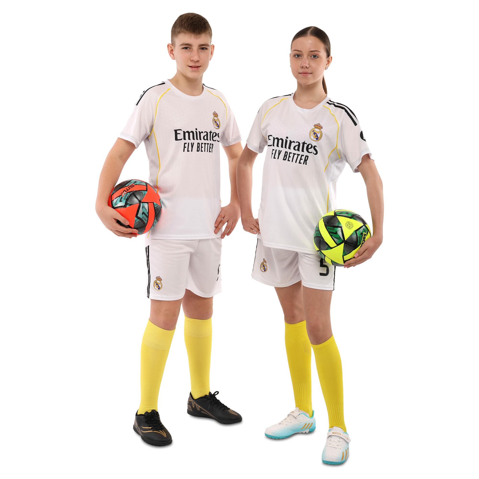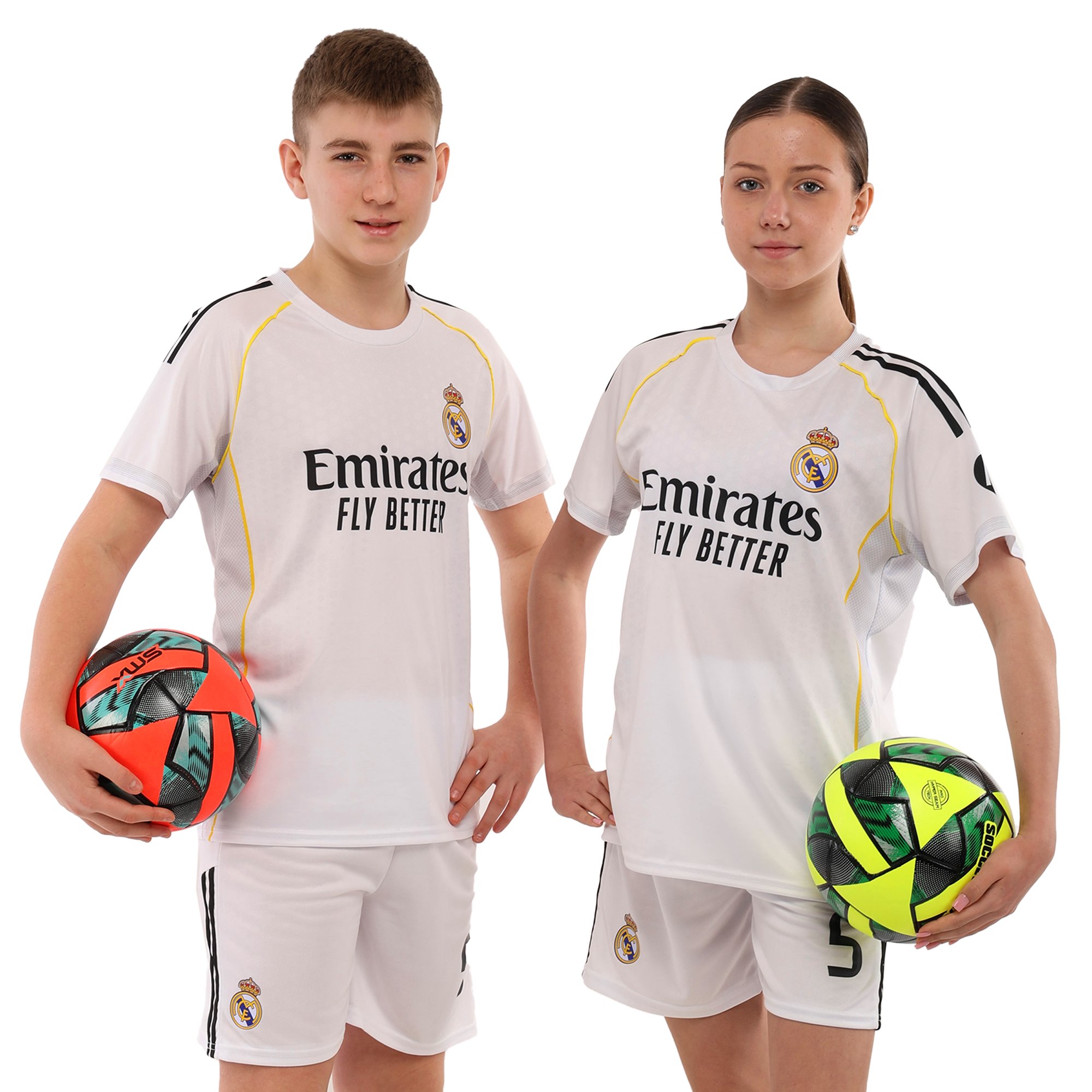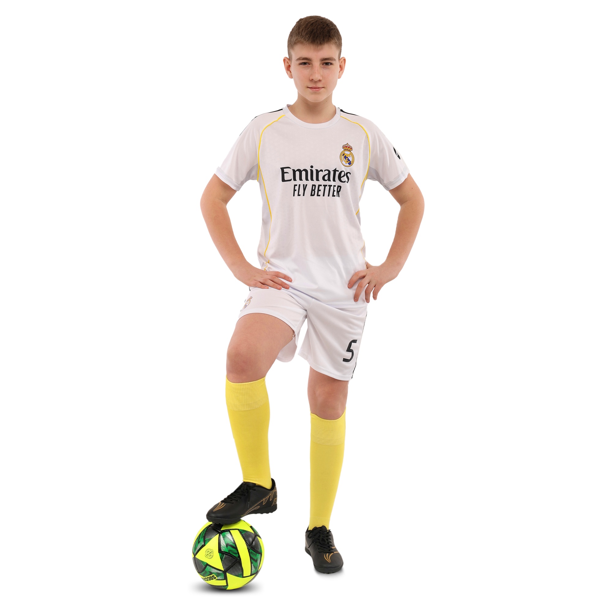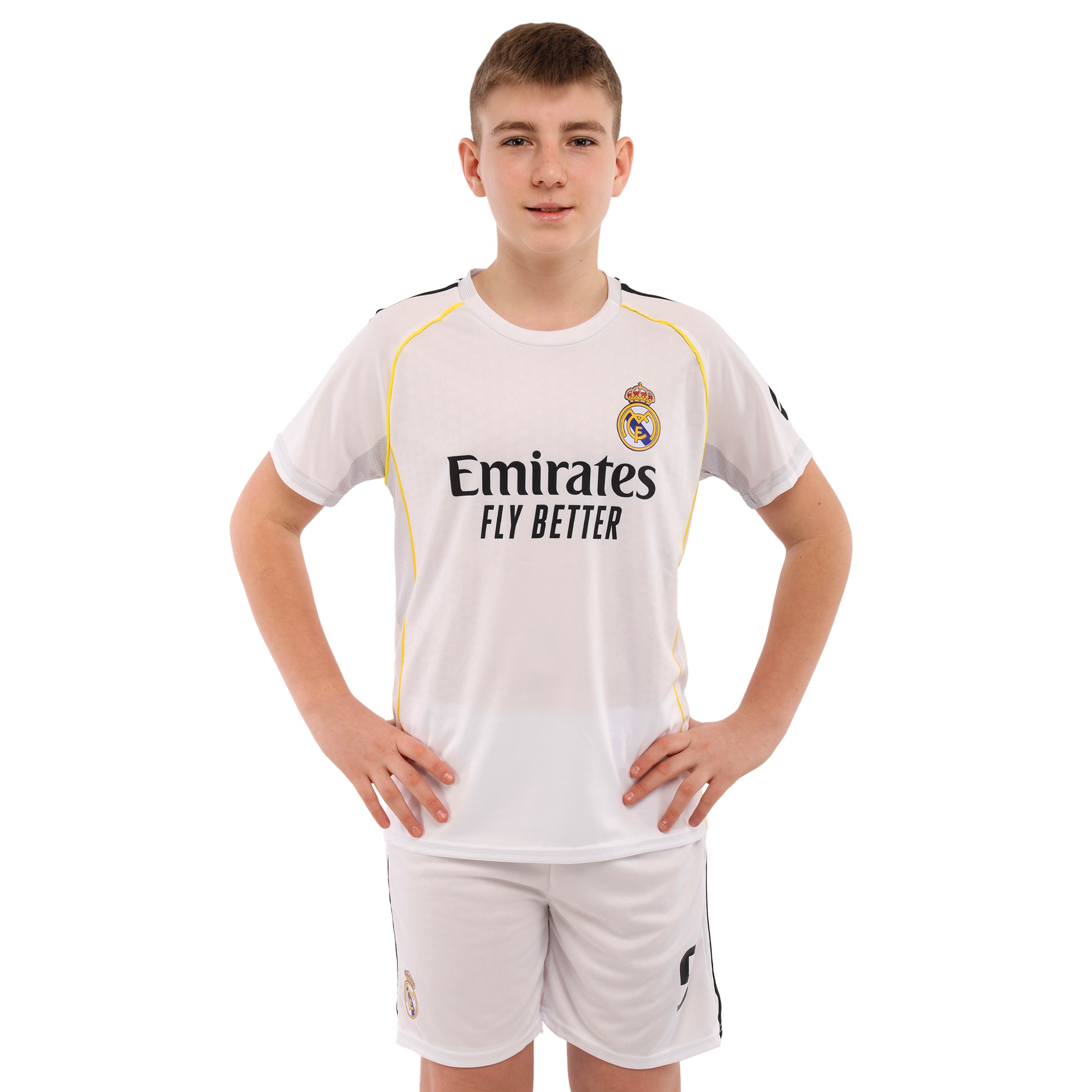 - Комплект повторює дизайн домашньої футбольної форми “Real Madrid”.