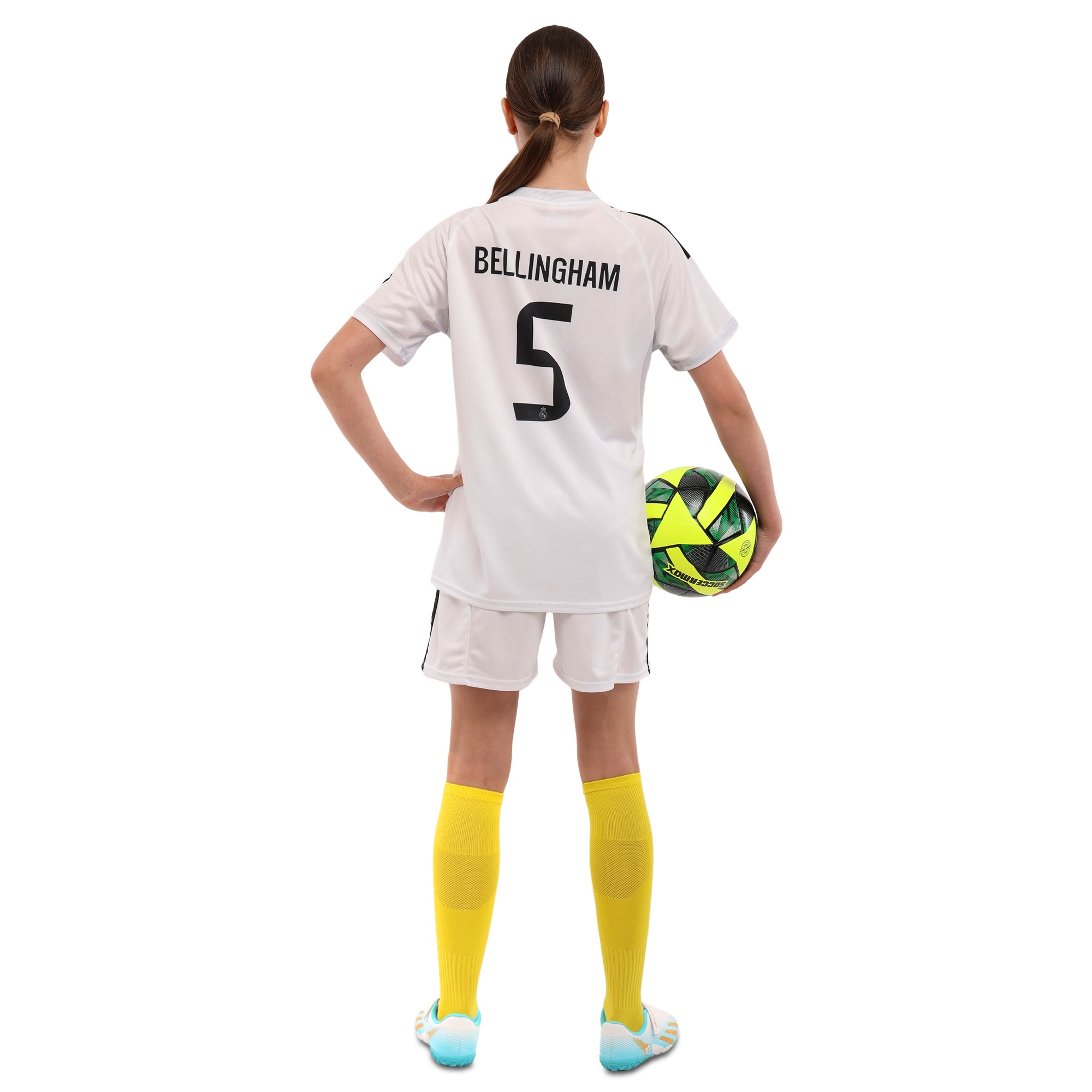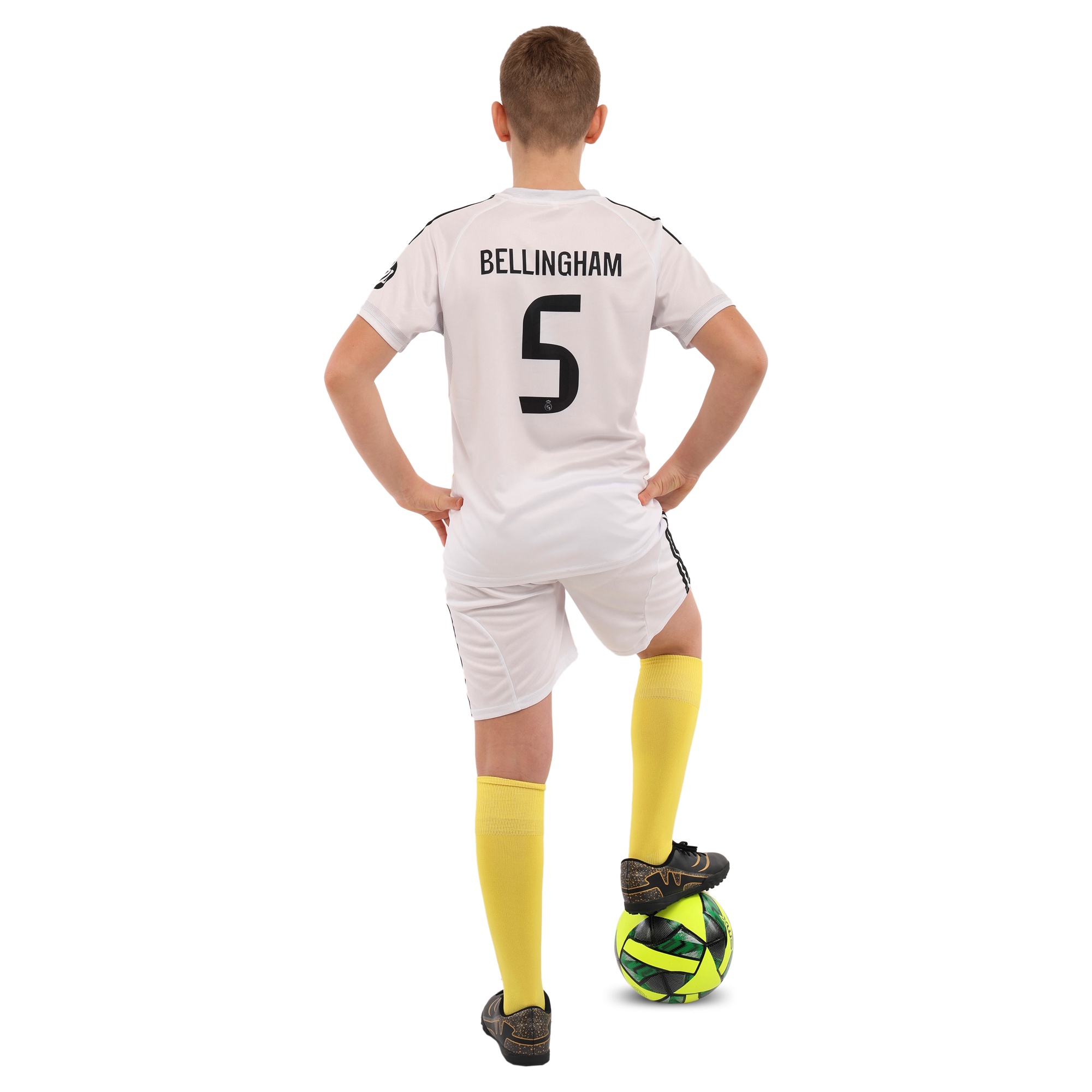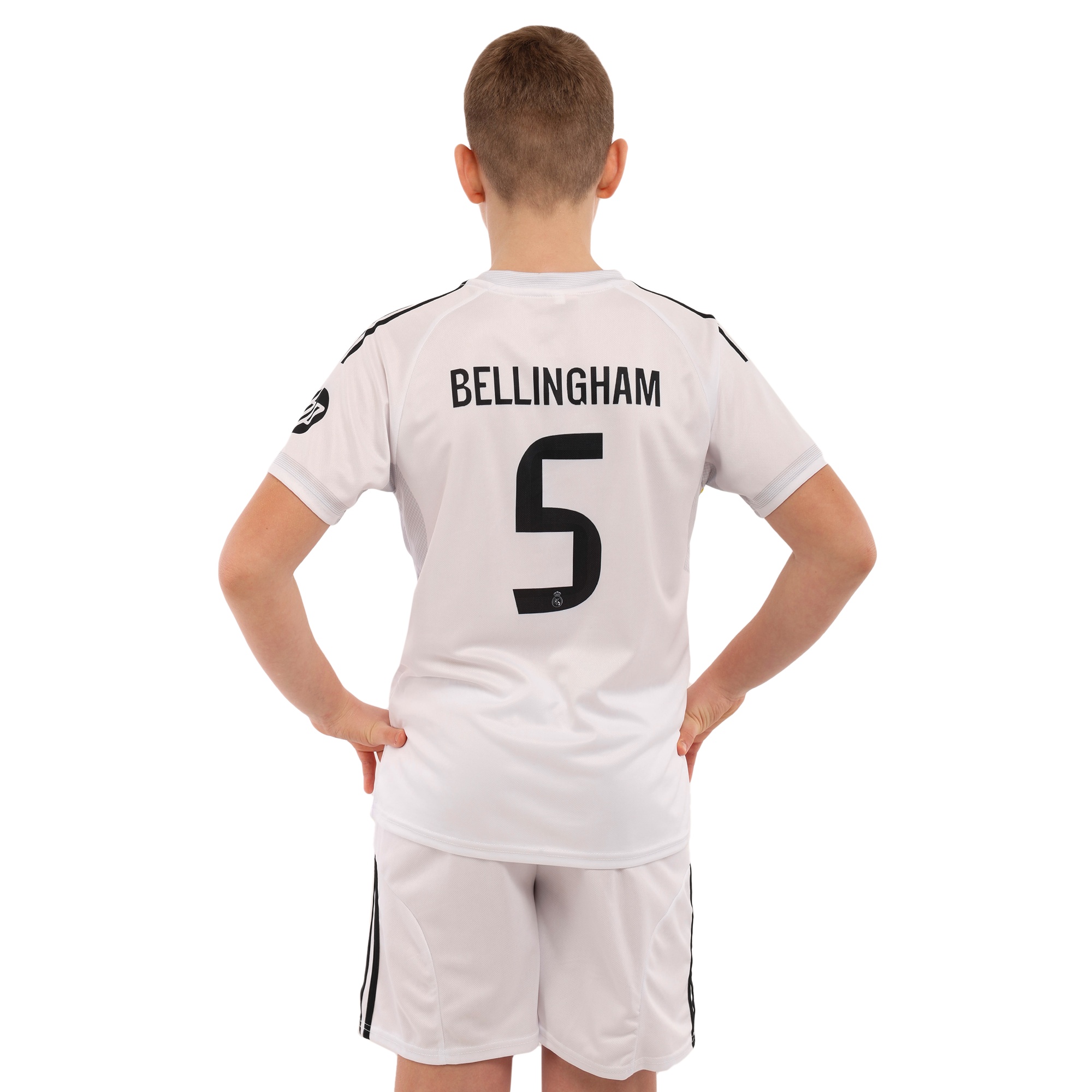 Дитяча футбольна форма виконана в традиційному дизайні клубу “Real Madrid” і призначена для безпечних і продуктивних тренувань та ігор. Комплект складається з футболки та шортів, прикрашених легендарним логотипом і принтом «BELLINGHAM 5».