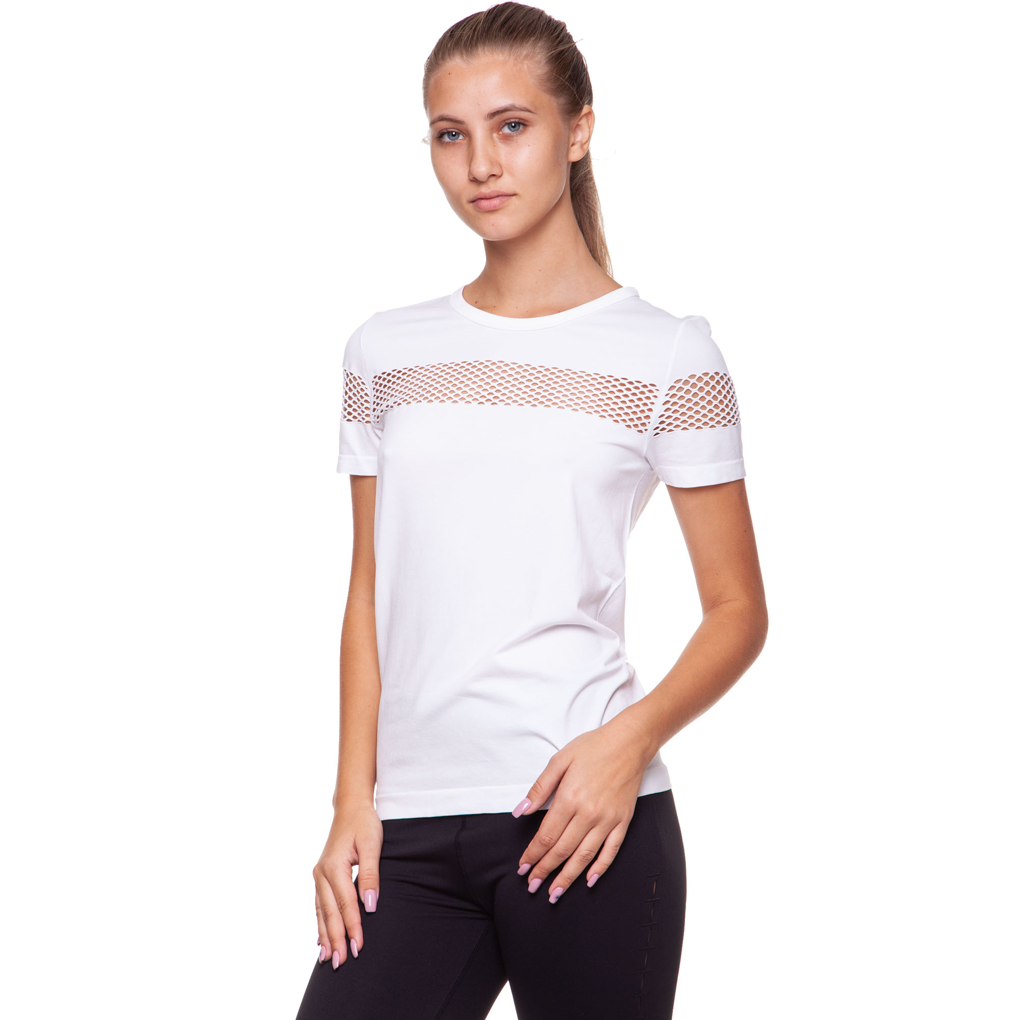 Жіноча футболка має привабливий дизайн і виконана з синтетичного матеріалу. Використання поліестеру в якості основного матеріалу дозволяє зробити футболку легкою і міцною, а також домогтися приголомшливої повітропроникності. Футболка з синтетичного матеріалу якнайкраще підходить для занять спортом, адже вона не вбирає неприємні запахи, легко відпирається і не потребує прасування. Тканина швидко відводить від тіла вологу, дозволяючи йому залишатися сухим протягом усього тренування, незалежно від його інтенсивності. Жіноча футболка має приталений крій. Короткі рукави також сприяють охолодженню тіла під час занять в жарку пору року.