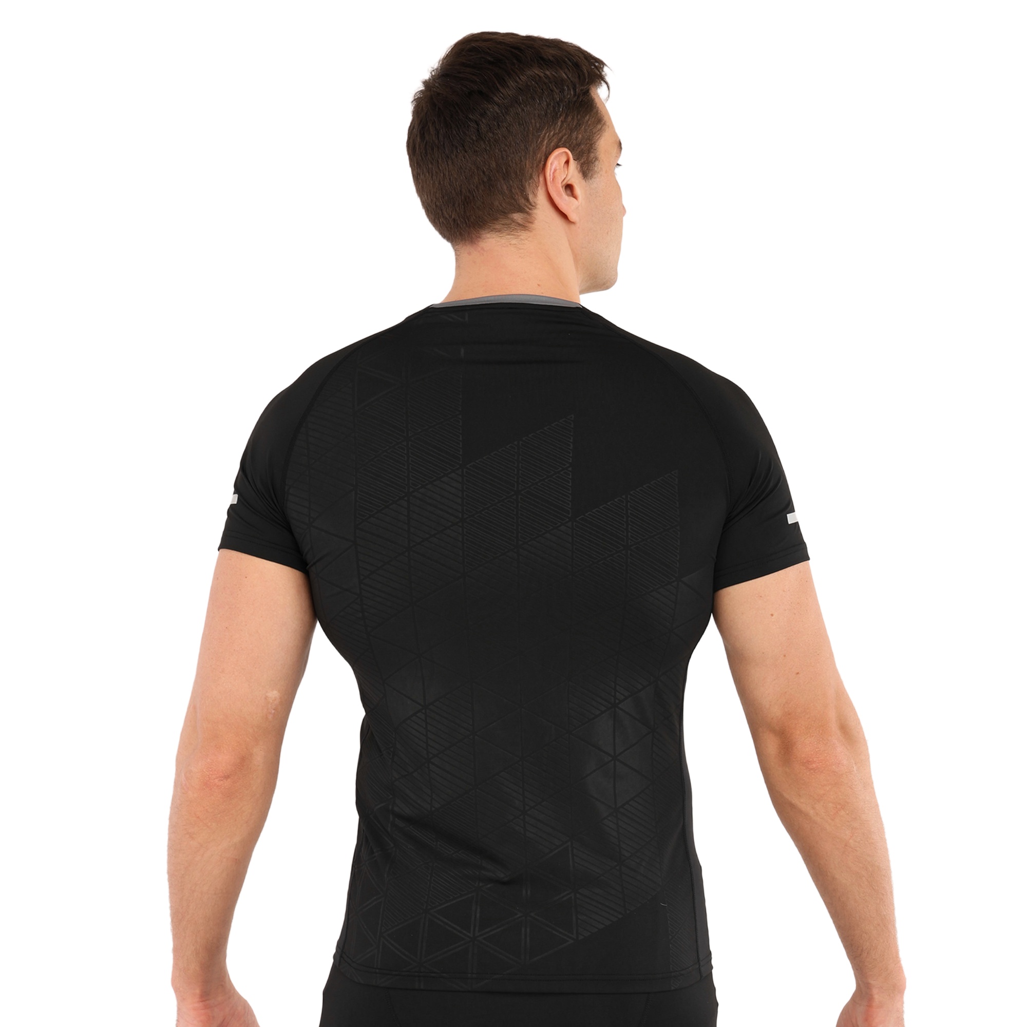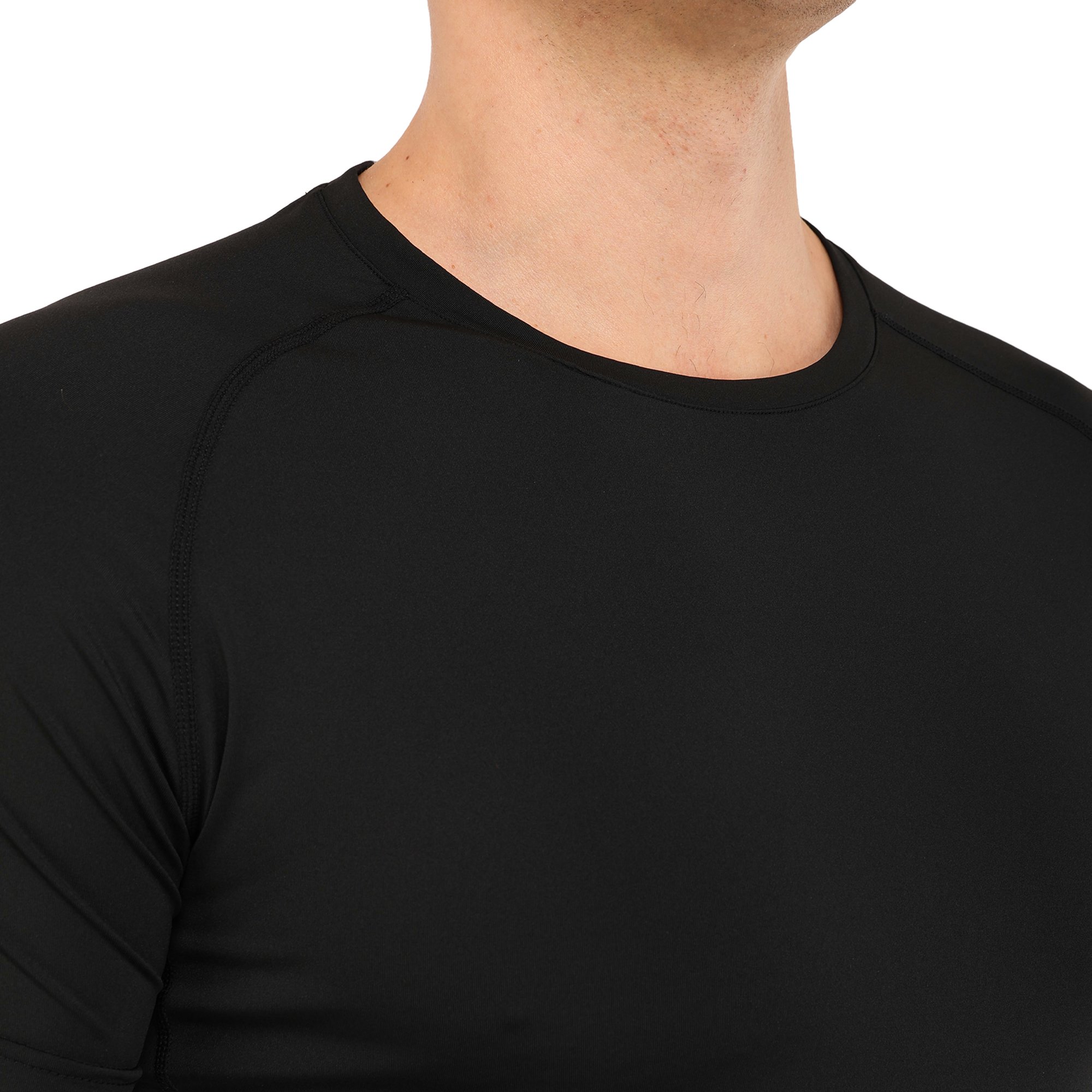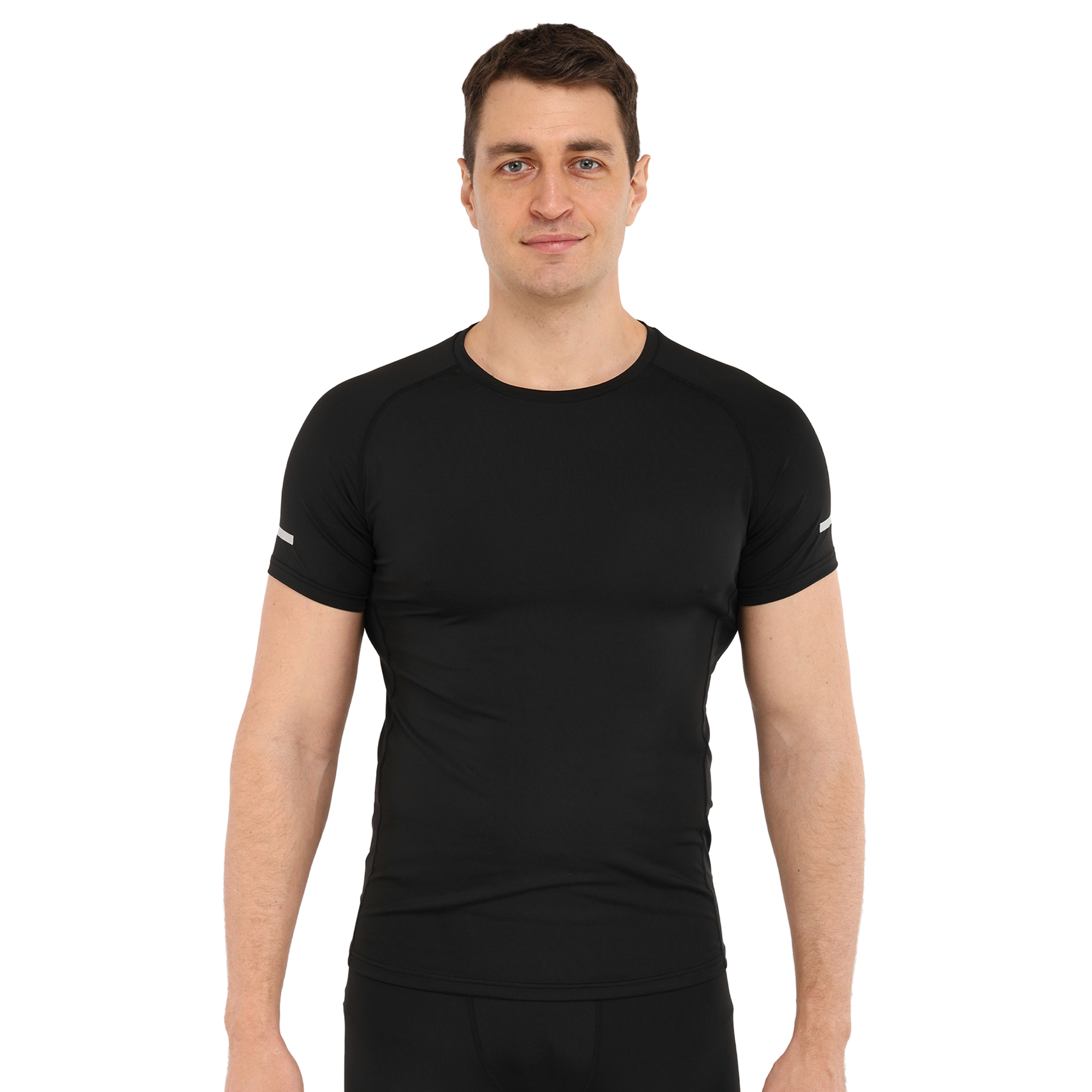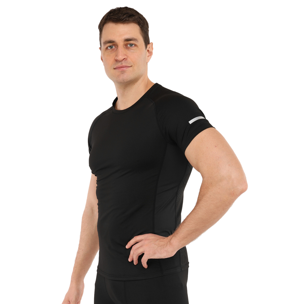 Компресійна футболка призначена для активних занять спортом і може використовуватися під час тренувань у тренажерному залі, для бігу, кросфіту або єдиноборств, а також підійде для ігрових видів спорту. Футболка призначена для дорослих чоловіків, вона виконана в чорному кольорі та має однотонний дизайн. Завдяки її еластичності ви можете виконувати будь-які рухи руками або тулубом.