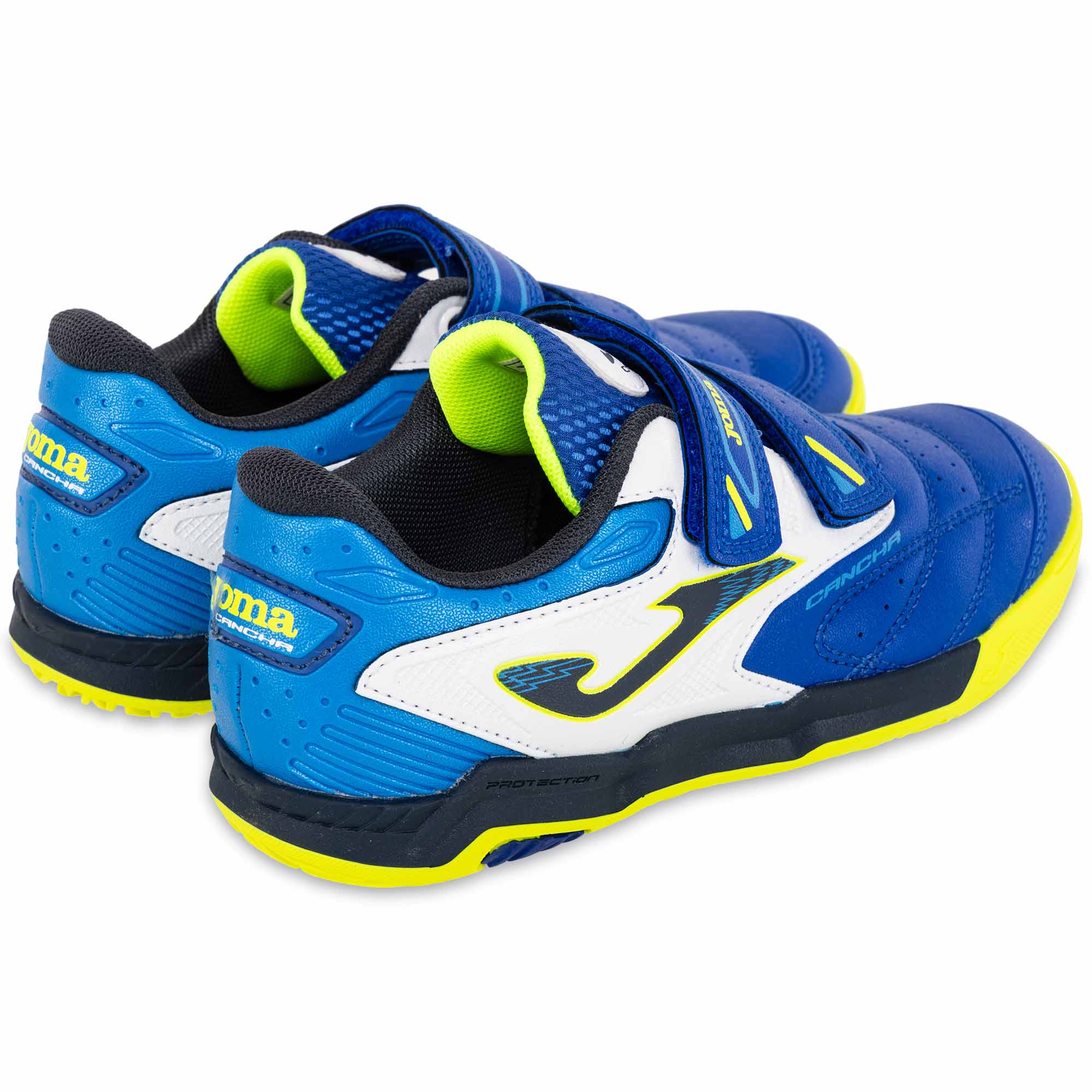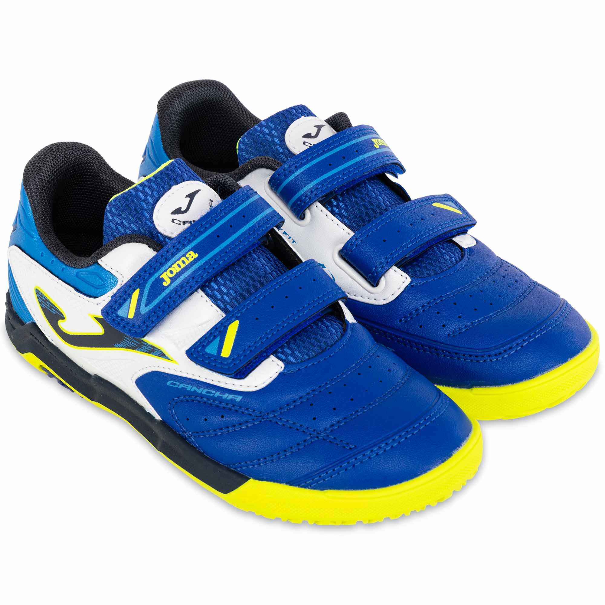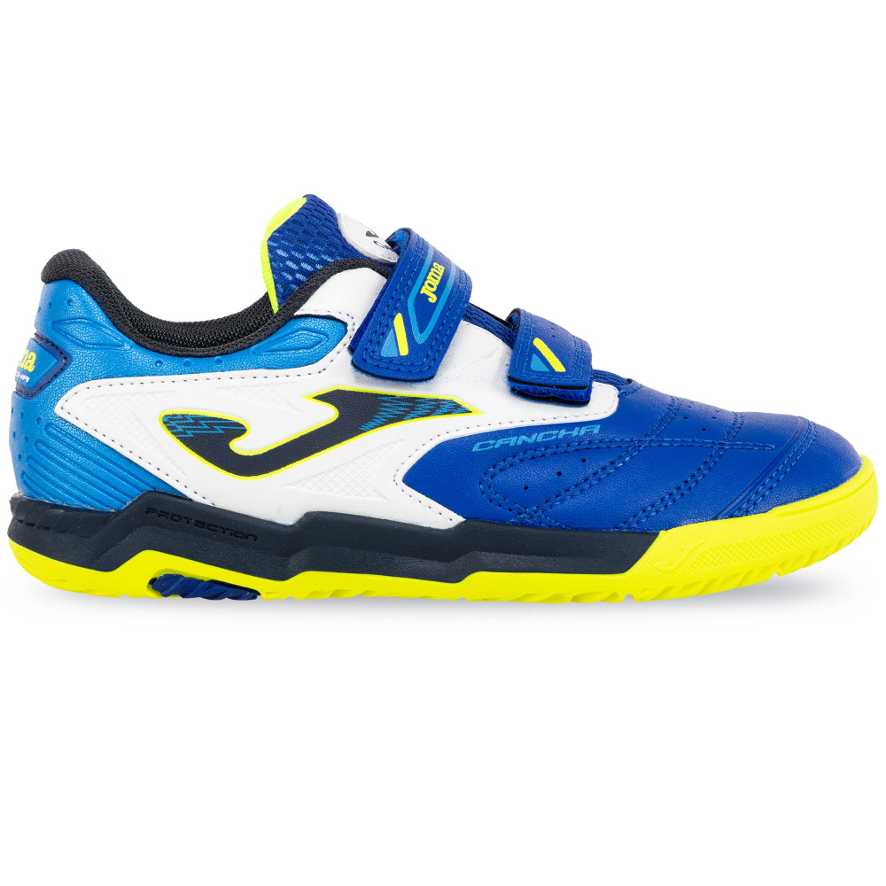 Дитяче взуття для міні-футболу Joma CANCHA виготовлене зі штучної шкіри та має яскравий дизайн. На поверхні взуття є вставки з дихаючої сітки VTS, яка забезпечує приплив свіжого повітря до ніг і терморегуляцію. Це дозволяє комфортно займатися в будь-який час року, незалежно від погодних умов і температури навколишнього середовища. Для фіксації на ногах і підгонки за розміром використовуються липучки. Це дозволяє навіть наймолодшим футболістам самостійно одягати і знімати таке взуття. Підошва виготовлена з високоякісної і довговічної гуми DURABILITY. Гума стійка до стирання, показує відмінне зчеплення з гладкими покриттями в залі або паркетом. Носок Protection забезпечує захист і запобігає передчасному зносу взуття.