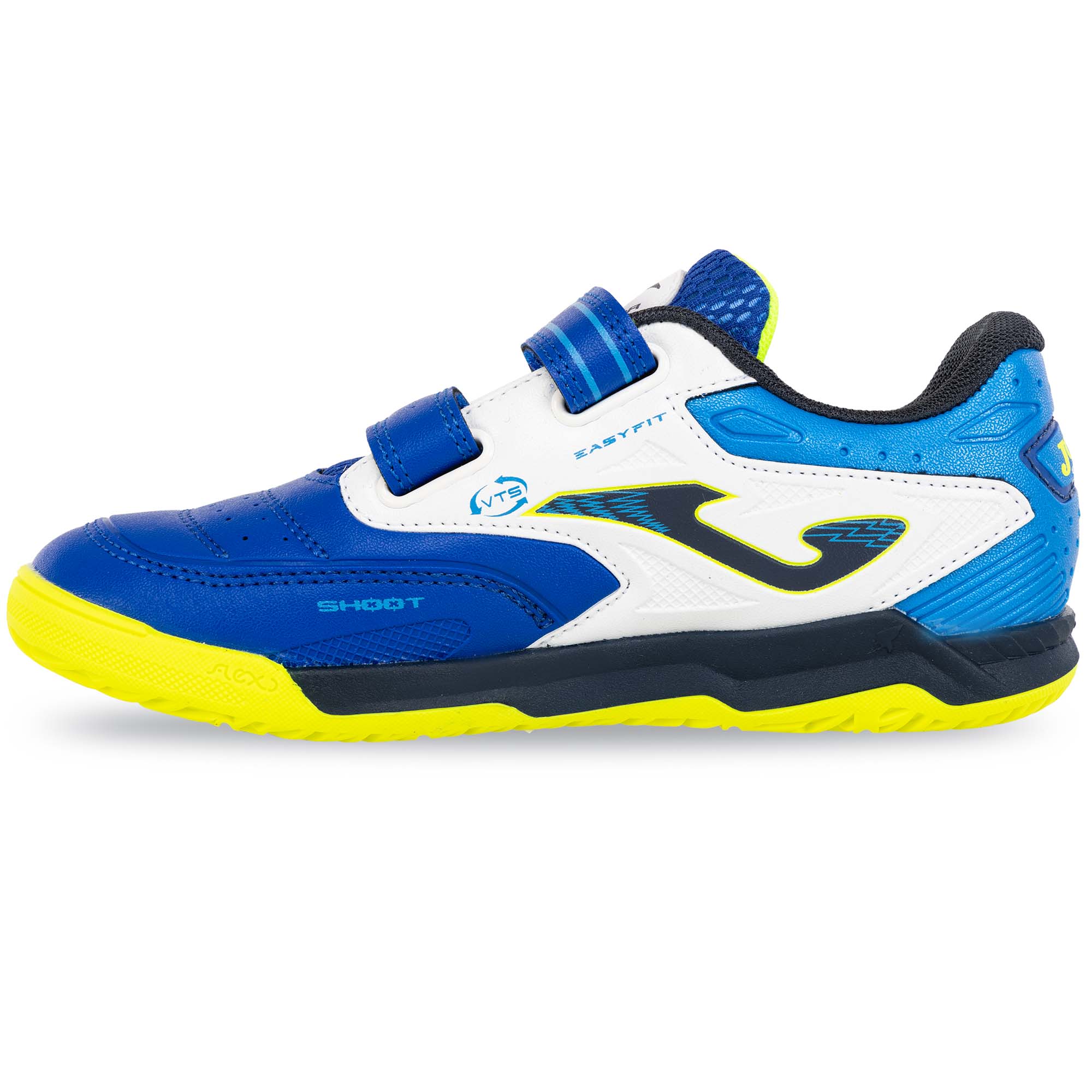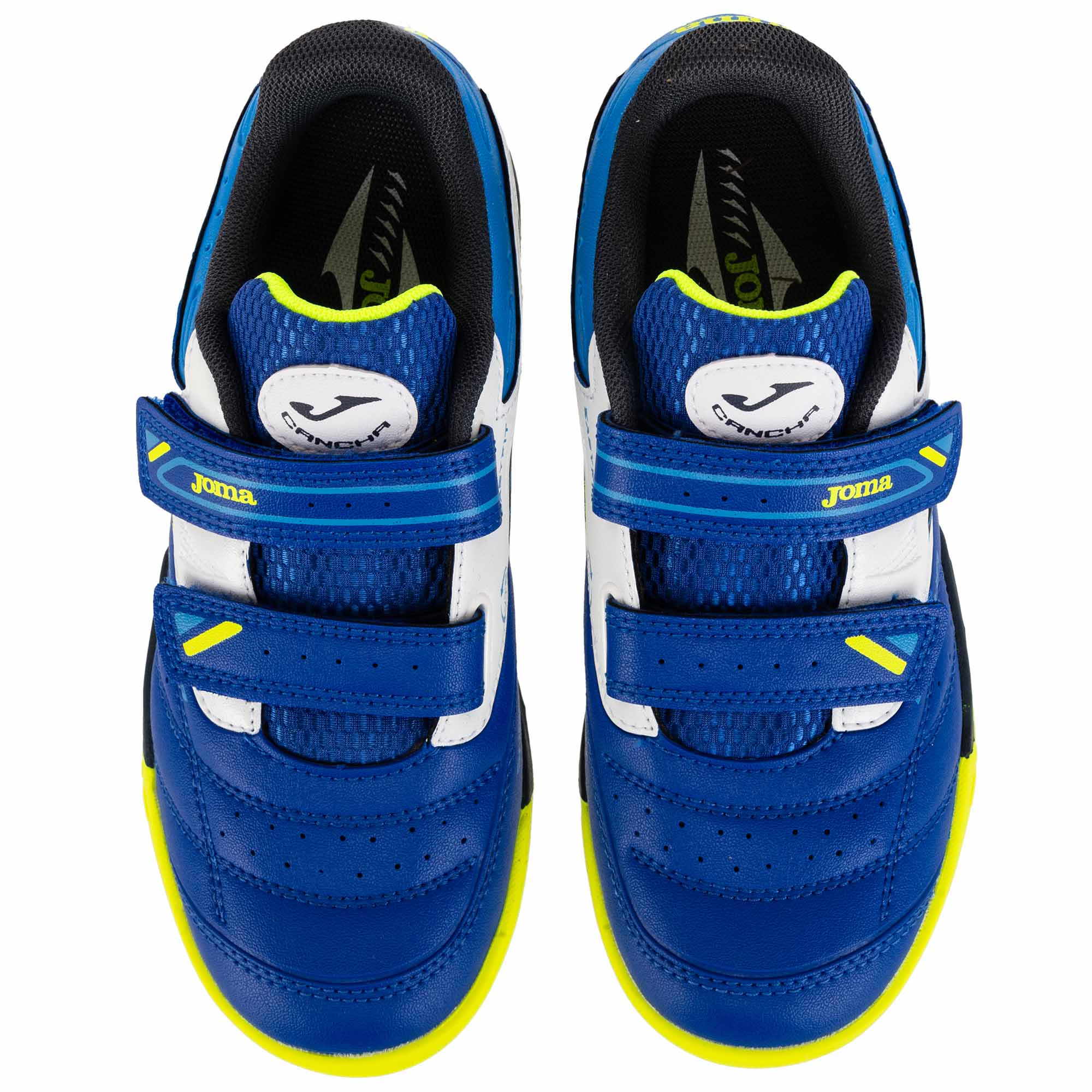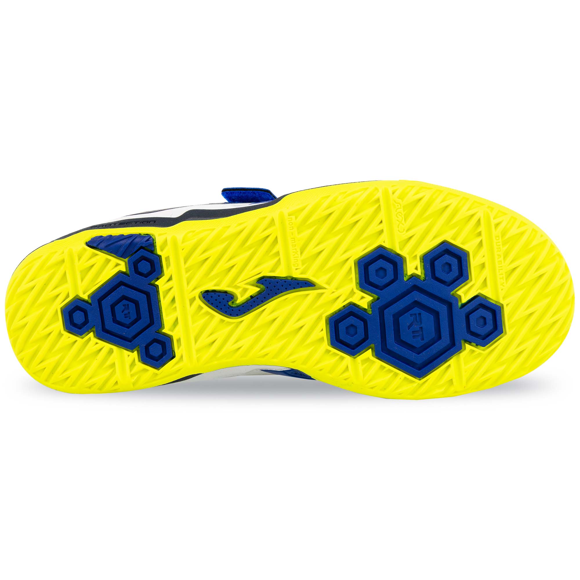 Дитяче взуття для міні-футболу Joma CANCHA виготовлене зі штучної шкіри та має яскравий дизайн. На поверхні взуття є вставки з дихаючої сітки VTS, яка забезпечує приплив свіжого повітря до ніг і терморегуляцію. Це дозволяє комфортно займатися в будь-який час року, незалежно від погодних умов і температури навколишнього середовища. Для фіксації на ногах і підгонки за розміром використовуються липучки. Це дозволяє навіть наймолодшим футболістам самостійно одягати і знімати таке взуття. Підошва виготовлена з високоякісної і довговічної гуми DURABILITY. Гума стійка до стирання, показує відмінне зчеплення з гладкими покриттями в залі або паркетом. Носок Protection забезпечує захист і запобігає передчасному зносу взуття.