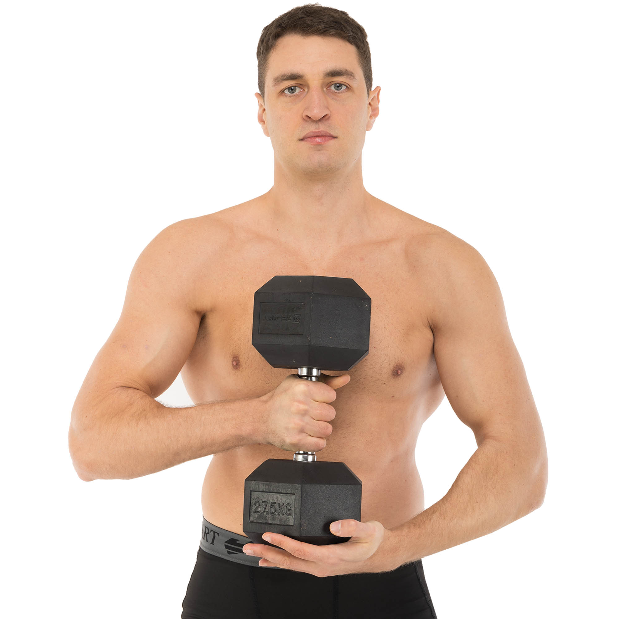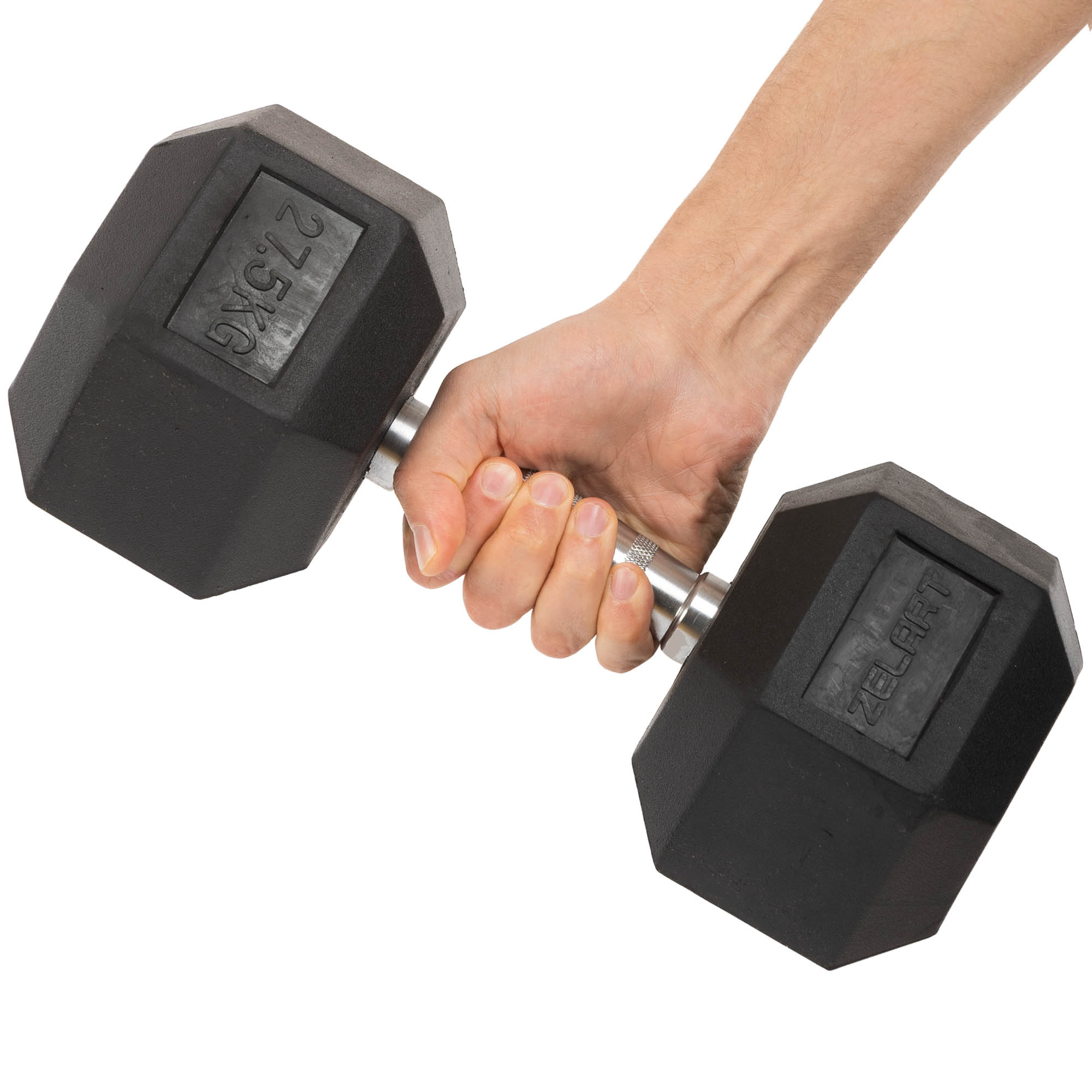 Міцна та надійна гантель дає змогу виконувати тренування безпечно та з комфортом. Гантель із голівками гексагональної форми, які вкриті гумою, не пошкоджує підлогове покриття та не ламається від удару чи падіння. Гантель виготовлена з металу, проте вона не видає дзвінкого металевого звуку під час удару об поверхню або інший інвентар, оскільки її головки вкриті шаром гуми. У разі падіння на підлогу гума амортизує удар і не дозволяє інвентарю пошкодити підлогове покриття. Гриф вкритий насічками, які сприяють більш надійному хвату, і захищений від корозії за допомогою хромування. Вага гантелі становить 27,5 кг.