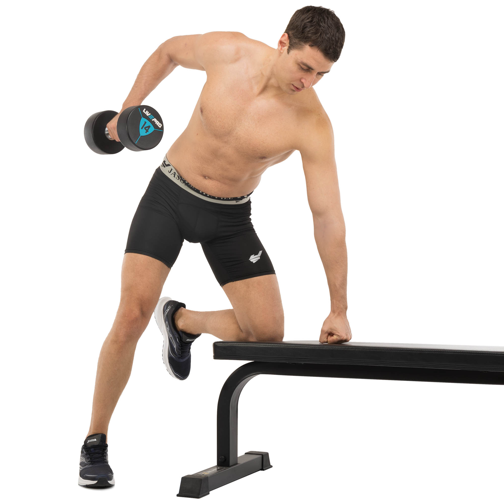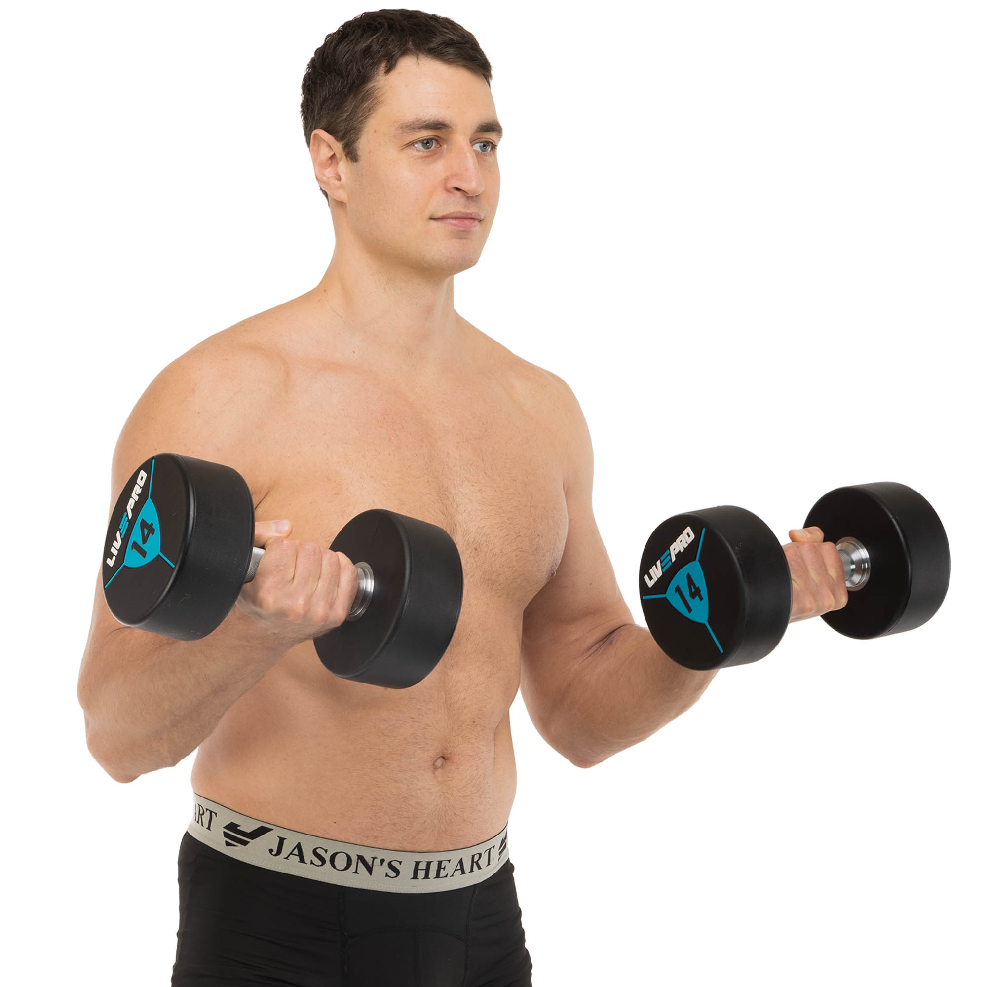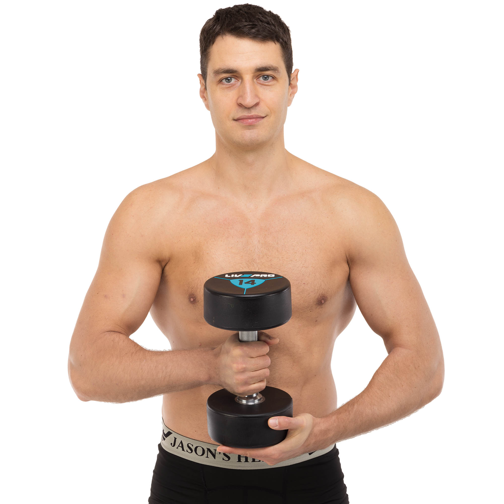 Гантелі від бренду LiveUp мають суцільну конструкцію і фіксовану вагу. Вони виготовлені зі сталі і покриті поліуретановим покриттям на дисках. Завдяки наявності поліуретанового покриття гантелі не видають зайвого шуму в процесі використання, а також у разі падіння не пошкоджують підлогове покриття в залі та інший інвентар. У комплекті дві гантелі однакової ваги і розміру.