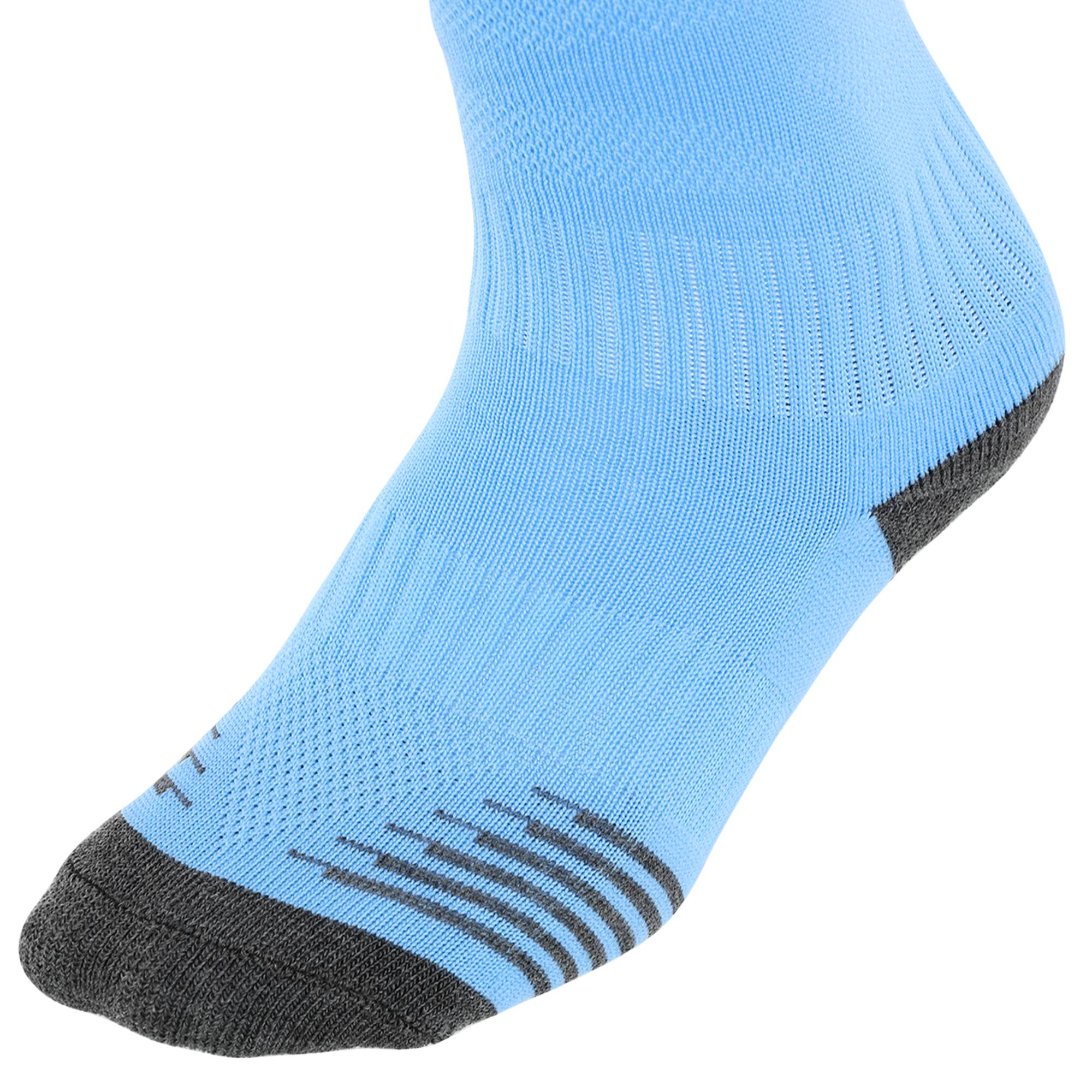 Гетри для дітей мають яскравий спортивний дизайн і прикрашені символікою футбольного клубу Manchester City. Ці гетри стануть додатковою мотивацією для дитини ще більше тренуватися і розвиватися в спортивному напрямку. Крім того, екіпірування несе практичну користь, а саме надає компресійний ефект на м'язи ніг, утримує щитки і дозволяє уникати натирання шкіри. Екіпіровку можна легко поєднувати з кольорами футбольної форми і використовувати під час тренувань або аматорських матчів. Вона відрізняється високою стійкістю до зносу, добре вбирає і відводить вологу, а також пропускає повітря до тіла. Це забезпечує комфорт і підтримку оптимальної температури тіла протягом усього тренування.