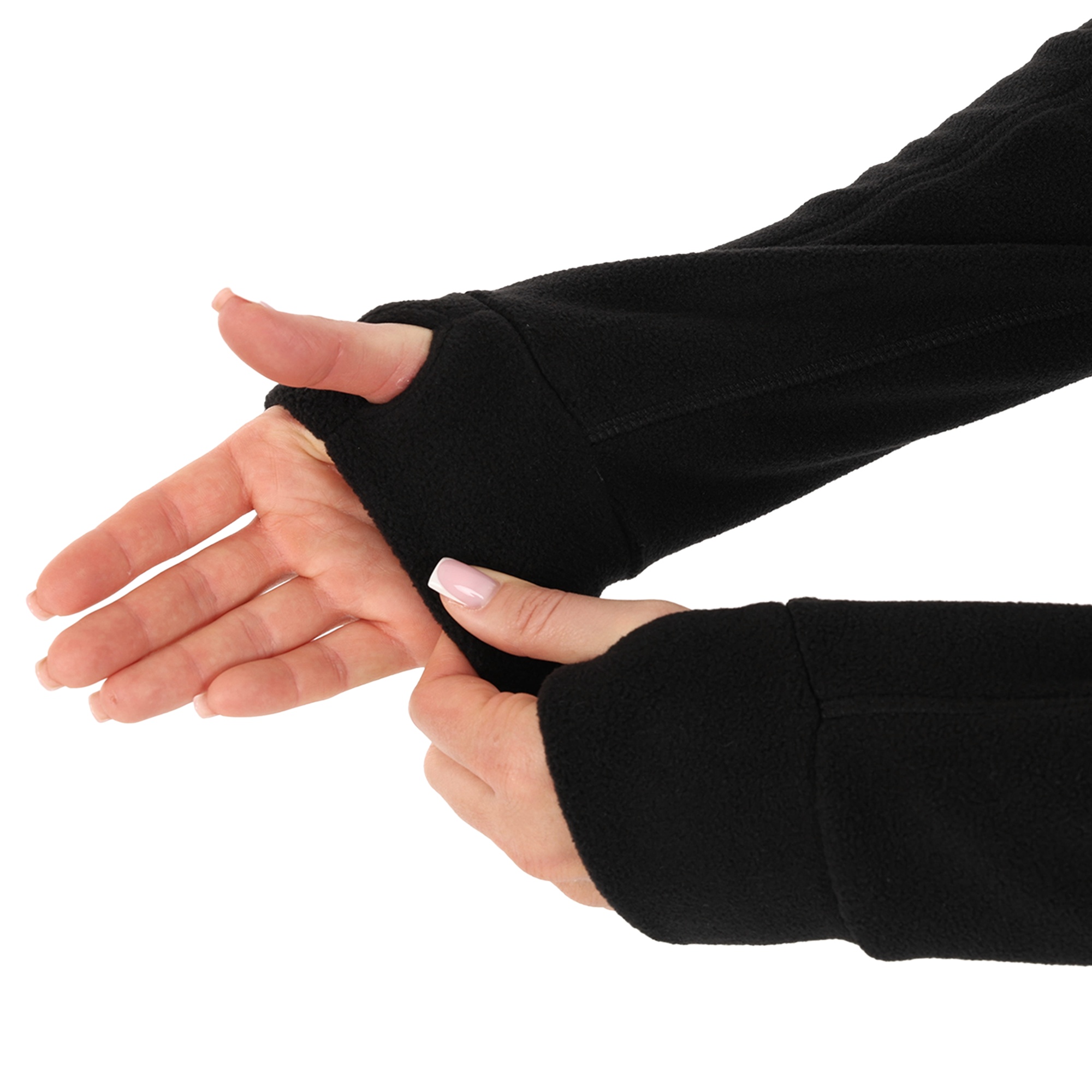 Кофта приталеного фасону має високий комір і отвори для великих пальців. Це забезпечує щільну посадку і захищає від потрапляння всередину холодного повітря. Замок-блискавка по всій довжині оснащений зручним бігунком для швидкого доступу і захистом підборіддя. З боків розташовані прорізні кишені з прихованими блискавками.