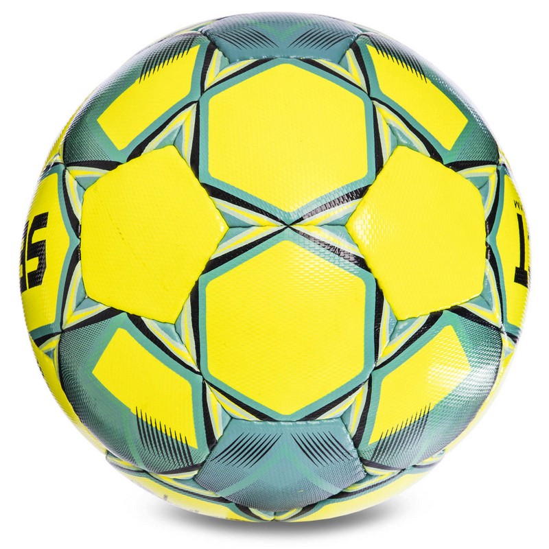 Відмінності від інших: Двоколірне жовто-бірюзове оформлення не лише додає стилю, але й забезпечує чудову помітність. Візерунок на панелях підкреслює ручну зшивку – кожна лінія, кожен шов свідчать про високу якість виготовлення. А стильний мінімалістичний логотип і спортивна графіка в центрі створюють динамічний образ, що виділяє м'яч серед конкурентів.