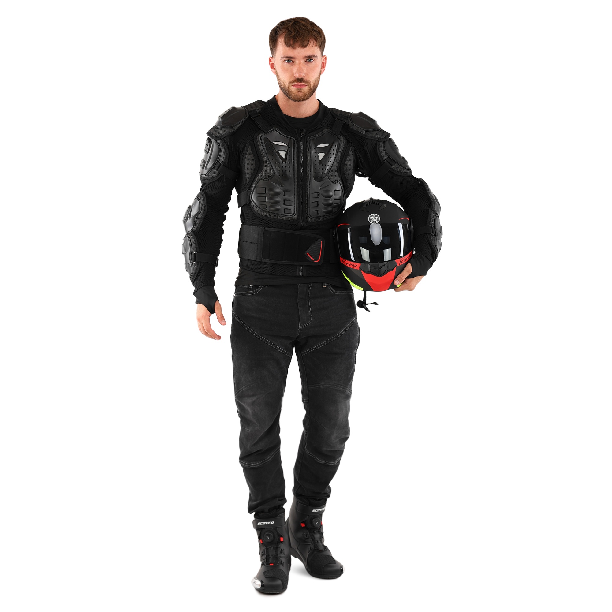 Моточерепаха Scoyco AM02-2 - популярна модель для комплексного захисту мотоциклістів. Гнучка броня з ударостійких матеріалів покриває спину від лопаток до крижів, груди, плечі, лікті та передпліччя. Протектори виконані з товстого багатошарового поліпропілену - матеріалу, здатного поглинати і розсіювати енергію від ударів, мінімізуючи ризик серйозних травм. Запобігти перегріванню дає змогу система вентиляційних отворів. Регульовані ремені дають змогу підігнати захист по фігурі та забезпечують надійну фіксацію протекторів на тілі. Широкий пояс на липучці виконує роль додаткової опори для попереку, а також зменшує навантаження на внутрішні органи під час їзди нерівною дорогою. Рукава сітчастої основи обладнані петлями для пальців, які дають змогу зручно надягати моторукавиці, утримуючи захист рук на одному місці. У виробництві використовуються надійні та якісні бігунки і блискавки YKK.