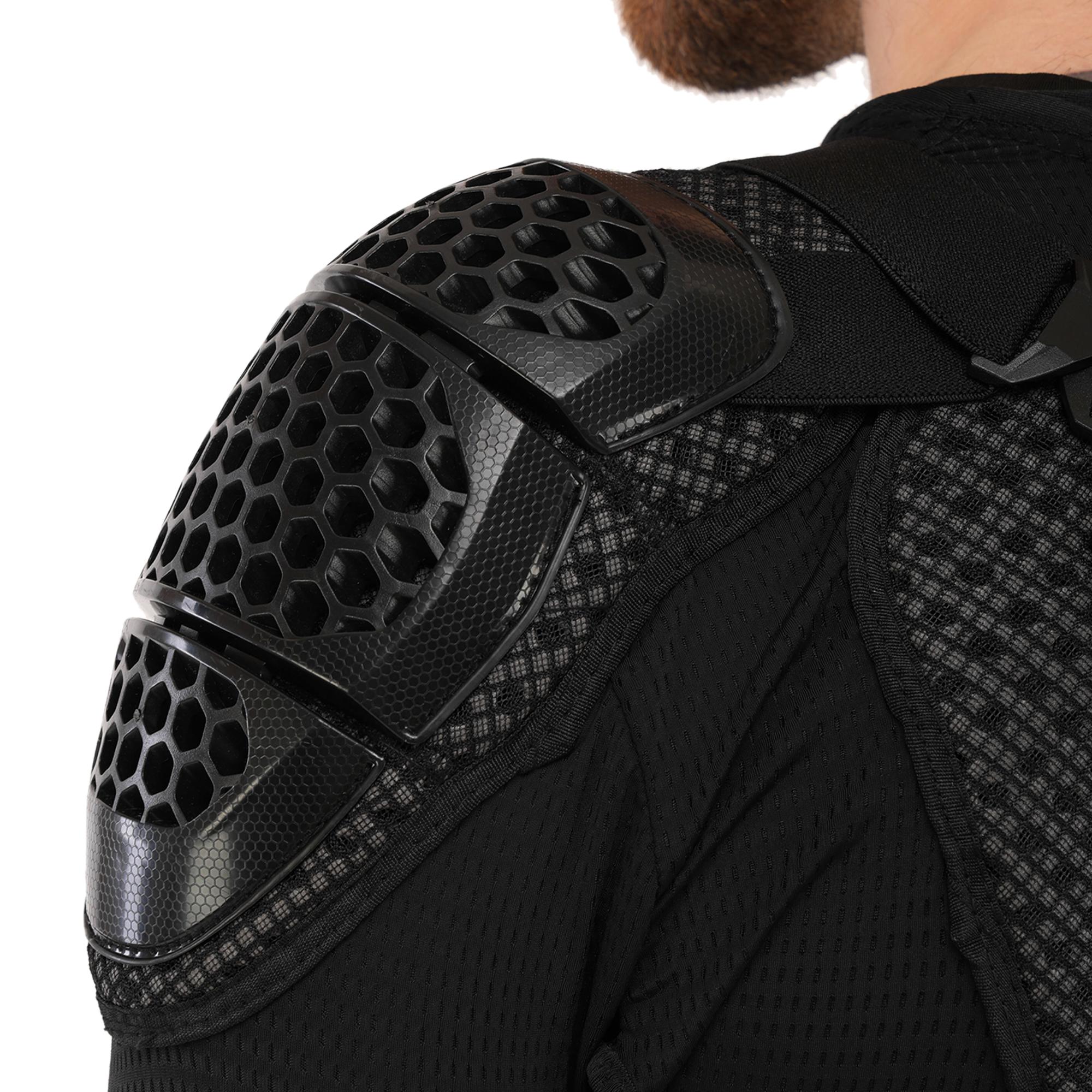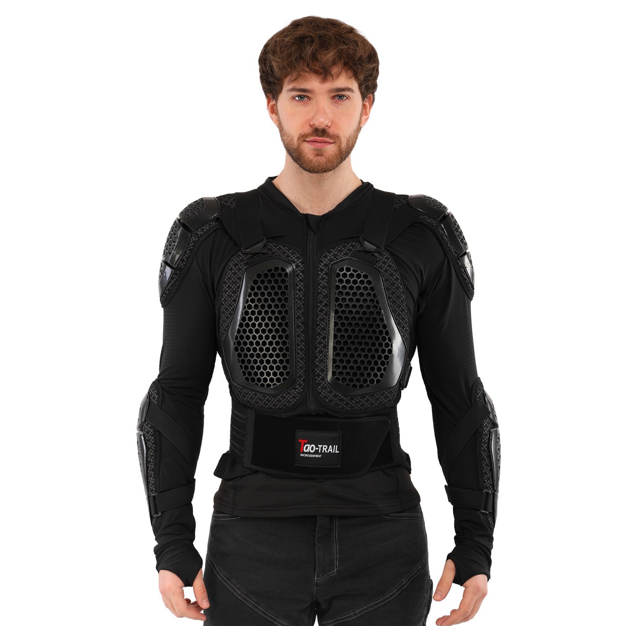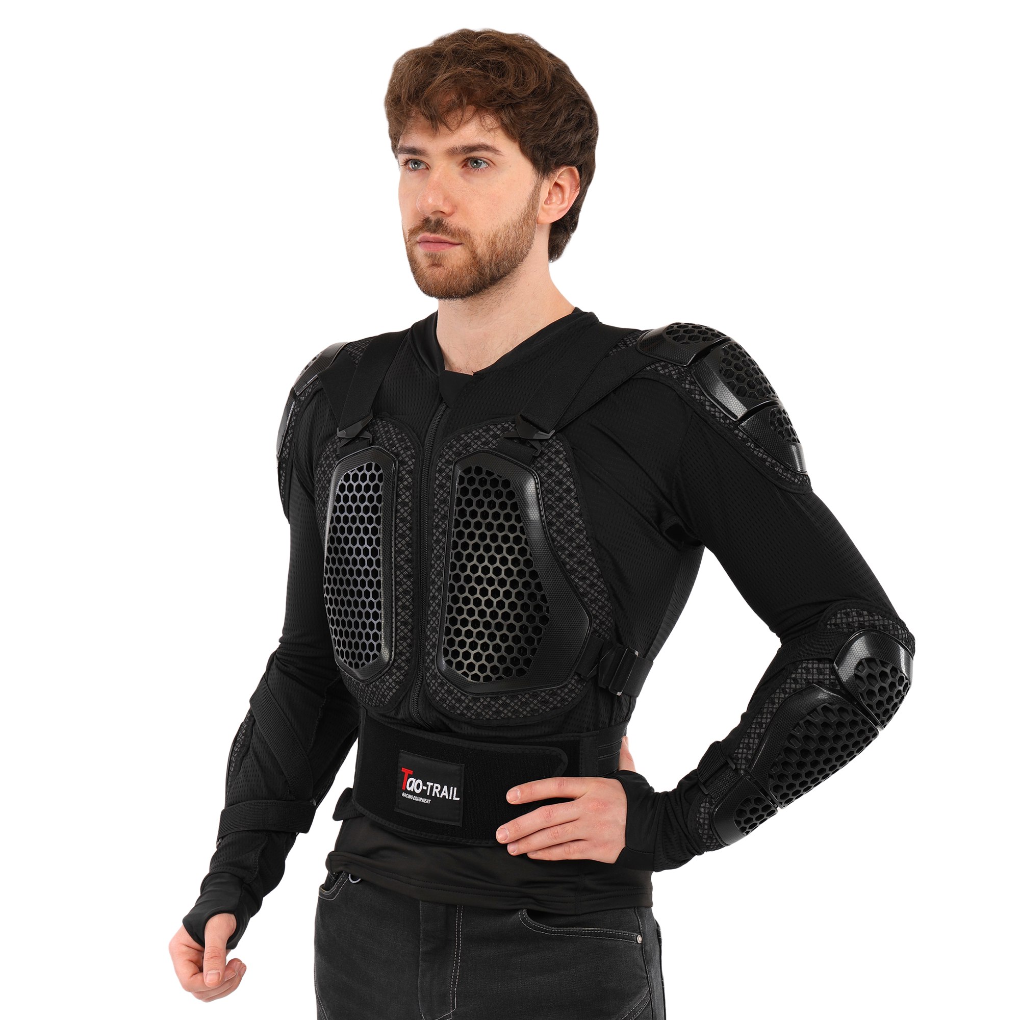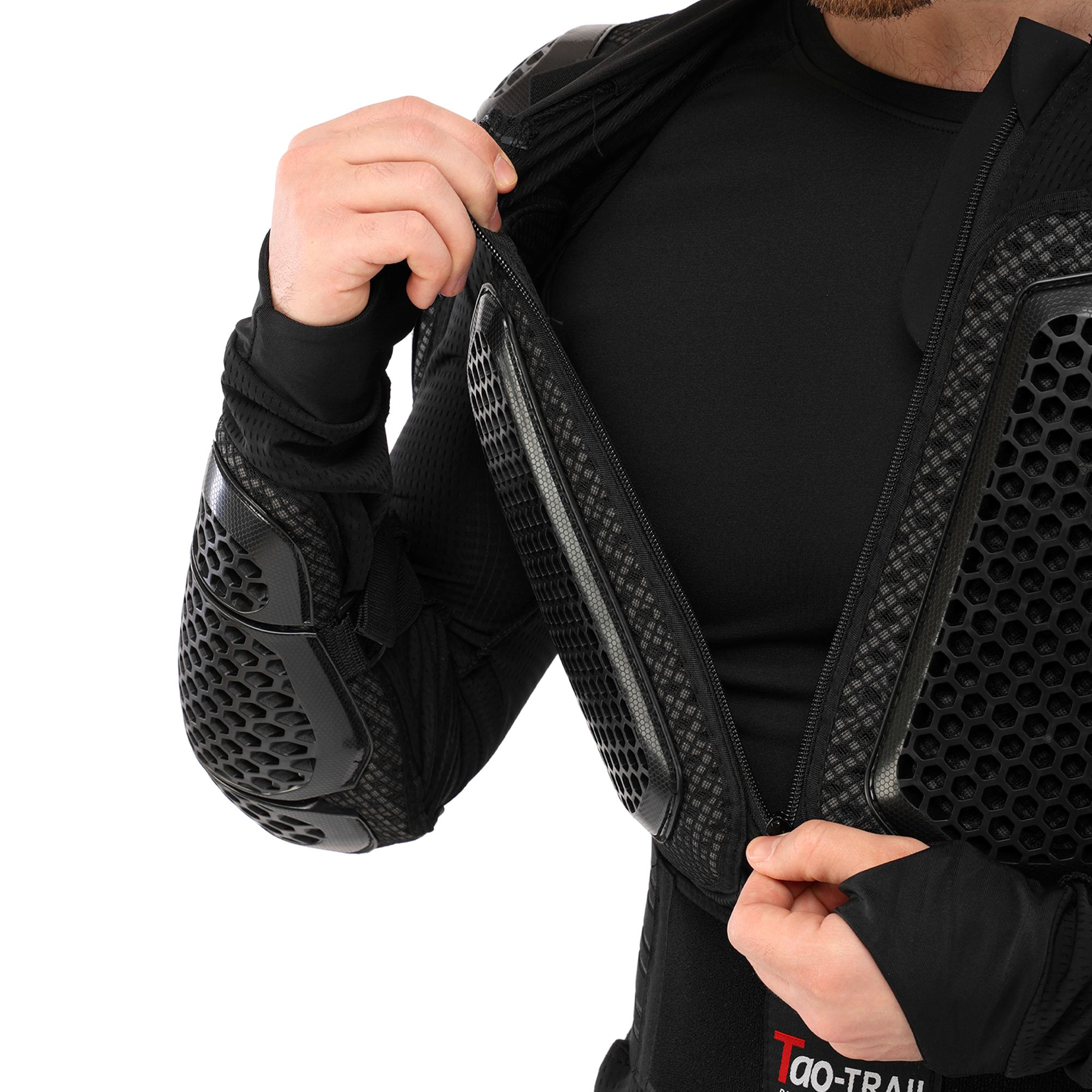 Мотошолом TAO-TRAIL MS-4955 - високоякісне надійне екіпірування, яке забезпечує захист найбільш вразливих зон тіла під час їзди на мотоциклі. Захисні накладки на екіпіруванні виготовлені з міцного пластику, який поглине ударне навантаження у разі падіння з мотоцикла. Структура та форма накладок забезпечують високий рівень захисту від ударів та подряпин. В якості підкладки використовується поліестер. Екіпірування захищає груди, спину, плечі, лікті та передпліччя. Його можна використовувати разом зі спеціальними мотоштанами, з'єднавши обидва елементи екіпірування разом. У передній частині моточерепахи розташована блискавка, яка дозволяє одягати та знімати її як кофту. Ремені для регулювання по посадці розташовані зверху.