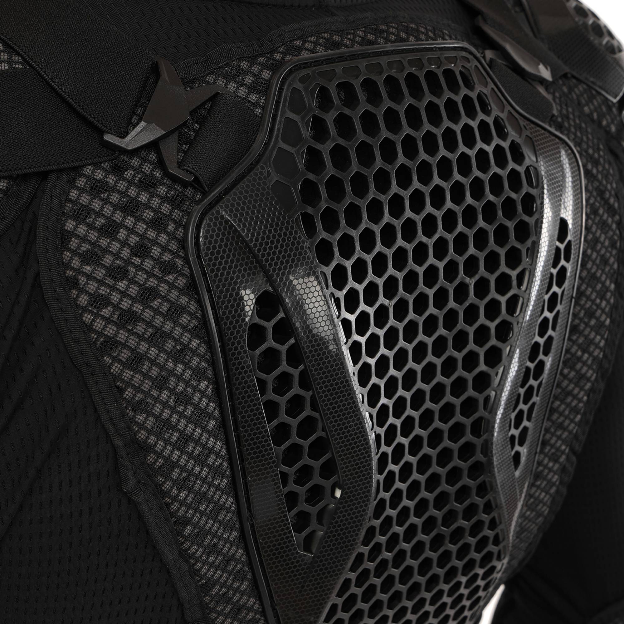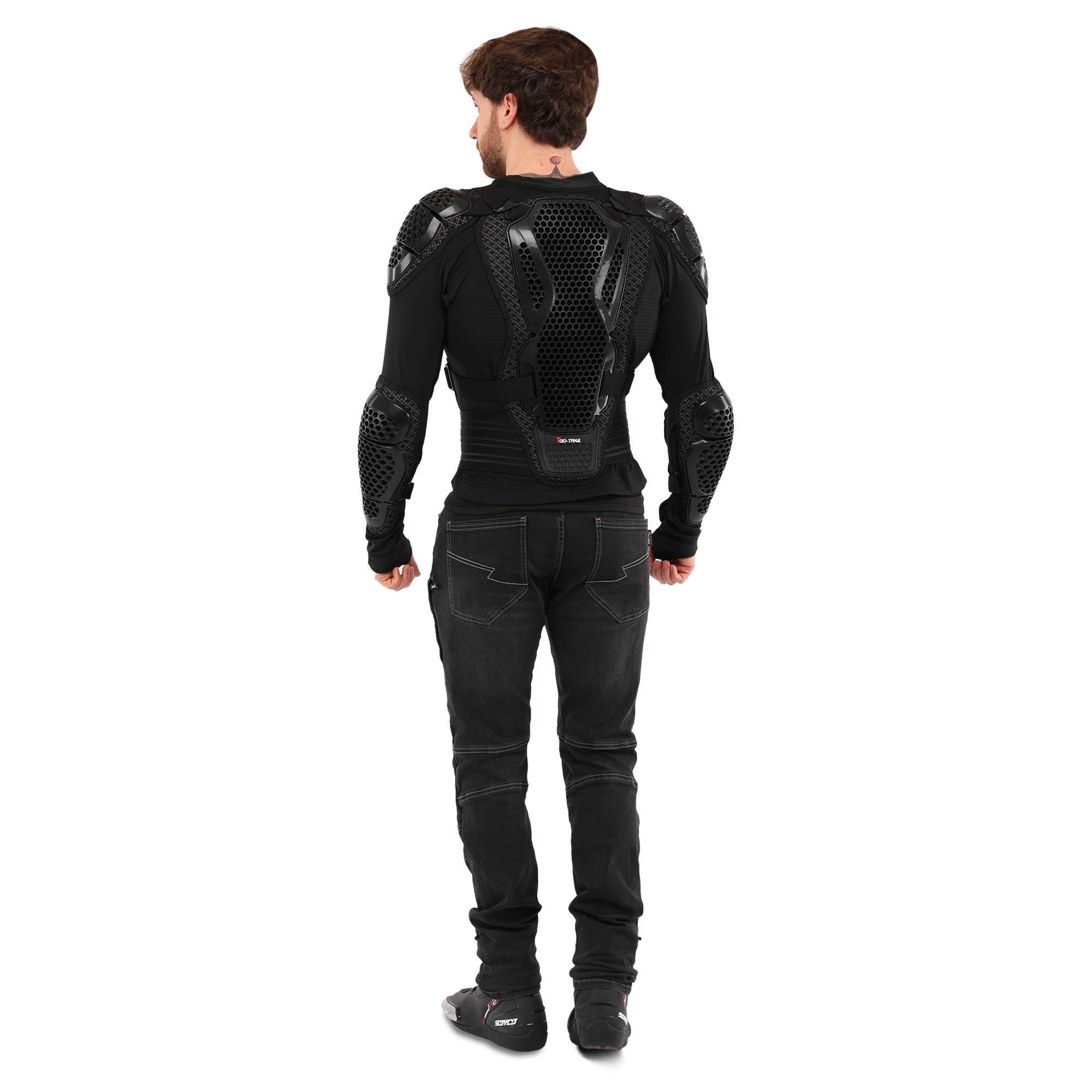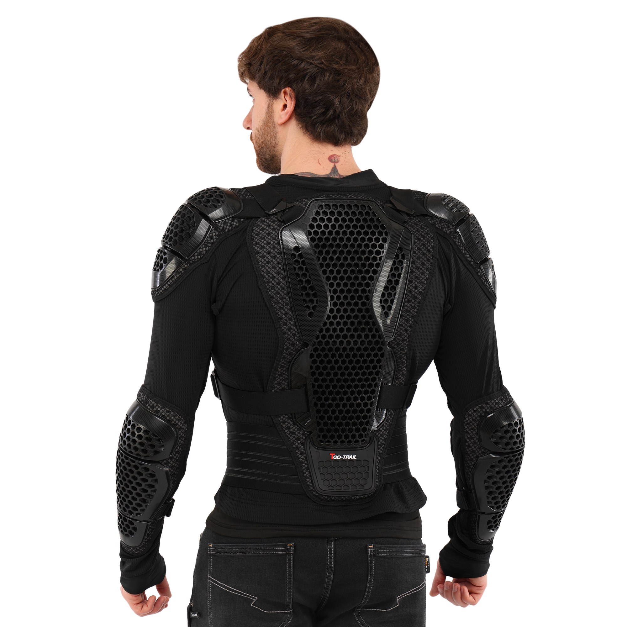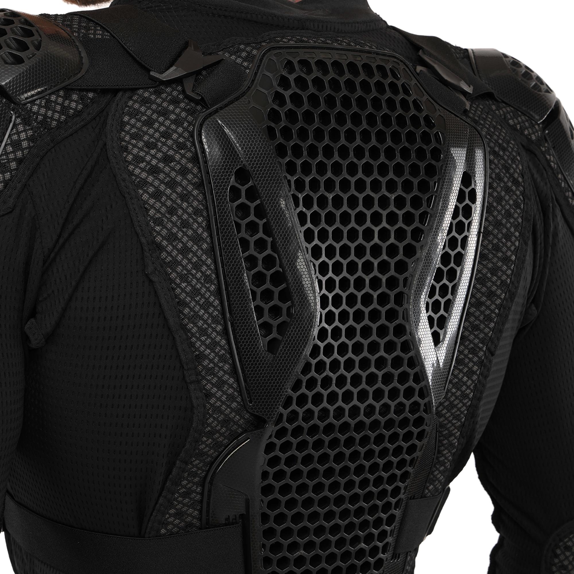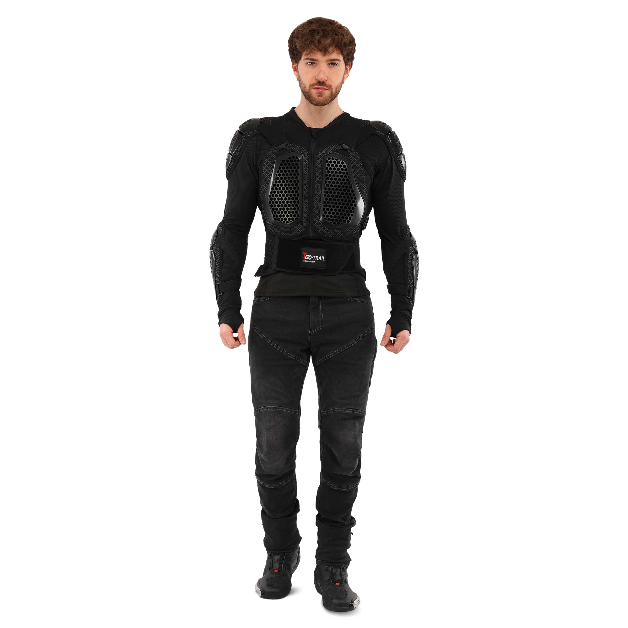 Мотошолом TAO-TRAIL MS-4955 - високоякісне надійне екіпірування, яке забезпечує захист найбільш вразливих зон тіла під час їзди на мотоциклі. Захисні накладки на екіпіруванні виготовлені з міцного пластику, який поглине ударне навантаження у разі падіння з мотоцикла. Структура та форма накладок забезпечують високий рівень захисту від ударів та подряпин. В якості підкладки використовується поліестер. Екіпірування захищає груди, спину, плечі, лікті та передпліччя. Його можна використовувати разом зі спеціальними мотоштанами, з'єднавши обидва елементи екіпірування разом. У передній частині моточерепахи розташована блискавка, яка дозволяє одягати та знімати її як кофту. Ремені для регулювання по посадці розташовані зверху.