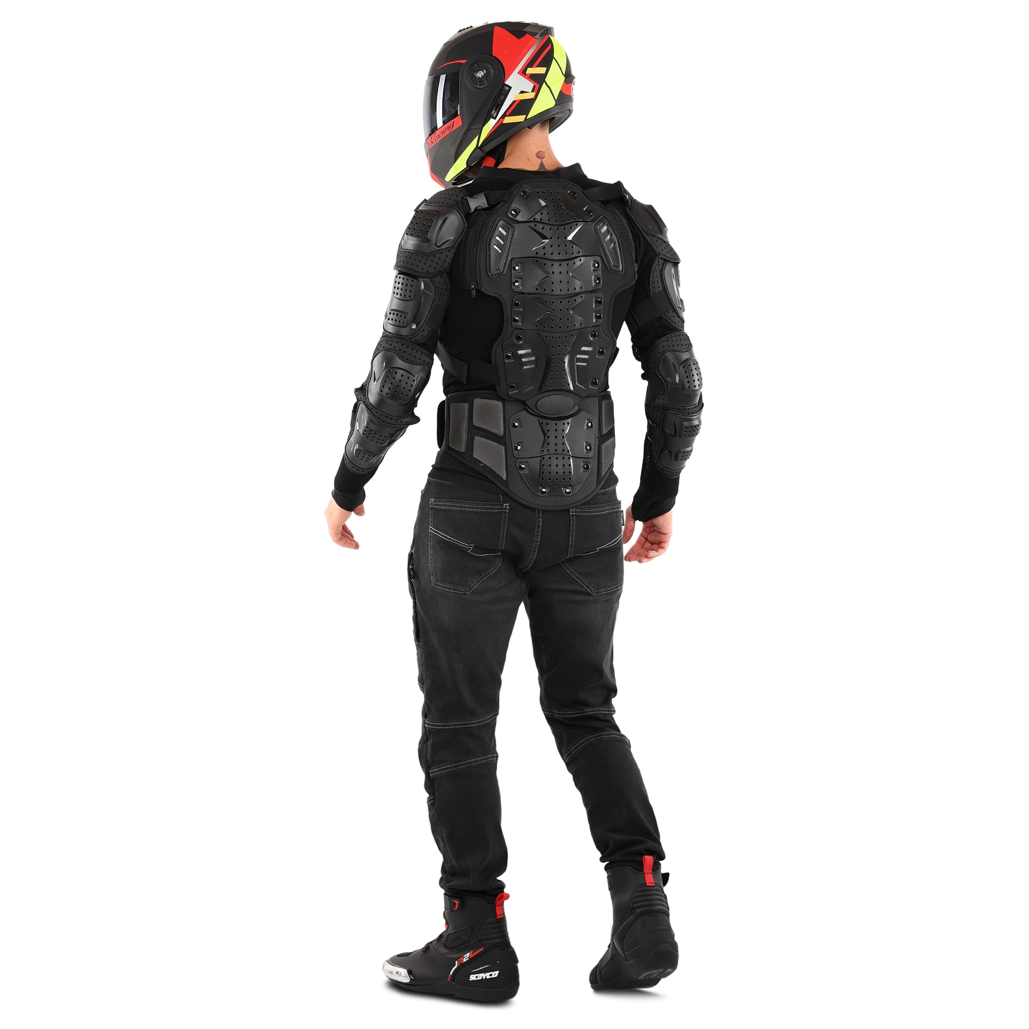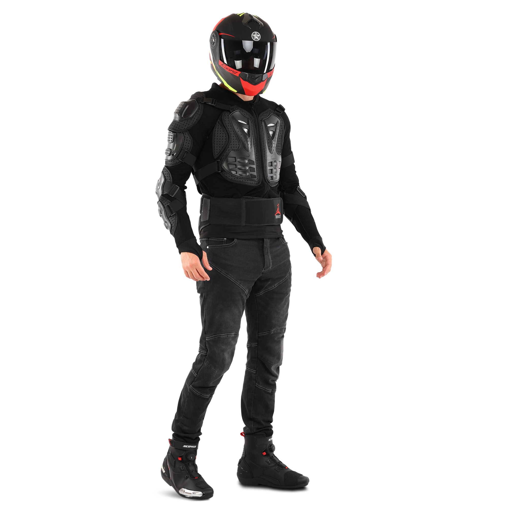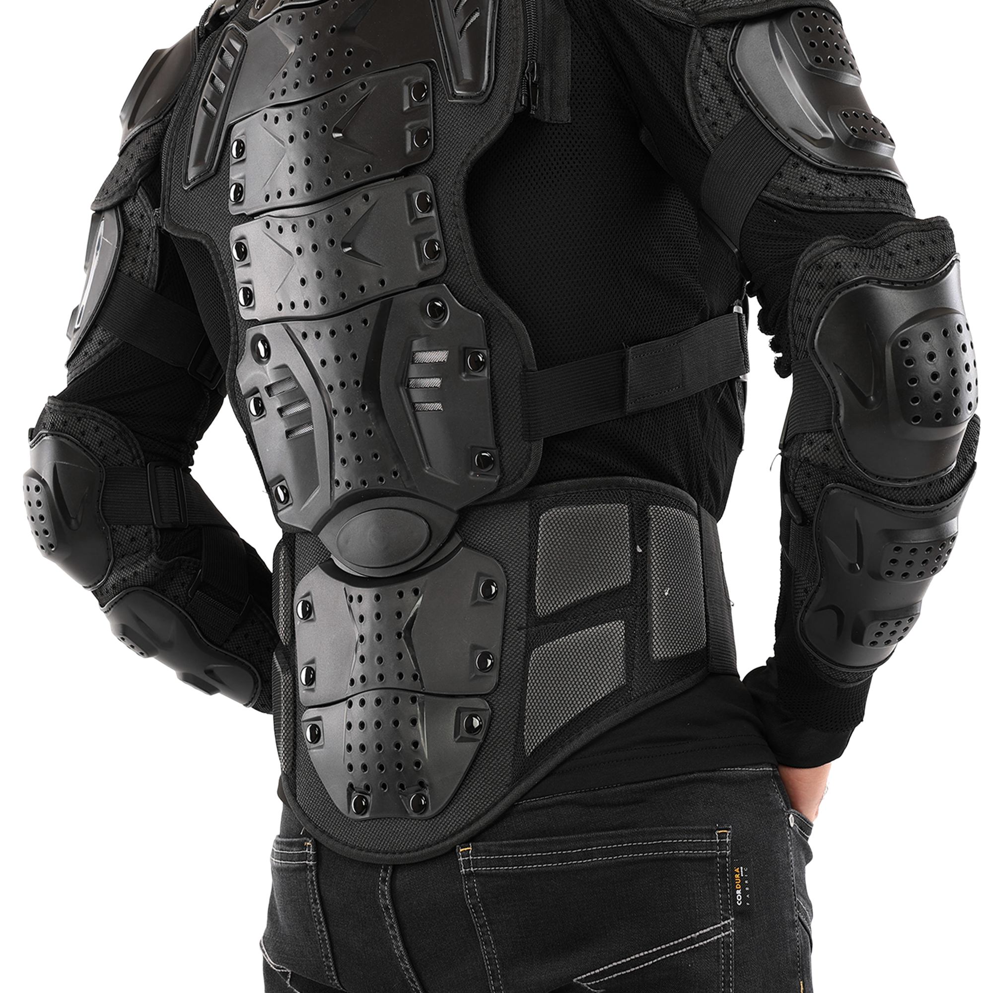 Це екіпірування спроектоване для максимальної безпеки. Усі протектори виготовлені з ударостійкого пластику, а підкладка виконана з поліестеру. Захист розташований на грудях і спині: спина надійно прикрита від грудного до поперекового відділу хребта. У ділянці попереку передбачено додаткові м'які накладки, які забезпечують комфорт і підтримку під час руху.