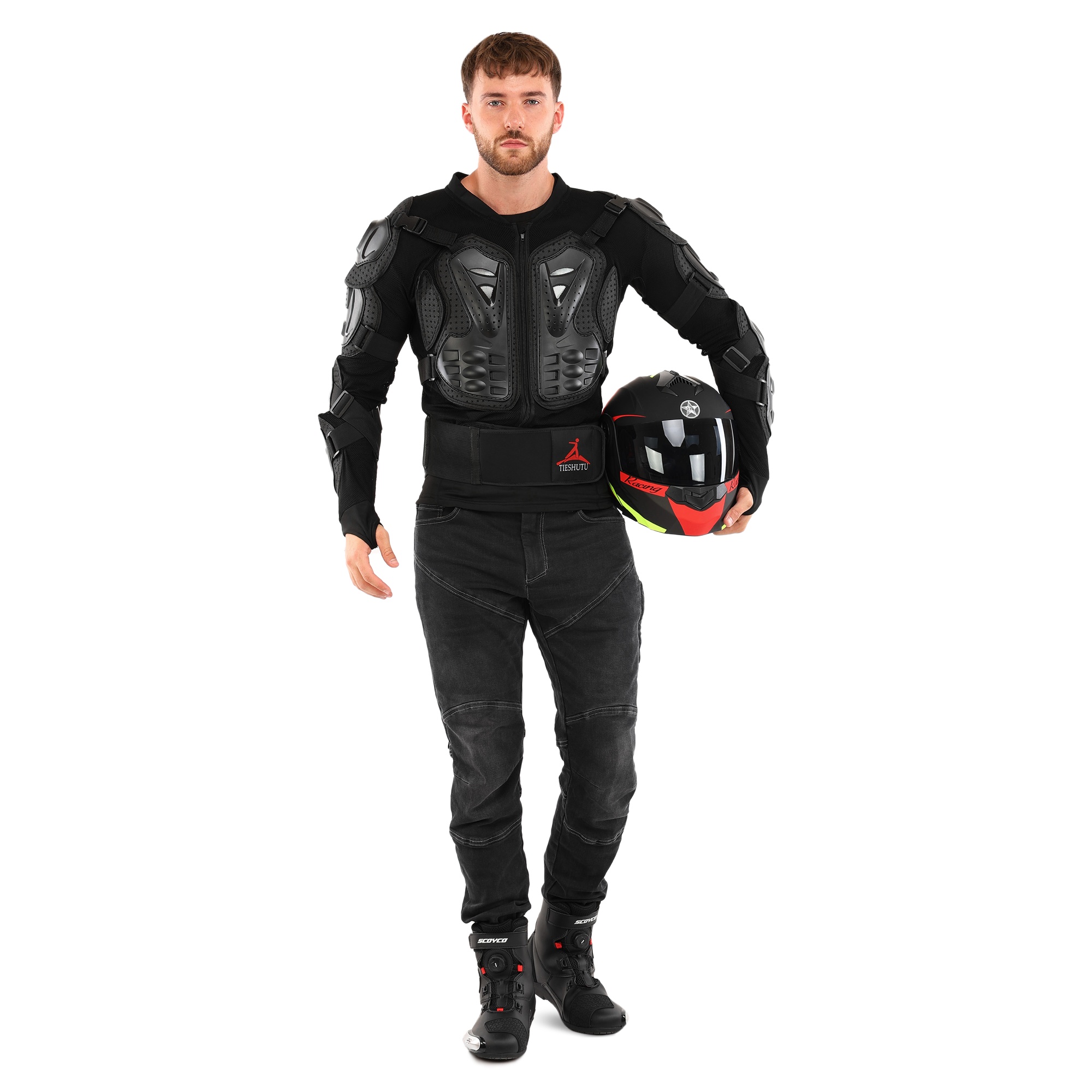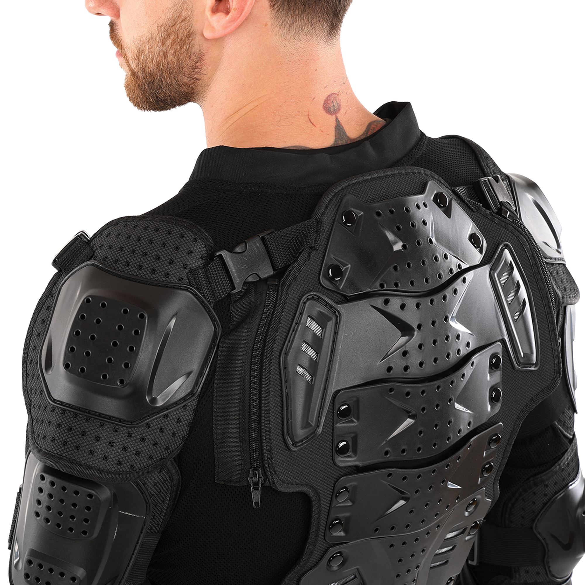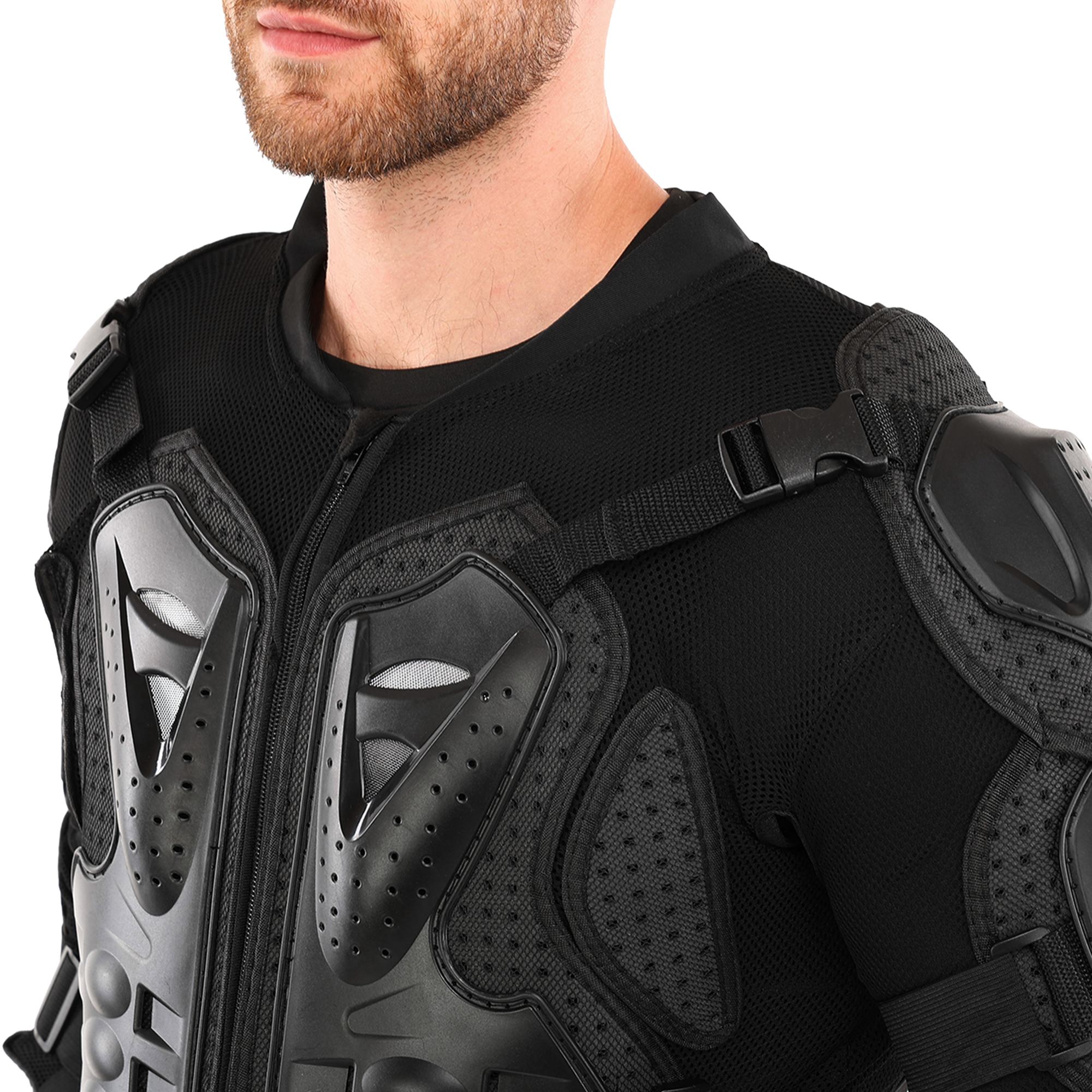 Це екіпірування спроектоване для максимальної безпеки. Усі протектори виготовлені з ударостійкого пластику, а підкладка виконана з поліестеру. Захист розташований на грудях і спині: спина надійно прикрита від грудного до поперекового відділу хребта. У ділянці попереку передбачено додаткові м'які накладки, які забезпечують комфорт і підтримку під час руху.