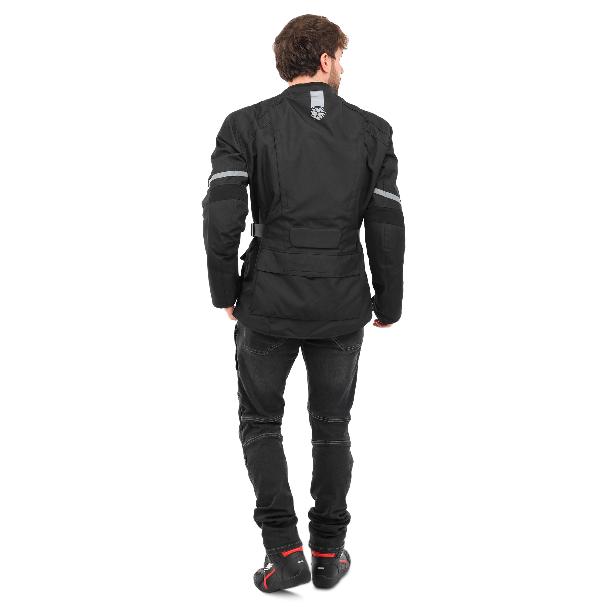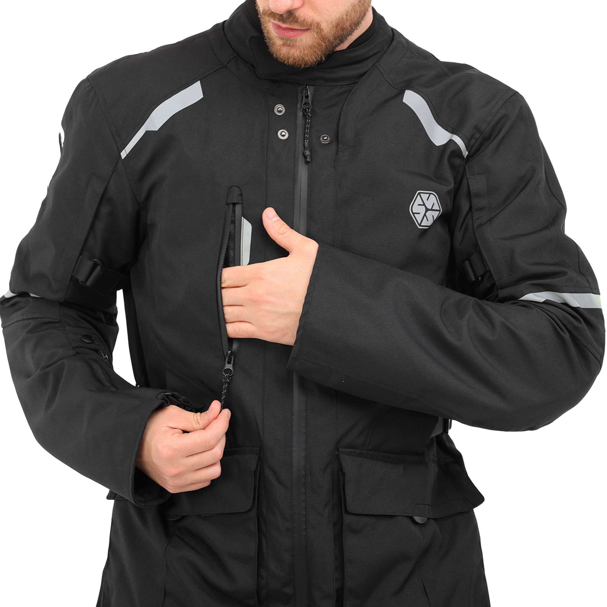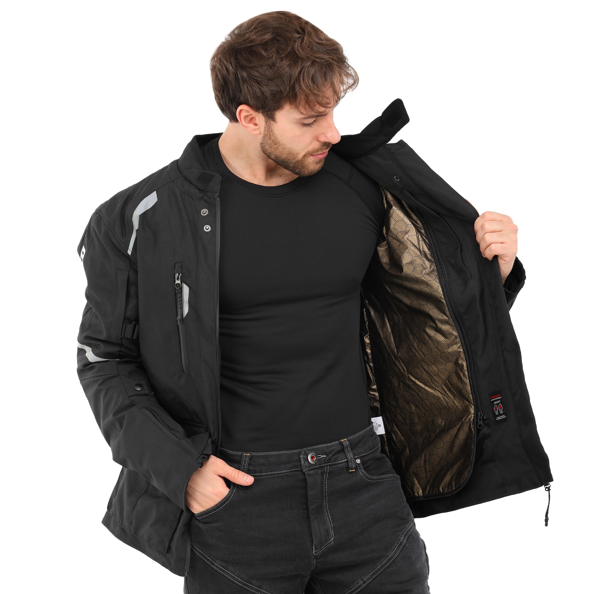 Куртка застібається на герметичну блискавку та оснащена регулюваннями на талії й рукавах для кращого прилягання. На передній частині є великі зручні кишені, а також світловідбивні елементи для безпеки мотоцикліста в темний час доби.