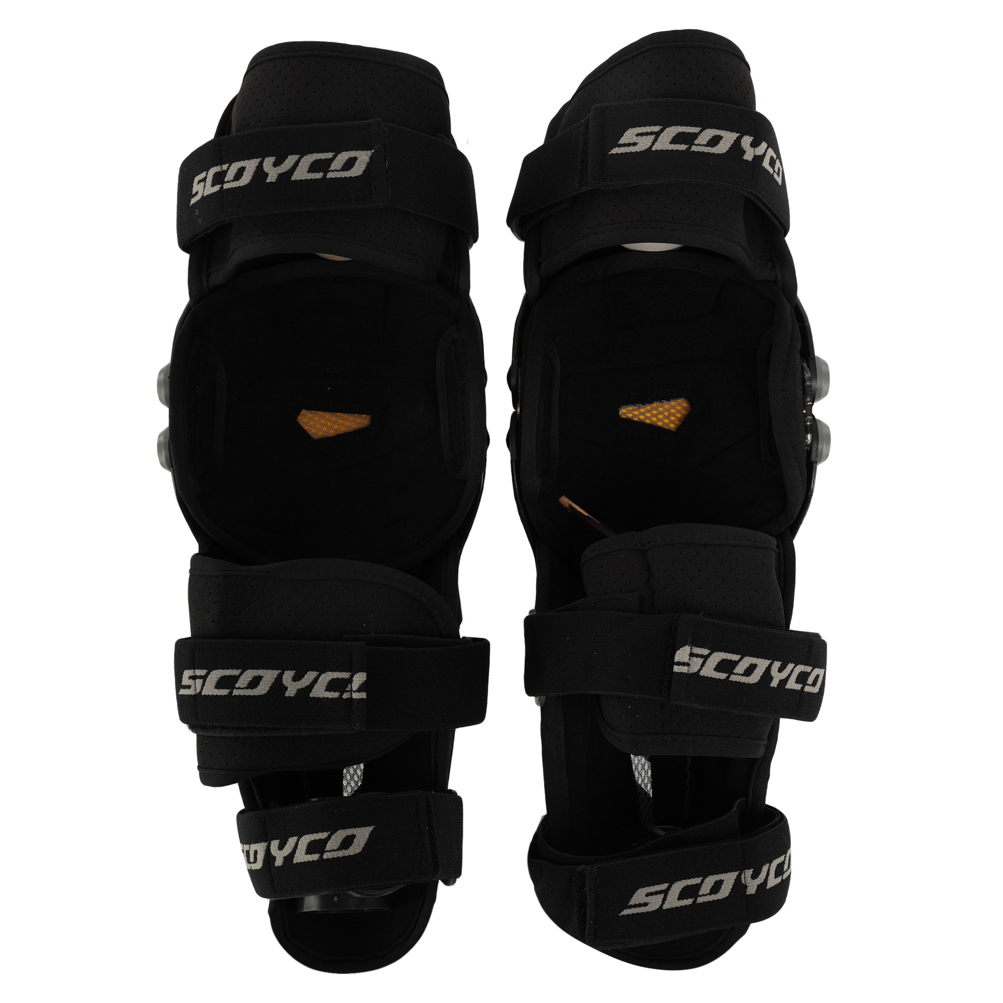 Мотонаколінники на шарнірах від відомого бренду мотоекіпіровки - Scoyco. Захист ніг анатомічно спроєктований і виготовлений методом лиття під тиском. Наколінники щільно прилягають, залишаючись на місці навіть коли спортсмен здійснює активні рухи ногами. Три поворотні шарніри на кожному наколіннику забезпечують стабільність і свободу рухів. Поворотний діапазон: 30-180 °. У місці зіткнення з тілом наколінники вкриті м'яким, приємним на дотик поліестером. Синтетична тканина дуже міцна та довговічна, вона добре поглинає вологу та забезпечує постійний доступ свіжого повітря. На протекторах з ABS-пластику розташовані вентиляційні отвори, закриті сітчастими вставками. Регулювання розміру здійснюється за допомогою еластичних ременів зі зручними гачками на кінцях.