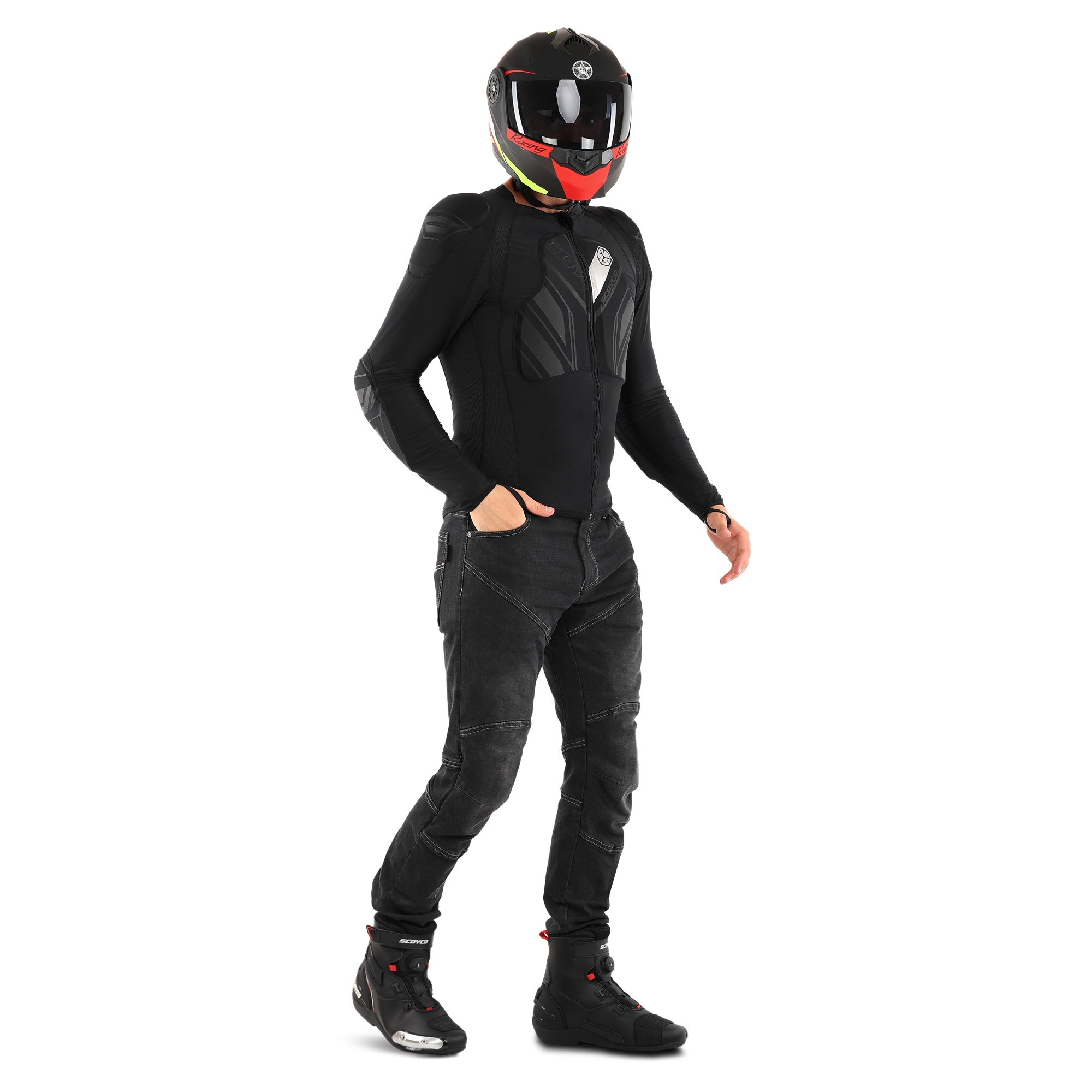 Моточерепаха компресійна Scoyco Hermes Body armor AM03 - комплексний захист мотоцикліста, створений з урахуванням суворих стандартів безпеки із сертифікованих матеріалів. Жорсткі вставки в області грудей, спини, плечей і ліктів захищають найбільш схильні до травм ділянки тіла. Структура протекторів розроблена для ефективного розсіювання і поглинання ударної енергії. В основі - легка еластична тканина, стійка до швидкого зносу. Куртка має приталений крій, з боків і на рукавах розташовані сітчасті вставки для охолодження і вологовідведення. Виріб не розтягується і зберігає форму протягом тривалого часу. Застібка-блискавка міцна і надійна.