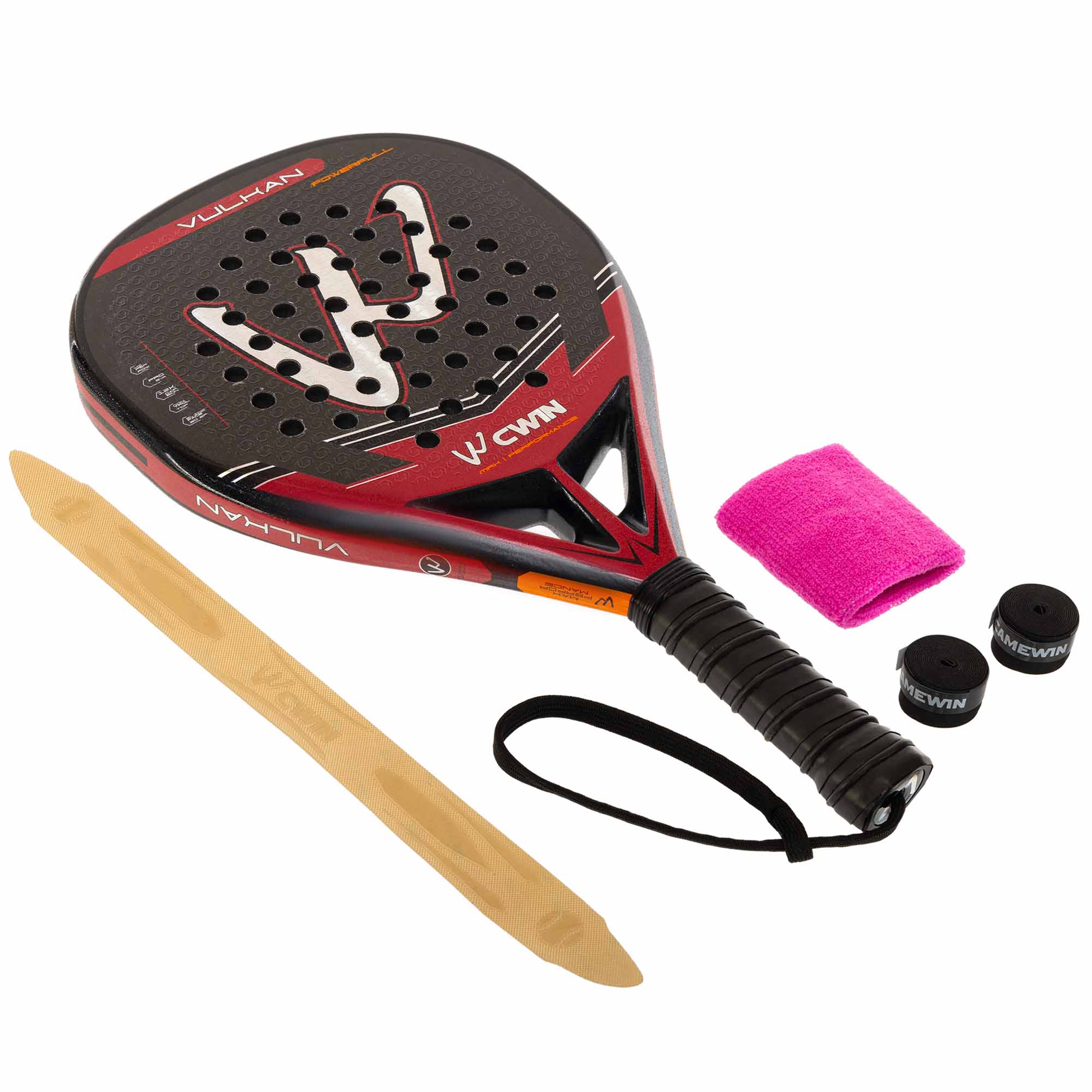 Набір для падел-тенісу CAMEWIN MASTER BT-6529 включає ракетку, м'яч, напульсник і чохол, а також пару обмоток. Ракетка невеликої ваги (всього 360 г), підходить для гравців середнього рівня. Повний набір включає все необхідне для продуктивних ігор і тренувань. Рама ракетки виготовлена з 3K карбону і EVA. Гравець отримує міцну, в міру гнучку і довговічну ракетку. Обмотка з 100% поліуретану гарантує хороше зчеплення з руками і дозволяє незначно змінити діаметр ручки. Ракетка має краплеподібну форму голови, яка є універсальною для різних стилів гри.