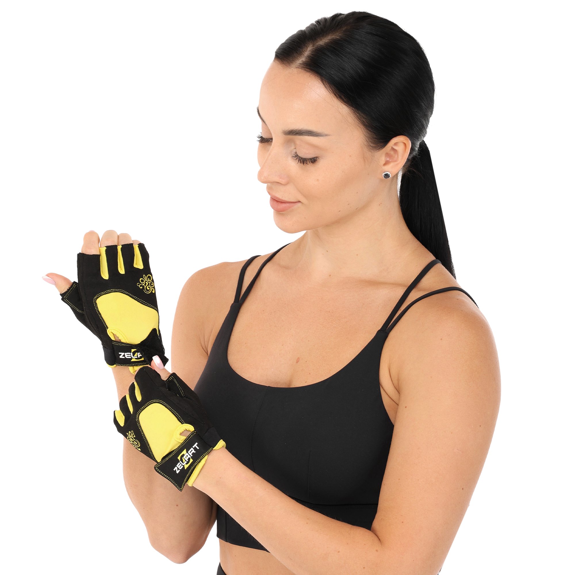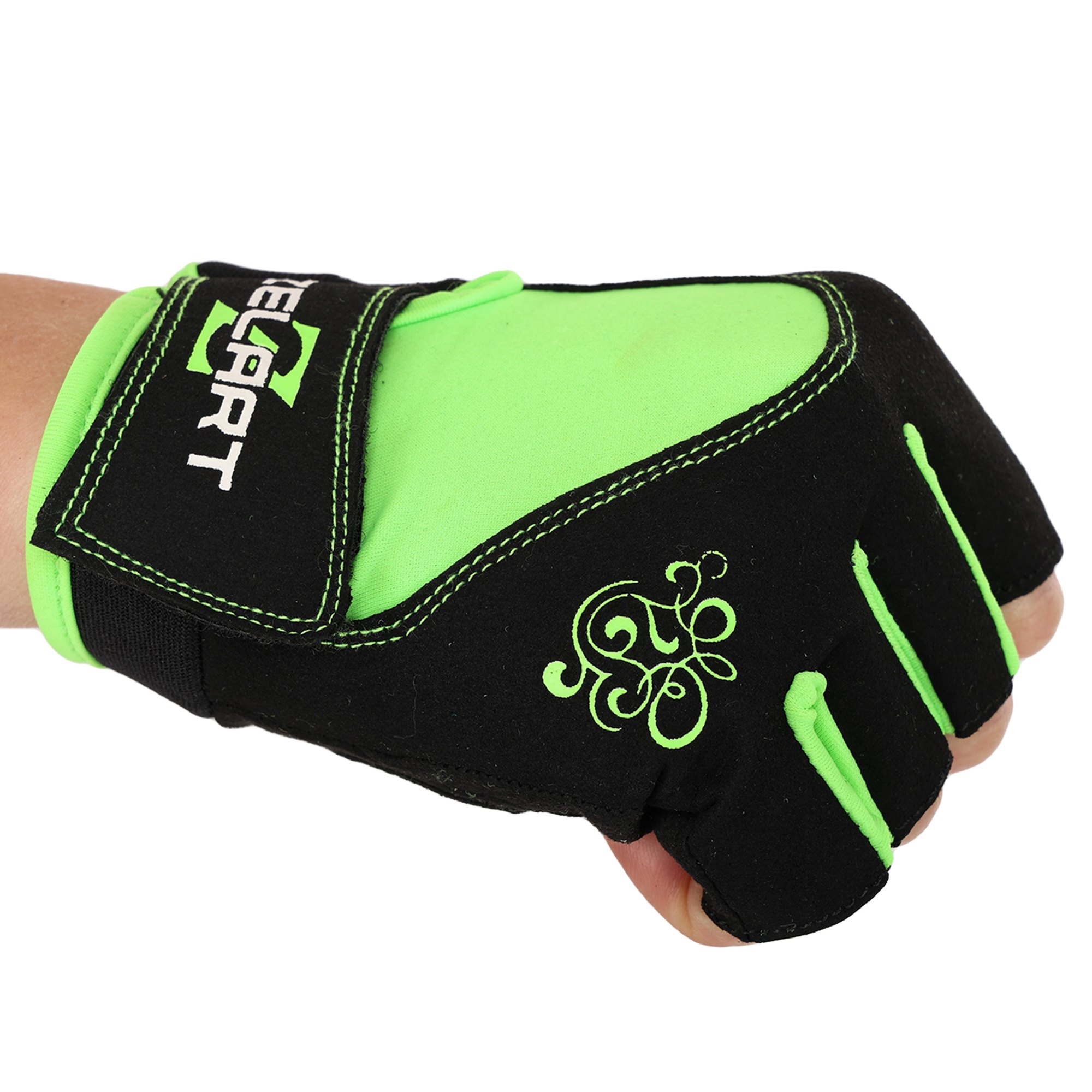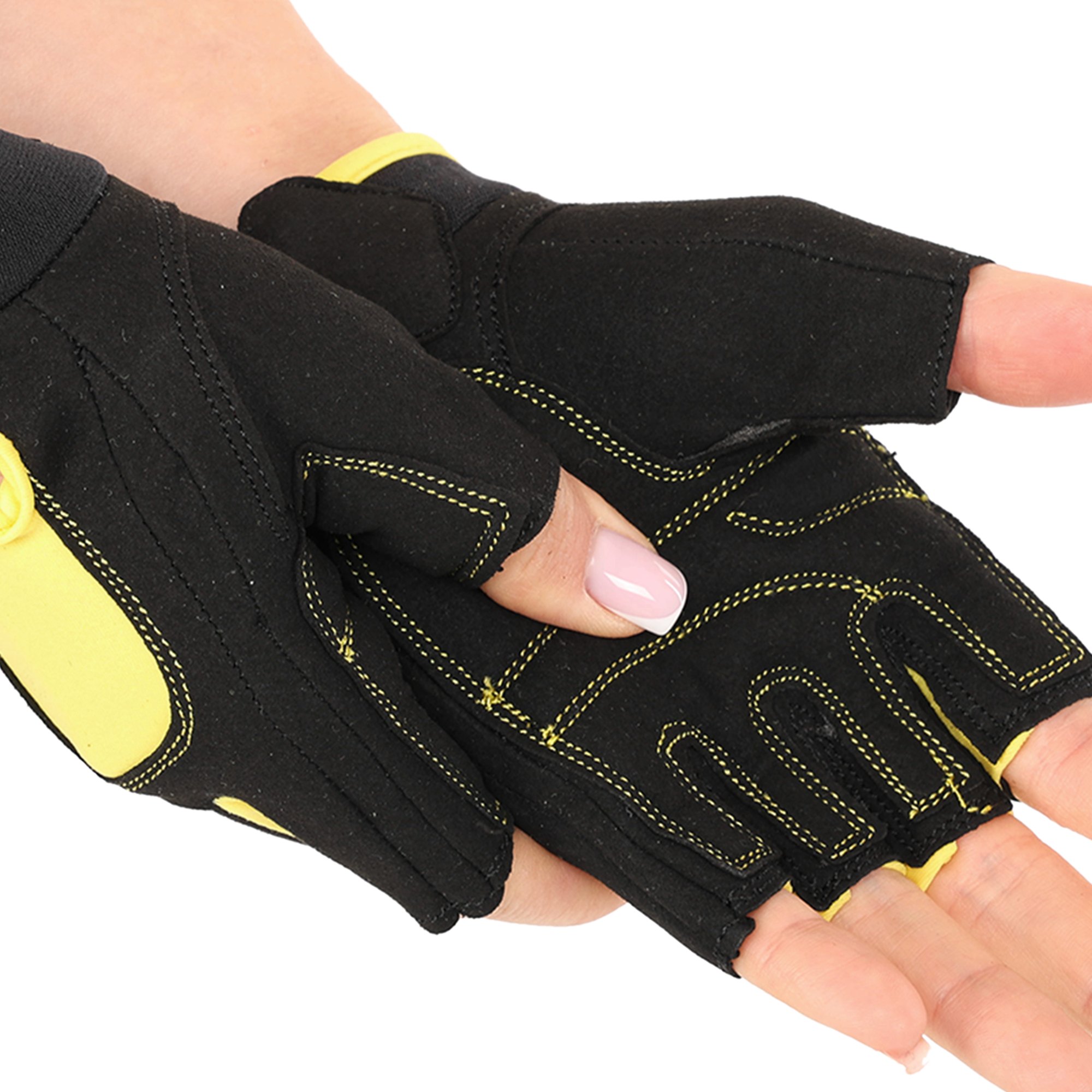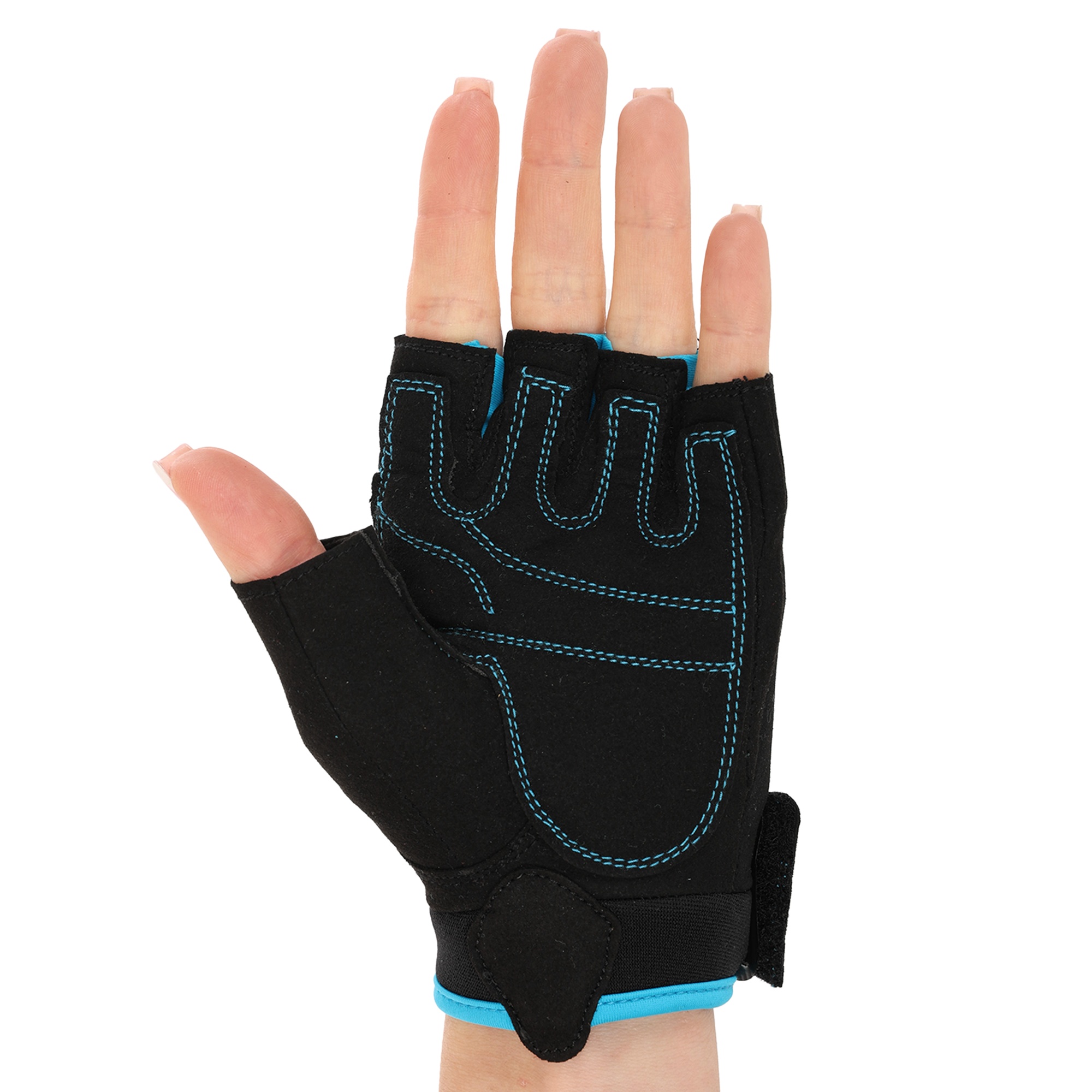 Рукавички для фітнесу призначені для жінок. Їхня зручна конструкція включає застібки на зап'ястях, які дають змогу відрегулювати їх за розміром і посадкою. Рукавички облягають руки, забезпечуючи комфорт під час виконання будь-яких вправ. Тильна сторона рукавичок виготовлена з легкого повітропроникного матеріалу. Тканина досить гнучка, не сковує рухів і вирізняється високою міцністю.