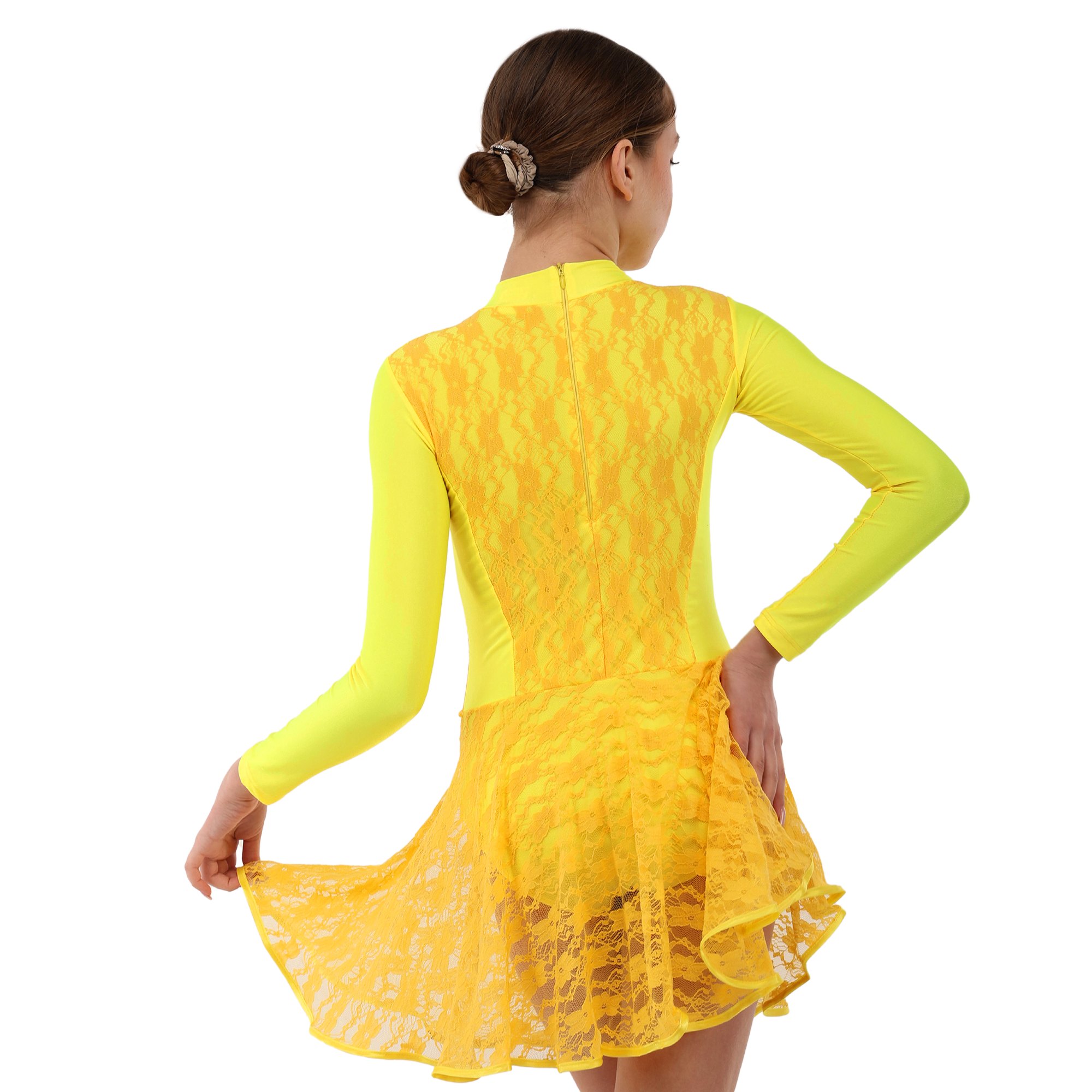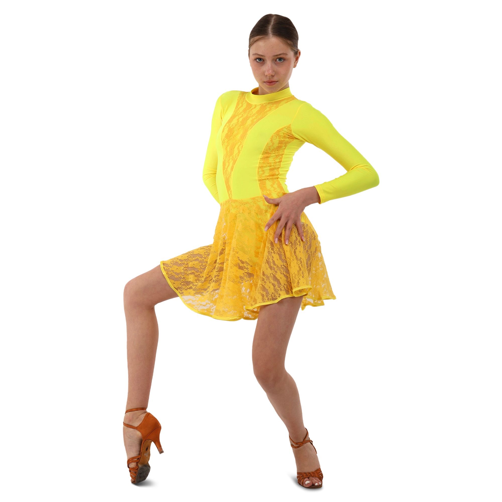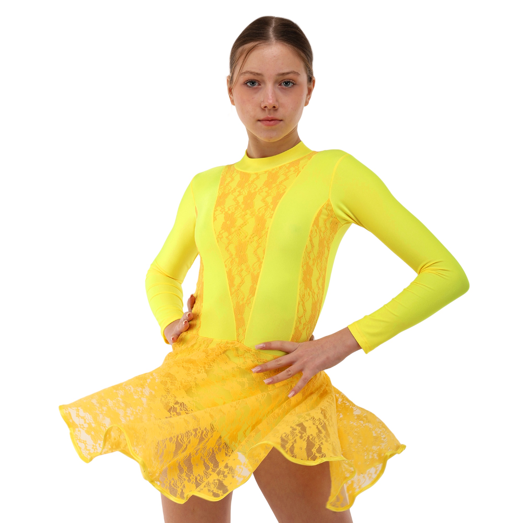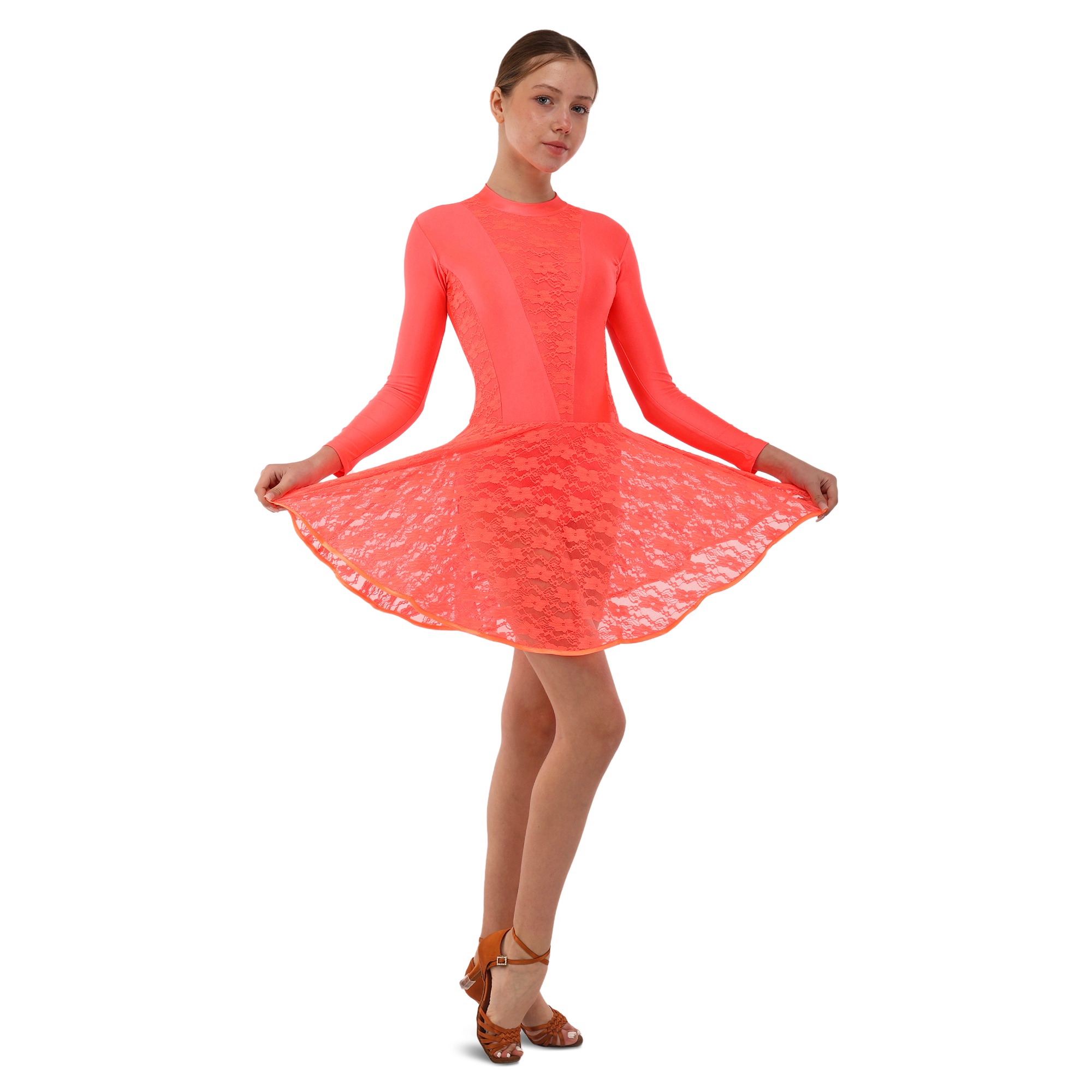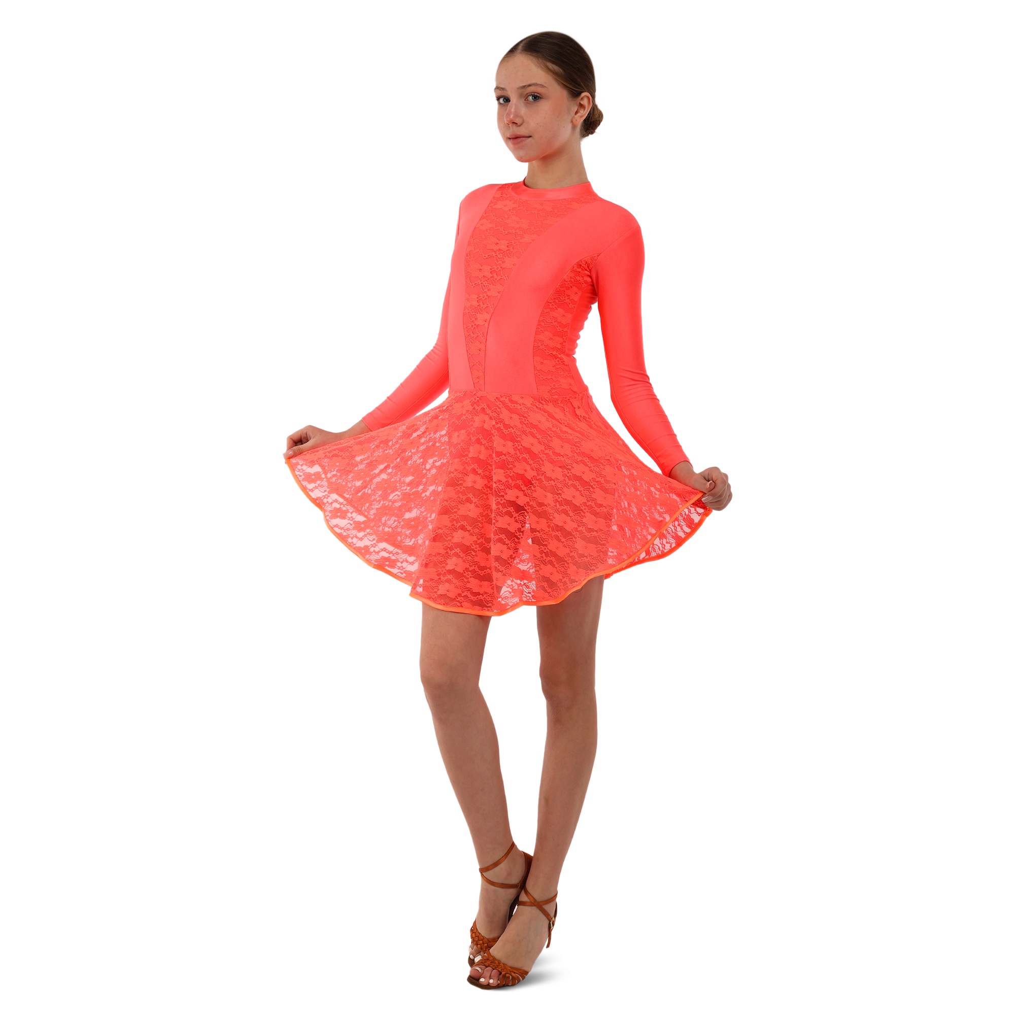 Традиційний крій рейтингової сукні забезпечує максимальну свободу рухів. Спідниця пришита до талії і ніяк не заважає виконанню танцювальних елементів, вона не закриває коліна.