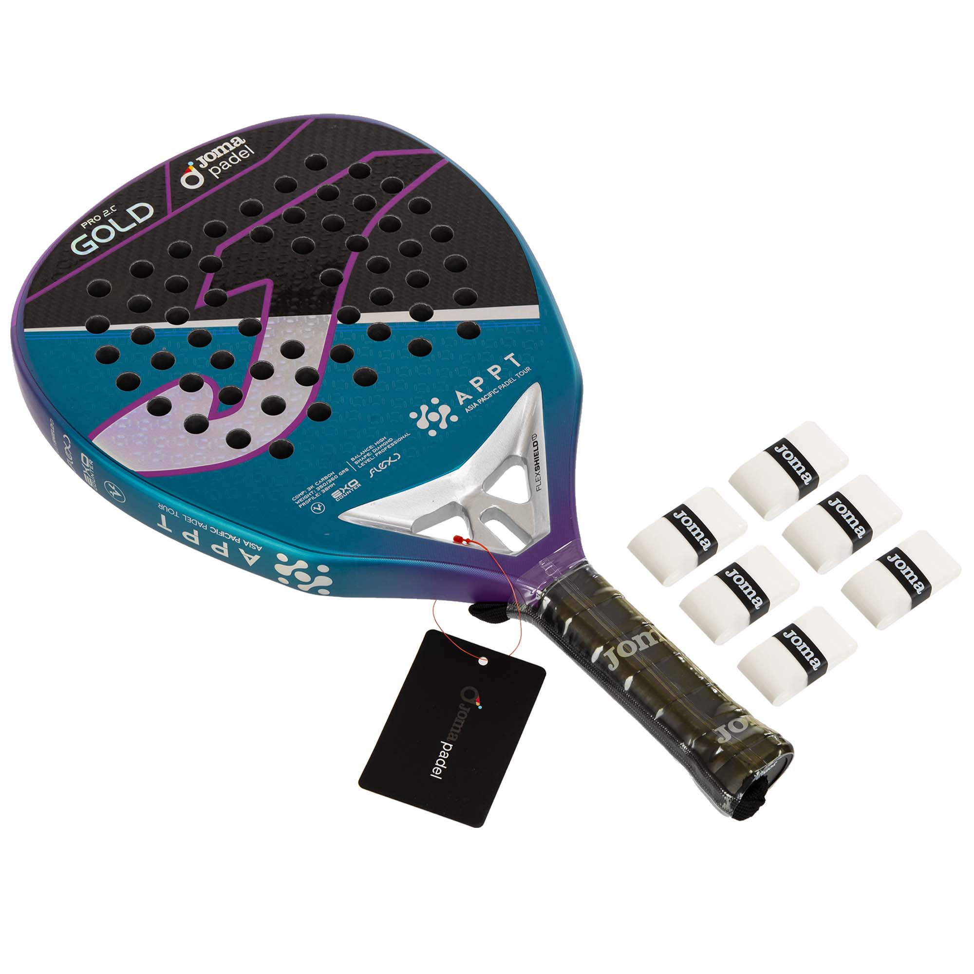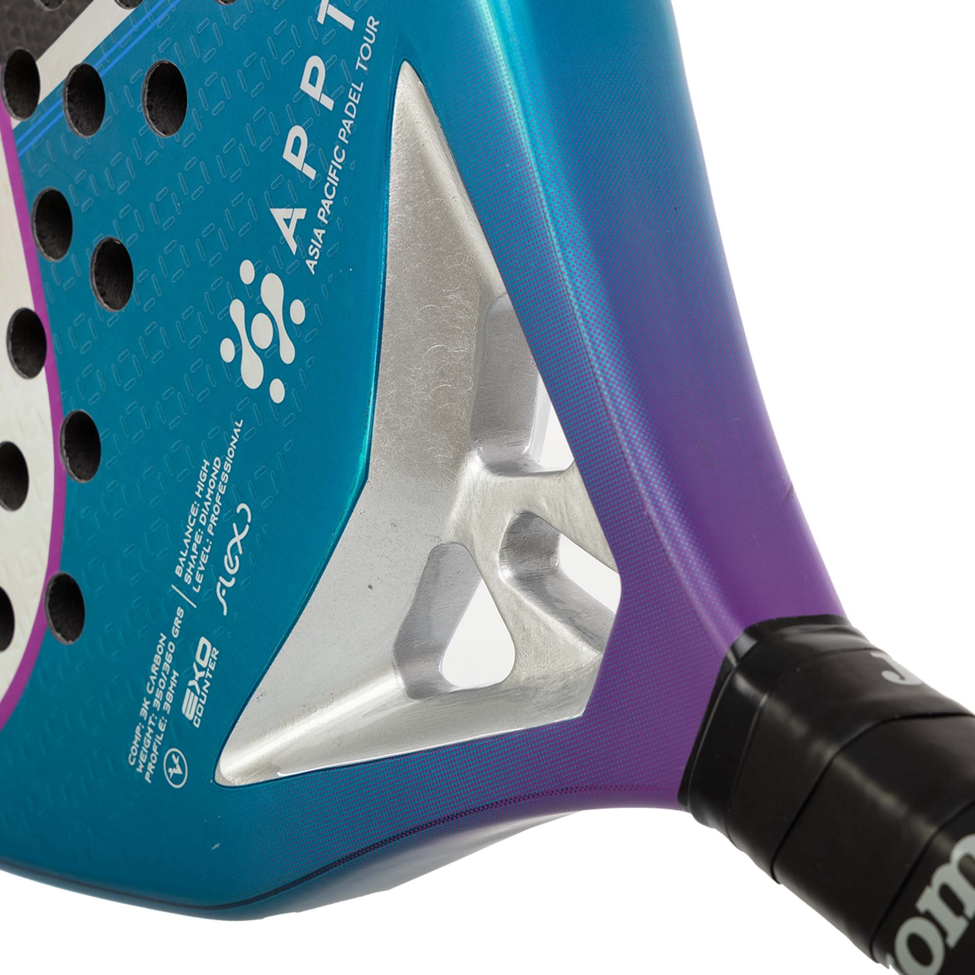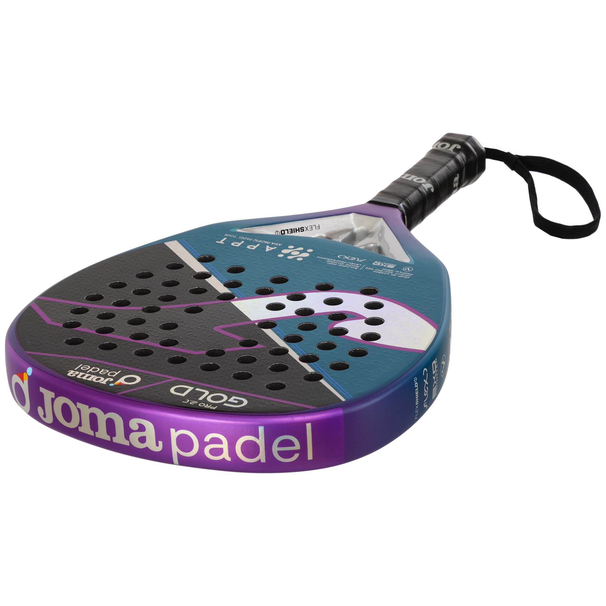 Оригінальна ракетка для падел-тенісу Joma APPT 401793-551 виготовлена з карбону і скловолокна, а також має унікальний сердечник Fexo BlackEVA. Матеріал сердечника має високу щільність. Ці властивості дозволяють йому амортизувати ударне навантаження і при цьому забезпечувати хороший відскок м'яча від ракетки. Ракетка має довжину 46 см і дозволяє діставати складні м'ячі. Вага ракетки становить 355-360 г. Попри невелику вагу, виробник зробив все можливе, щоб гравець міг завдавати потужних ударів. Ромбоподібна форма голови дозволяє генерувати максимальну силу удару і відмінно підходить для атакуючого стилю гри. Поверхня ракетки виготовлена зі скловолокна і 3K карбону. Вони забезпечують достатню міцність і жорсткість.