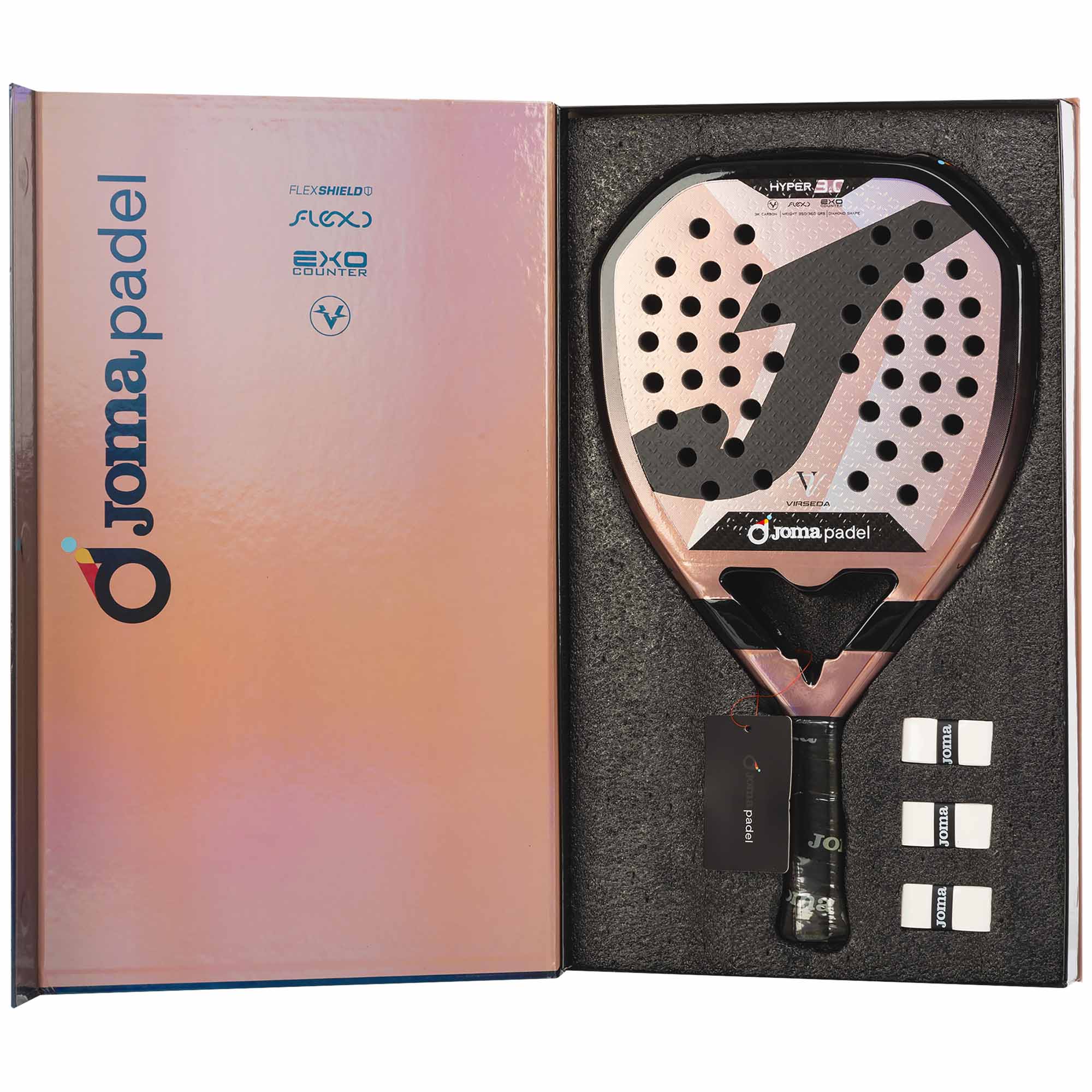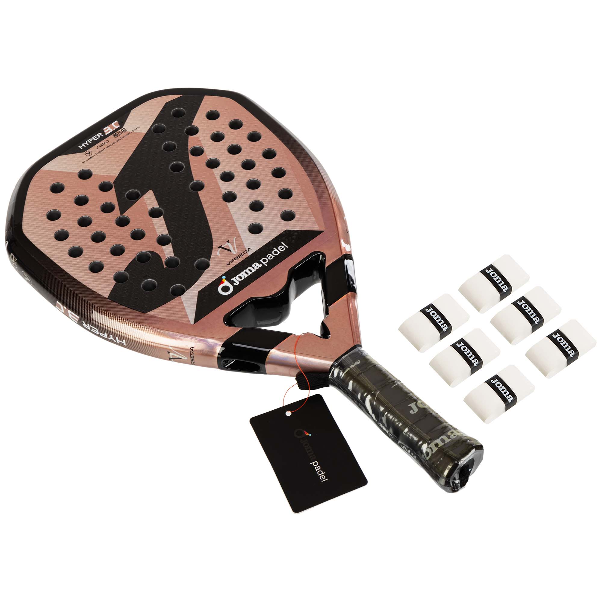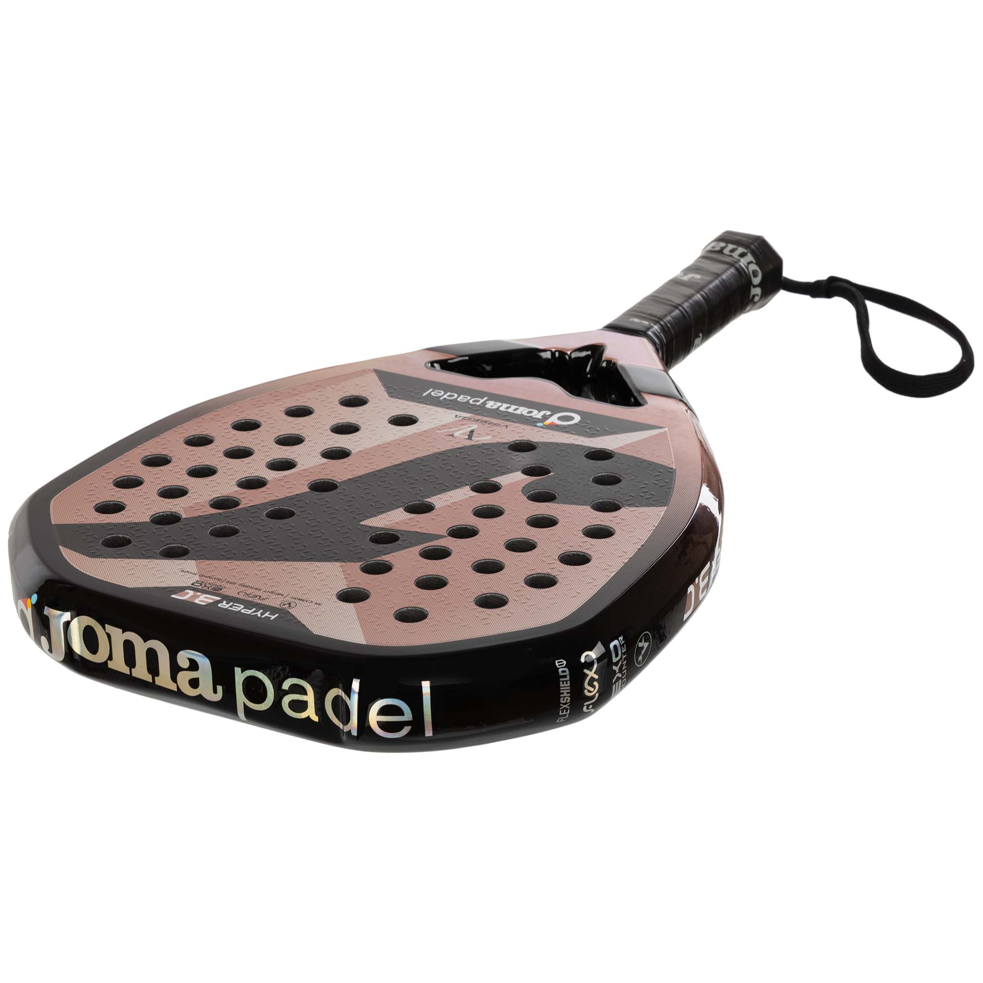 Ракетка для падел-тенісу Joma HYPER 3.0 належить до ексклюзивної лінійки Vero Virseda. Ця ракетка ідеально підійде для гравців, які хочуть отримати оптимальний баланс між контролем і потужністю ударів. Конструкція має вишуканий дизайн і підходить для професійної гри. Ракетка має мінімальну вагу - всього 350-360 г. Баланс розташований ближче до голови. Ракетка має довжину 46 см, що дозволяє легко діставати будь-які м'ячі. Вона підходить для гри як в атакуючому стилі, так і в обороні. Серцевина ракетки виготовлена з інноваційного матеріалу EVA 17. Він має високу щільність, що забезпечує потужний відскок м'яча і чудовий контроль над ним. Поверхня ракетки виготовлена з 3 шарів скловолокна і 3K карбону. Ракетка має оптимальну міцність, гнучкість і зберігає легкість.