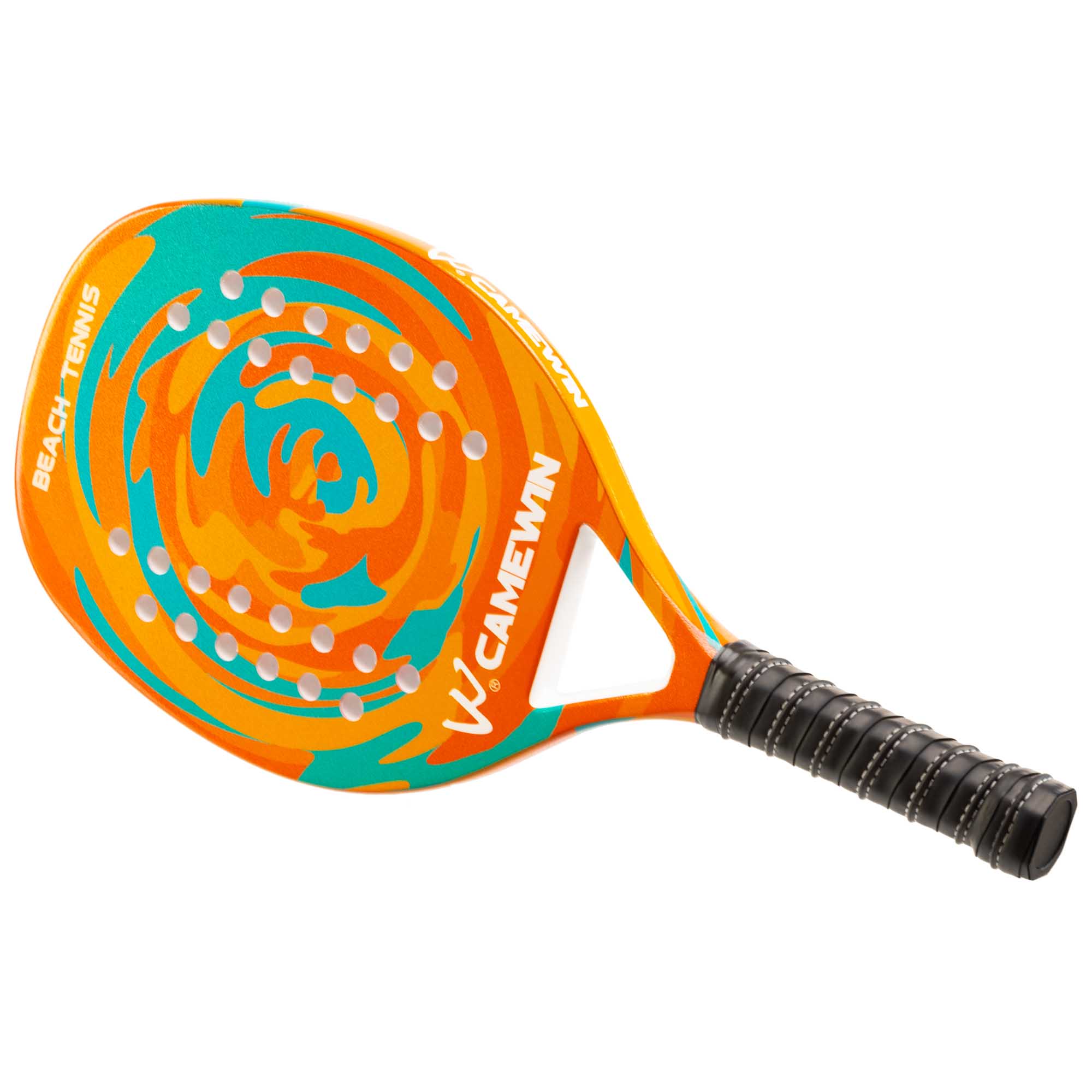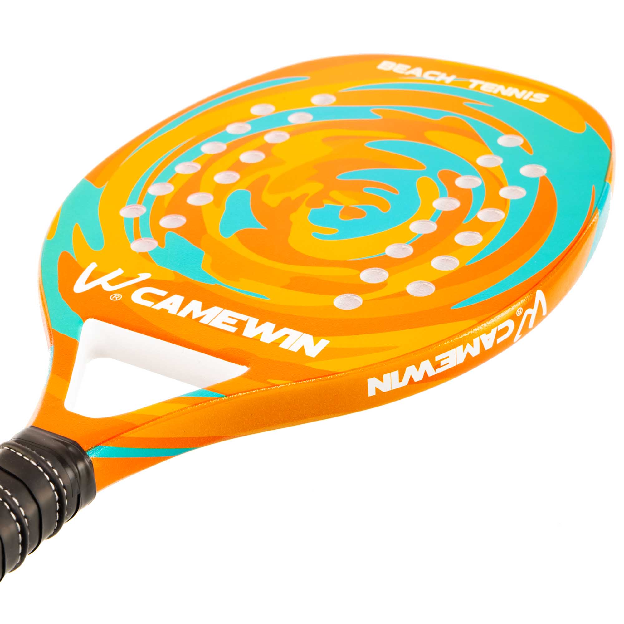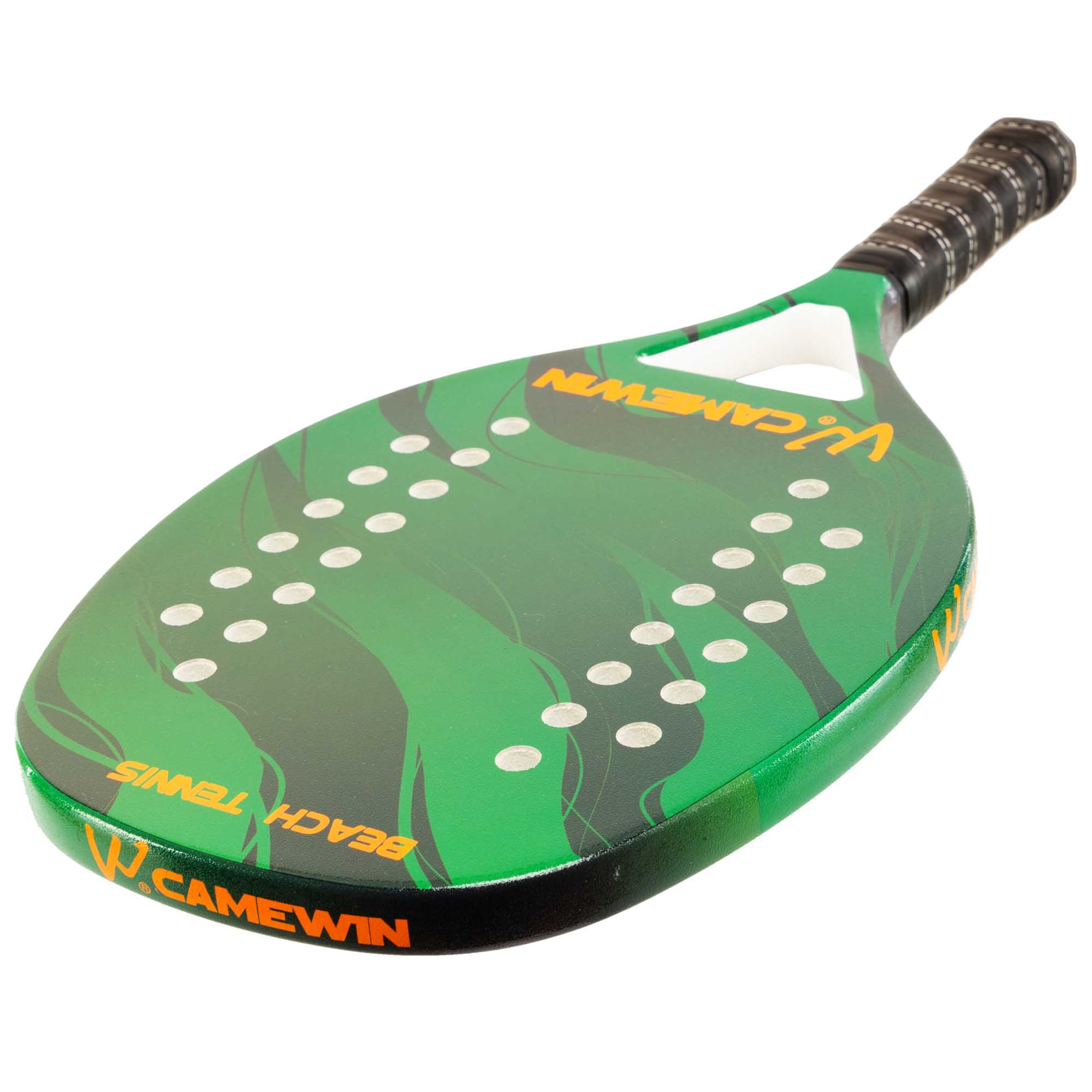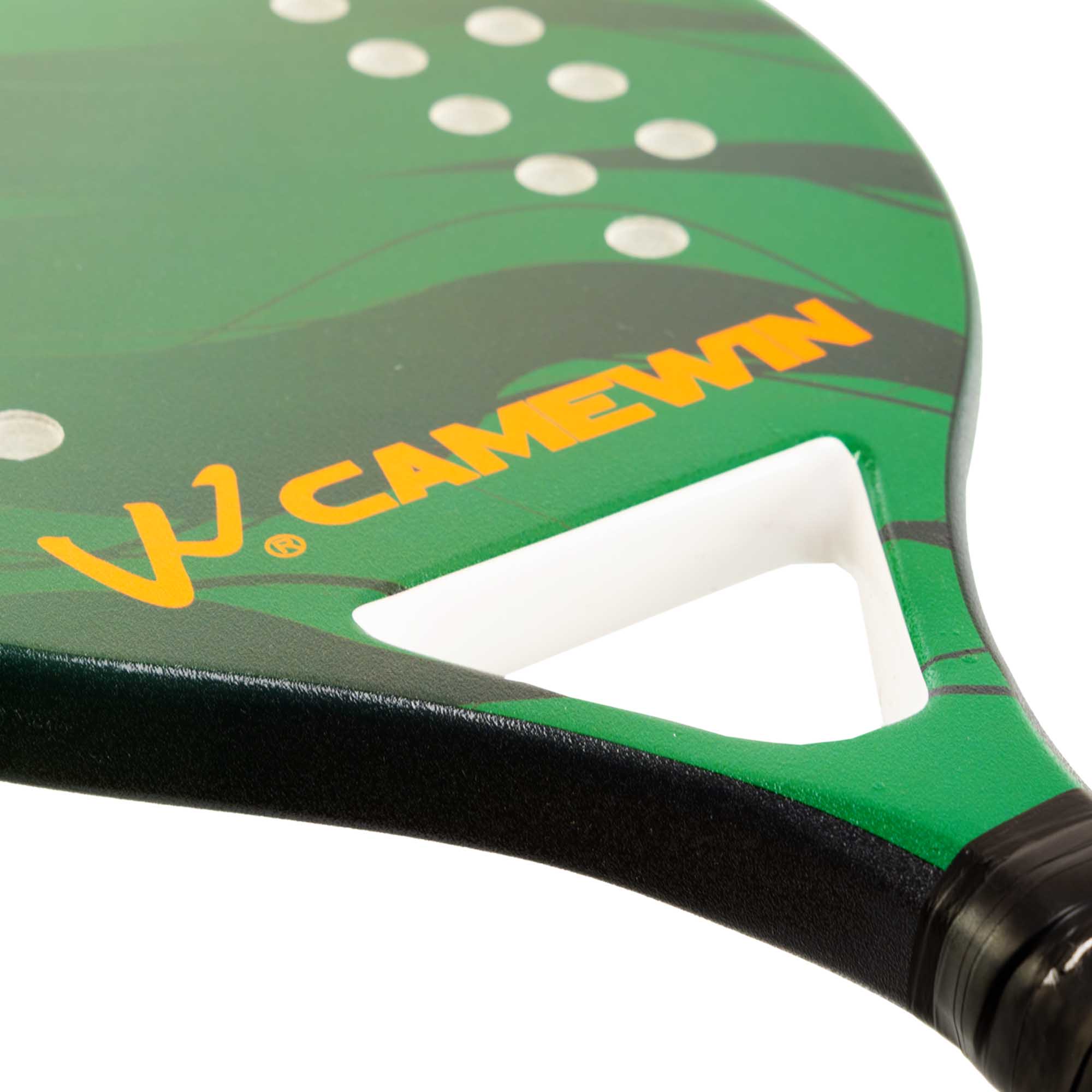 Професійна ракетка для пляжного тенісу CAMEWIN PT-6027 виготовлена з карбону і скловолокна і має м'який сердечник, який забезпечує амортизацію ударного навантаження при зіткненні ракетки з м'ячем. У даній моделі ракетки використовується система Hole Pattern System. Система гарантує поліпшення аеродинаміки за рахунок 28 отворів в ракетці. Щоб спортсмен краще контролював обертання м'яча, виробник зробив покриття ракетки злегка шорстким. Ракетка універсальна, підходить для тих, хто віддає перевагу атакуючій грі, і тих, хто грає від оборони. Навіть при мінімальному замаху відскок м'яча виходить потужним за рахунок використання карбону в конструкції ракетки. Намотка на ручці вбирає вологу і перешкоджає прослизанню руки.