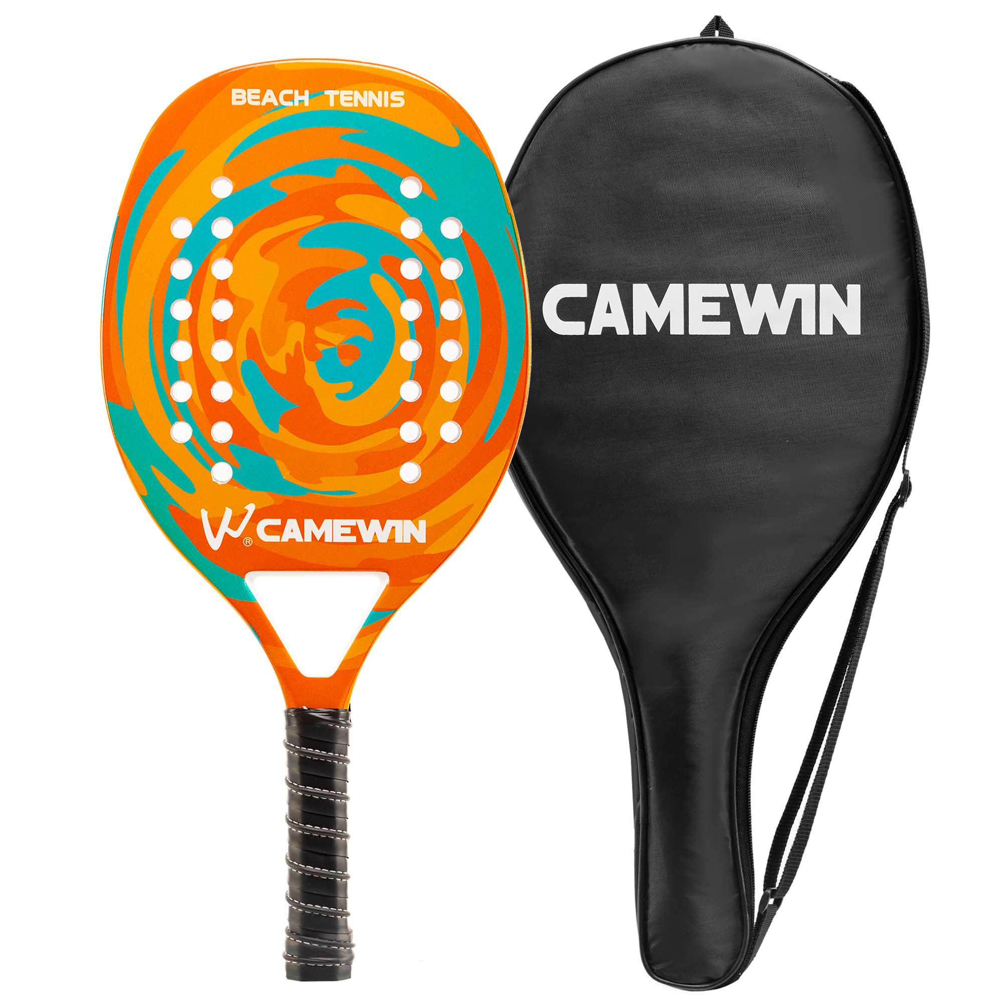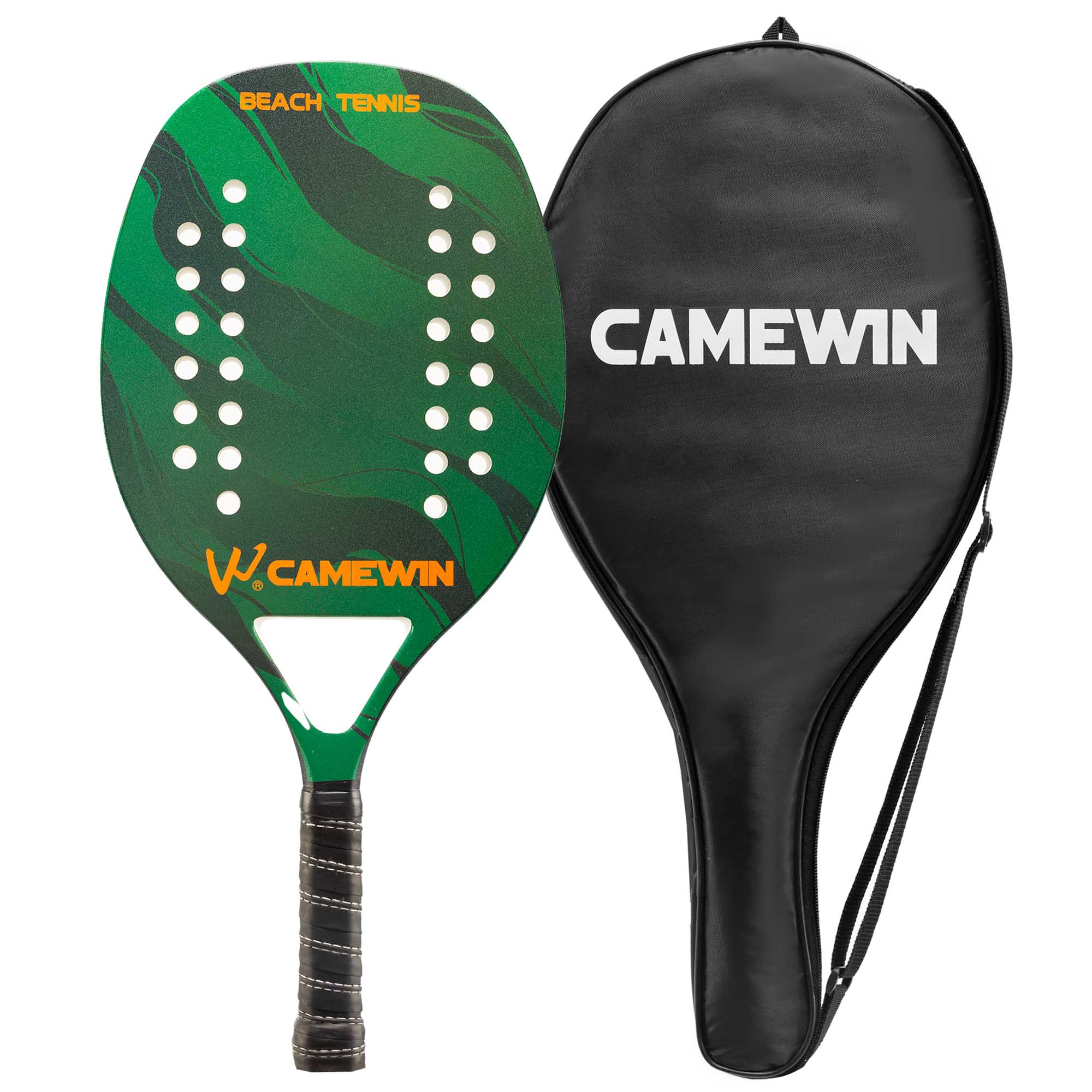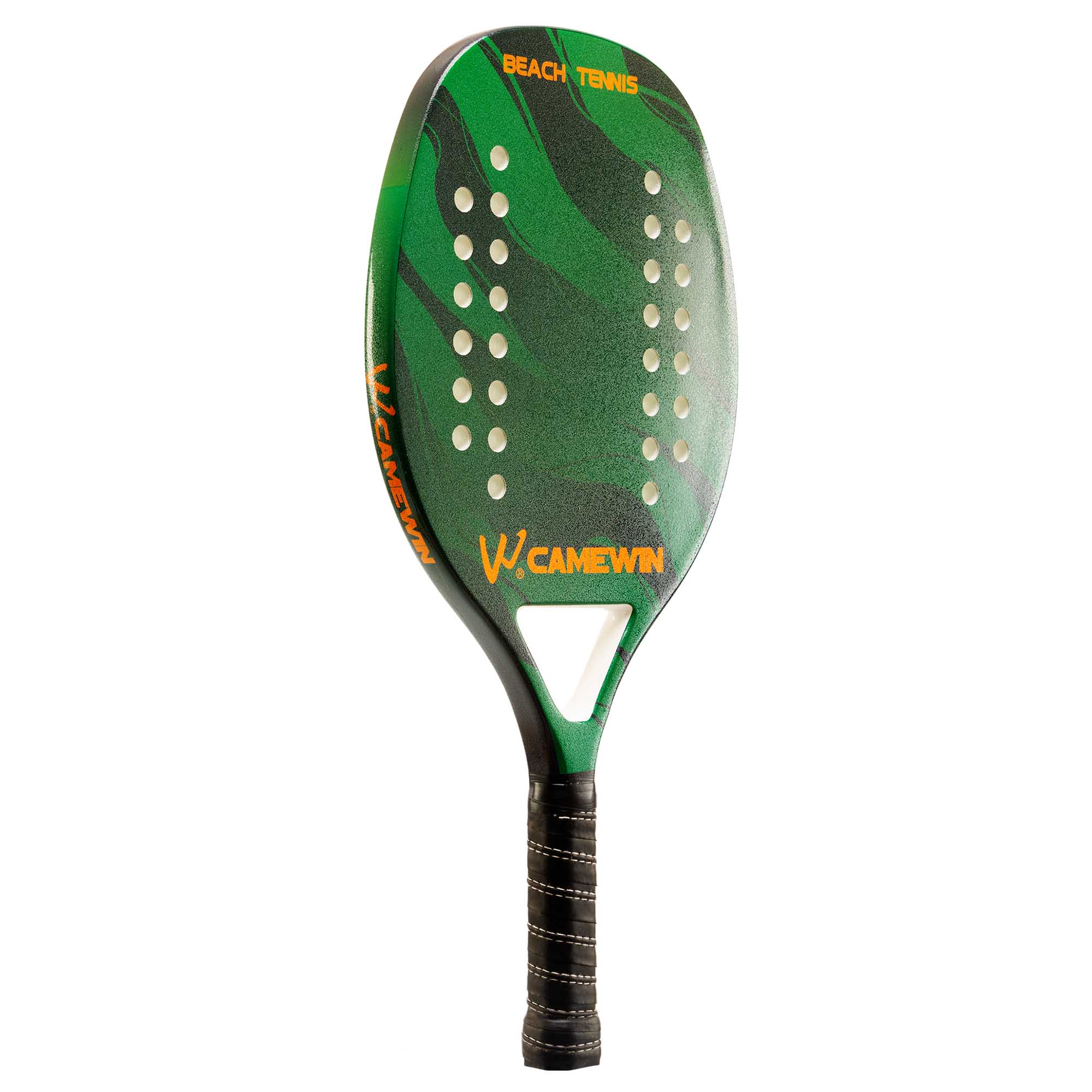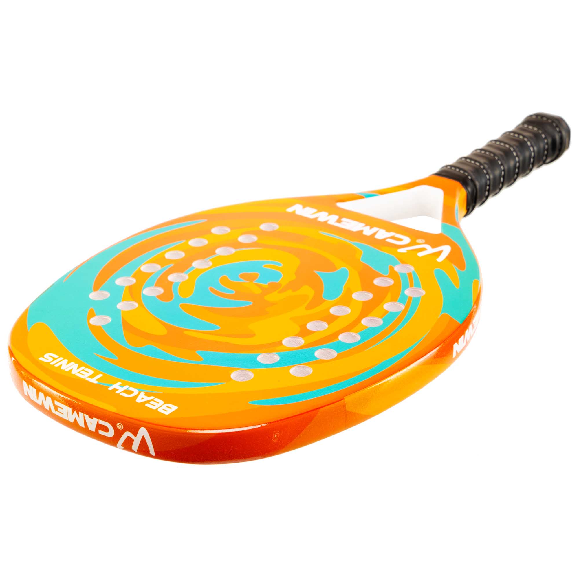 Професійна ракетка для пляжного тенісу CAMEWIN PT-6027 виготовлена з карбону і скловолокна і має м'який сердечник, який забезпечує амортизацію ударного навантаження при зіткненні ракетки з м'ячем. У даній моделі ракетки використовується система Hole Pattern System. Система гарантує поліпшення аеродинаміки за рахунок 28 отворів в ракетці. Щоб спортсмен краще контролював обертання м'яча, виробник зробив покриття ракетки злегка шорстким. Ракетка універсальна, підходить для тих, хто віддає перевагу атакуючій грі, і тих, хто грає від оборони. Навіть при мінімальному замаху відскок м'яча виходить потужним за рахунок використання карбону в конструкції ракетки. Намотка на ручці вбирає вологу і перешкоджає прослизанню руки.