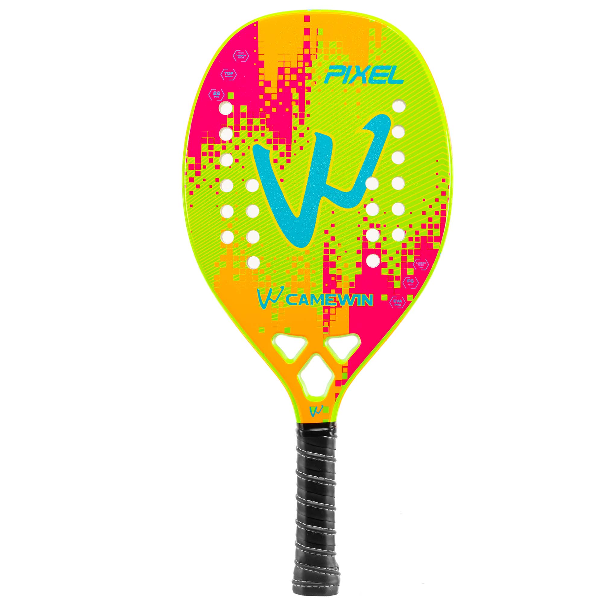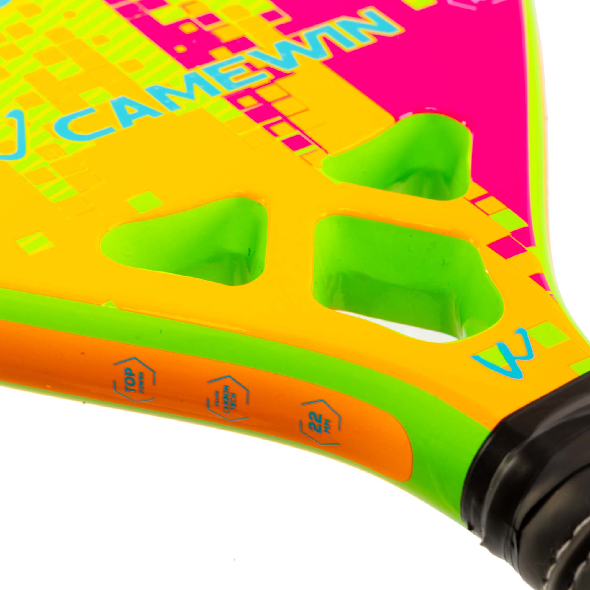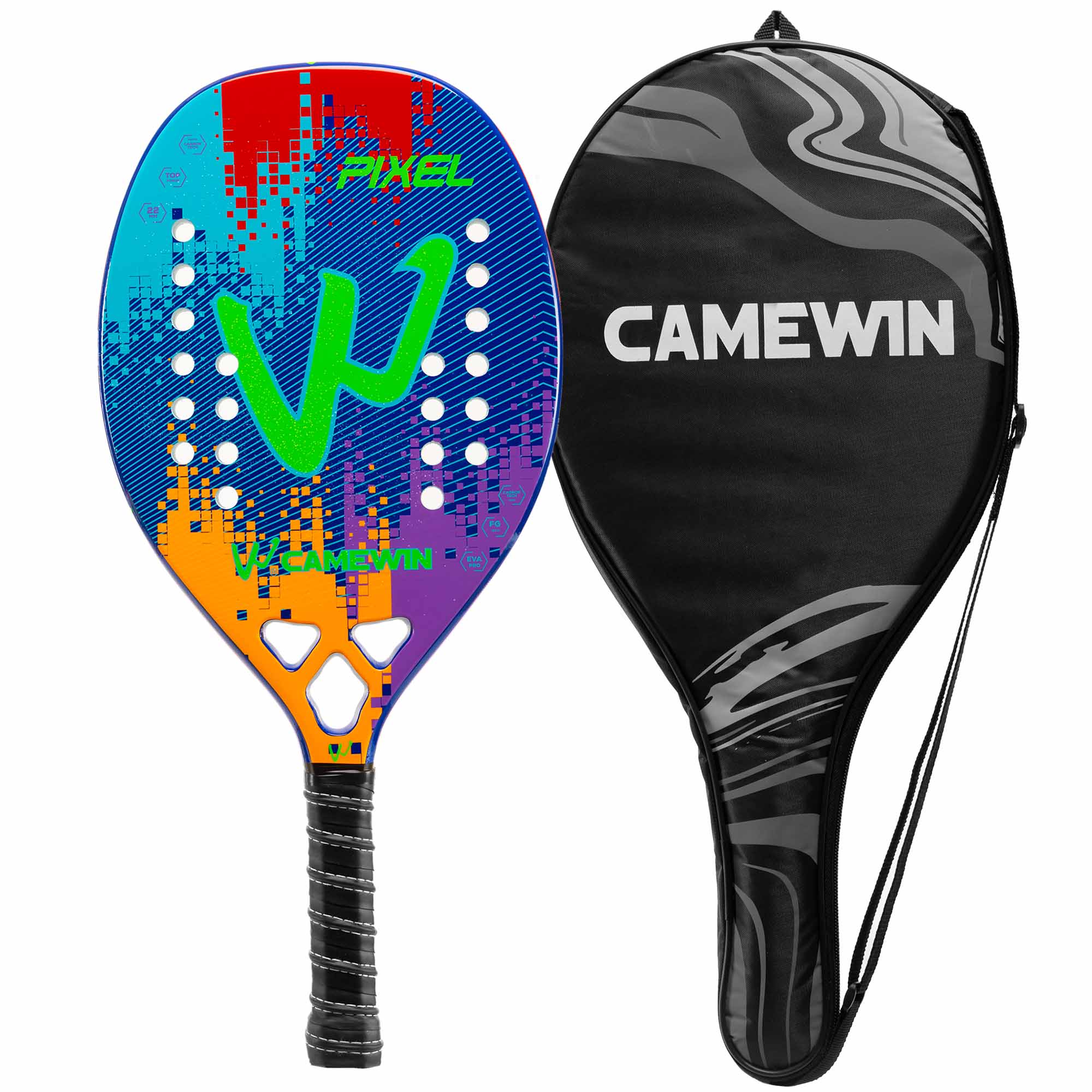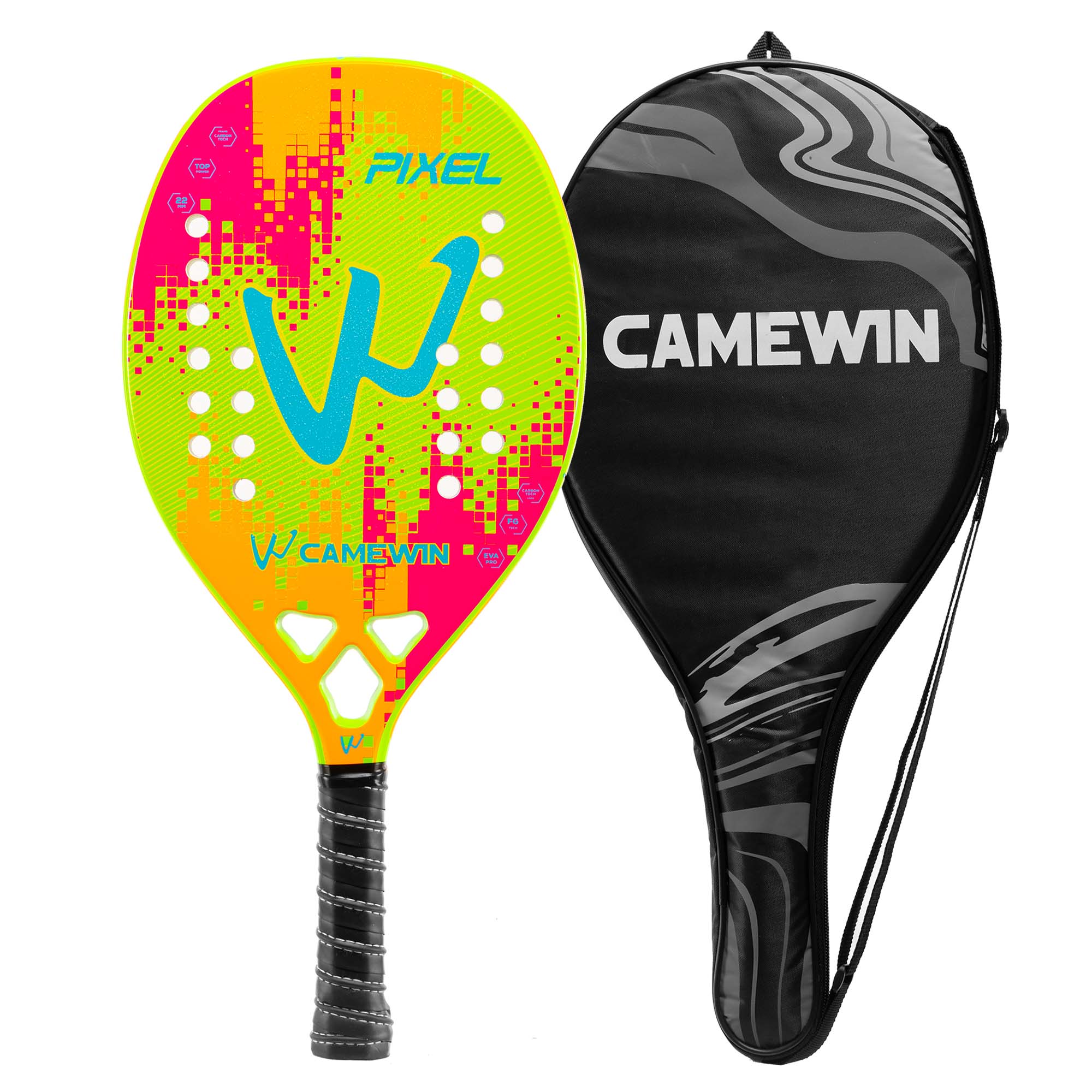 Професійна ракетка для гри в пляжний теніс CAMEWIN PT-6034 має вагу 320 г і виготовлена з сучасних зносостійких міцних матеріалів. Ракетка відрізняється високою міцністю, легкістю і ергономічністю завдяки використанню при виготовленні рами карбону і скловолокна. М'який сердечник з EVA амортизує ударне навантаження. Текстурована поверхня дозволяє надавати м'ячу обертання при ударі. Професійний інвентар забезпечує відмінний контроль і дозволяє виконувати удари з високою точністю. Ширина ракетки становить 22 см, а довжина - 50 см. Вона має овальну форму голови. У ній передбачено 28 отворів. Ракетка комплектується чохлом для зберігання і транспортування.