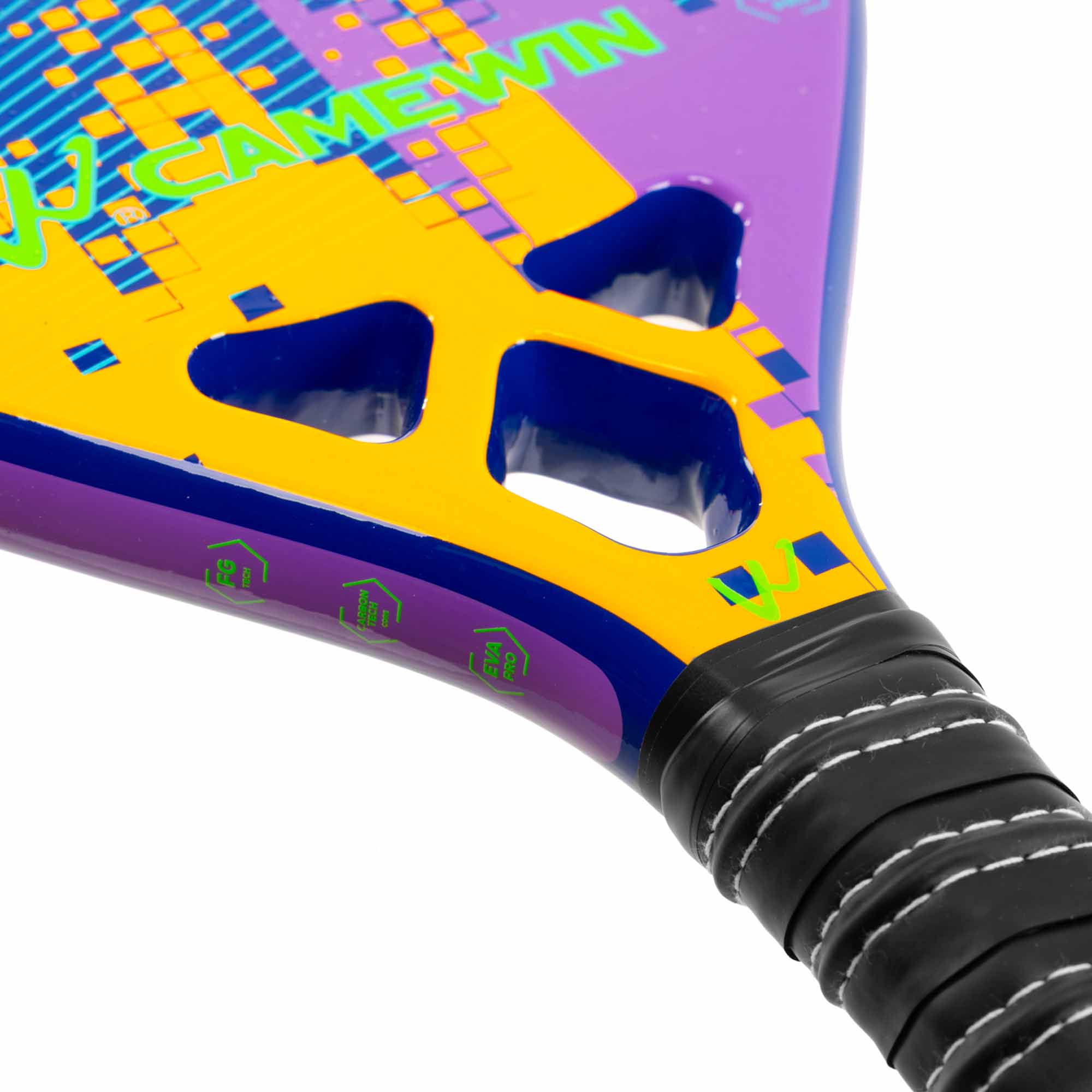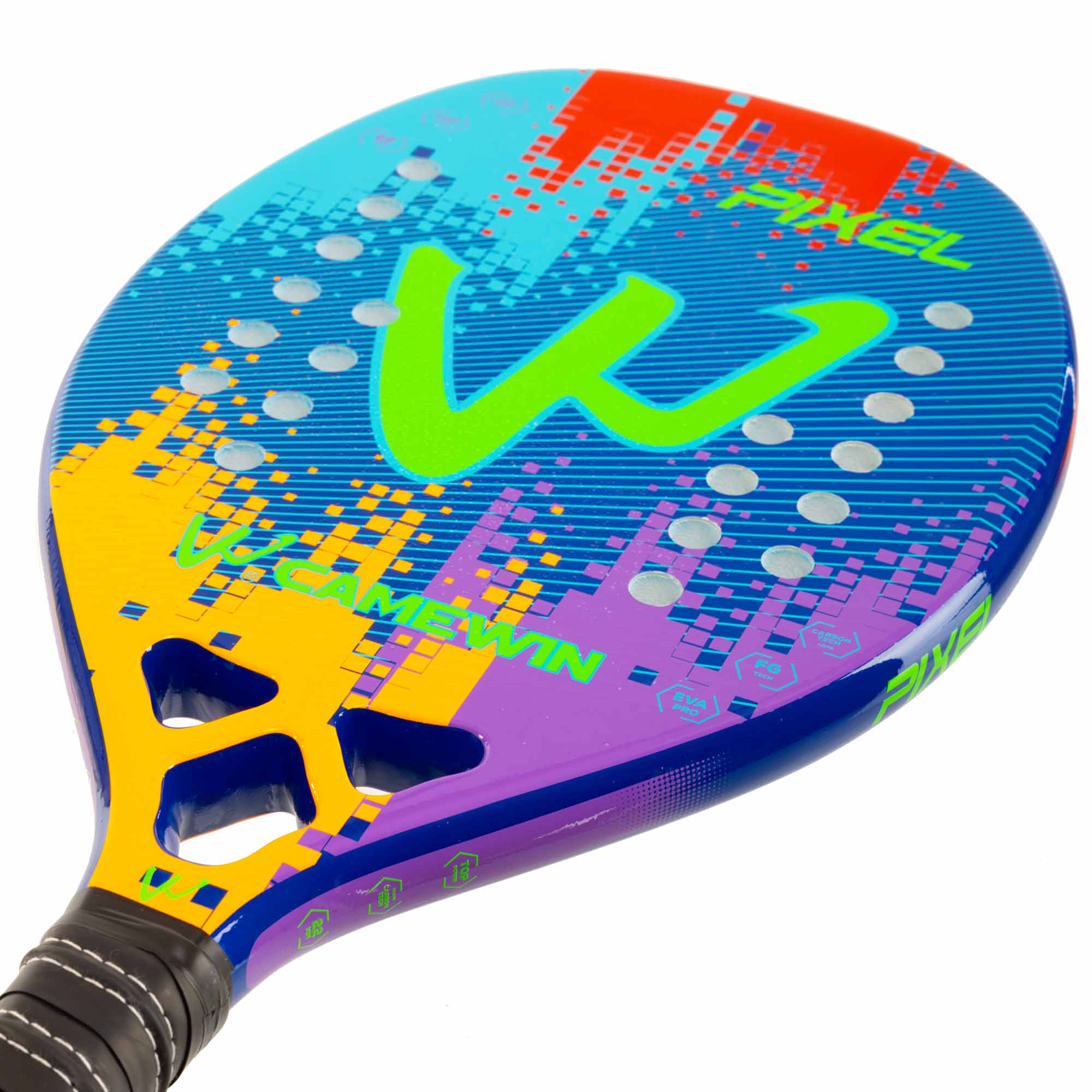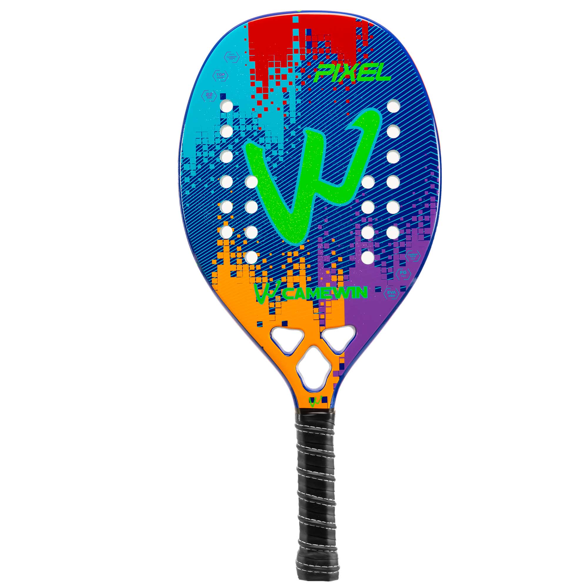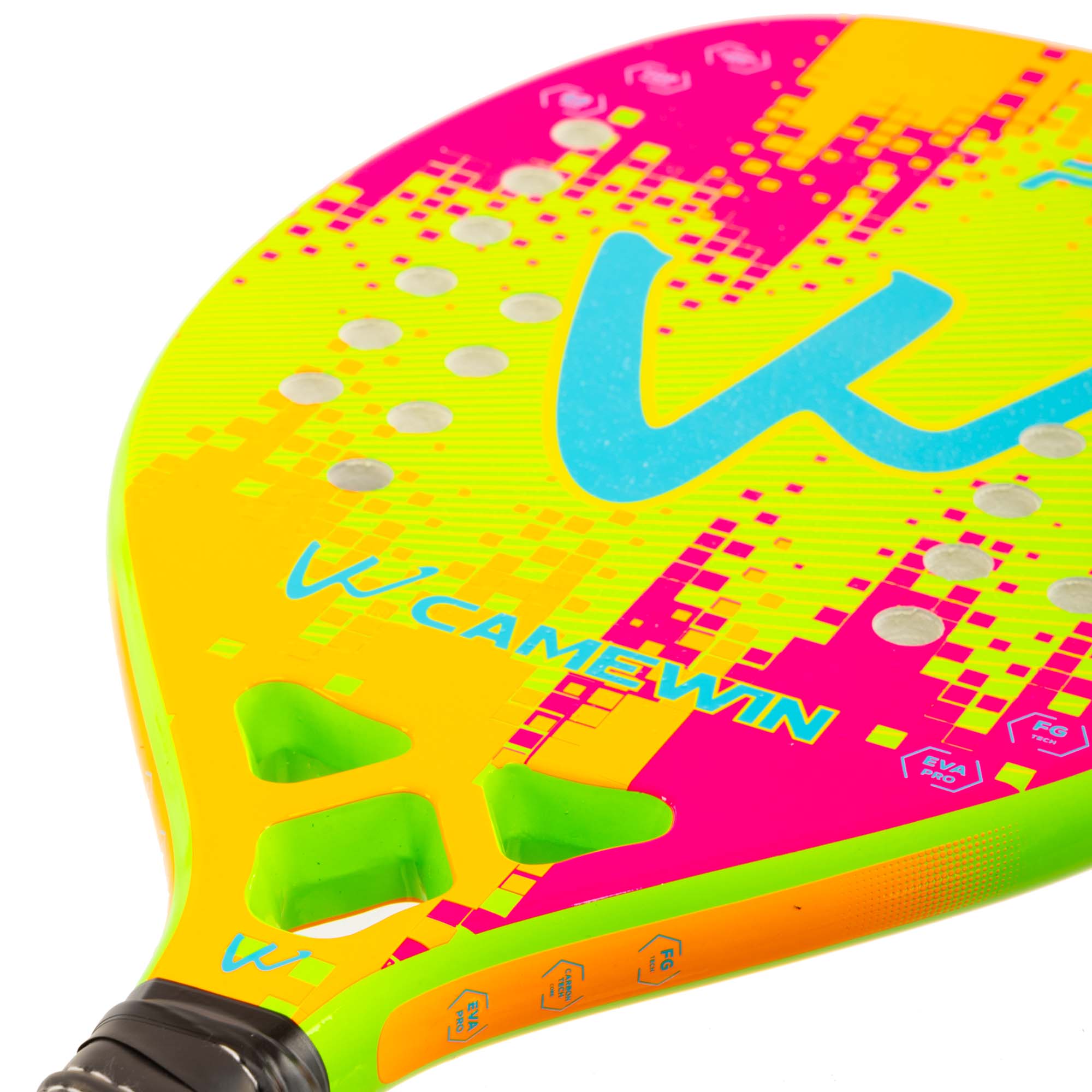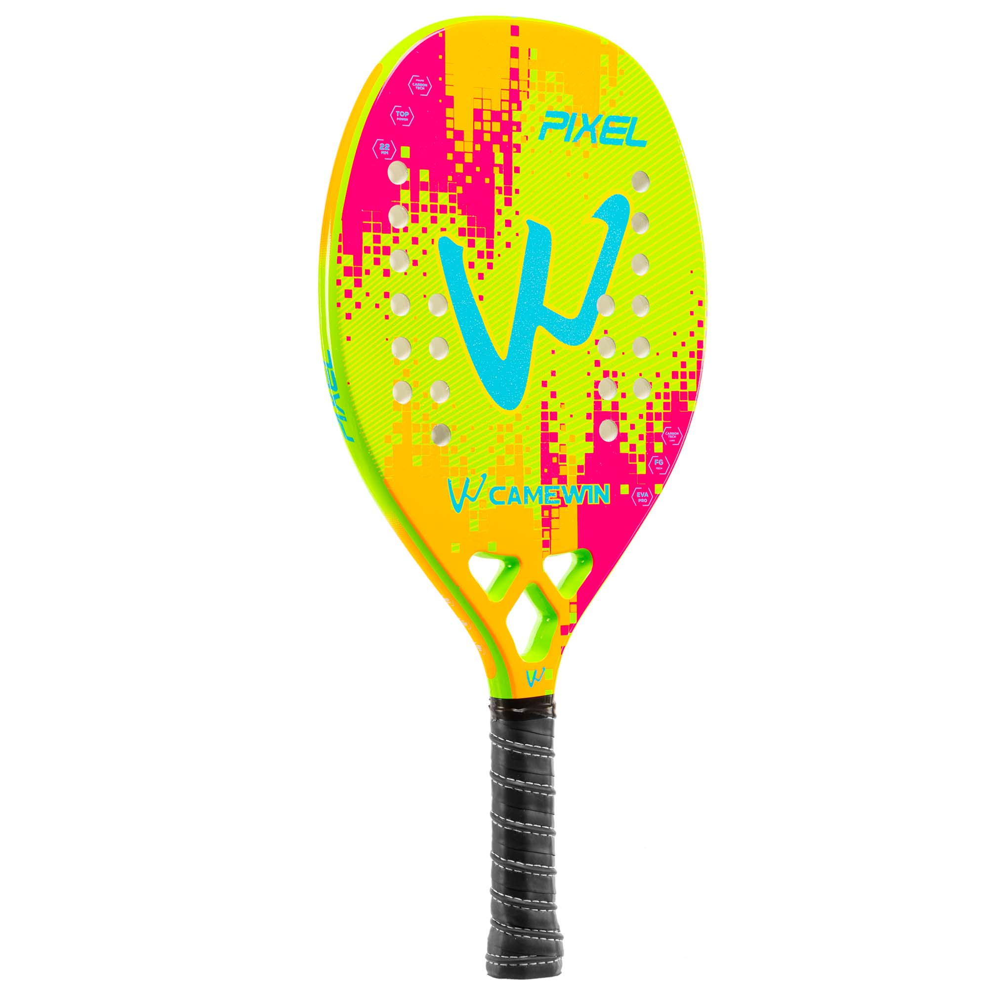 Професійна ракетка для гри в пляжний теніс CAMEWIN PT-6034 має вагу 320 г і виготовлена з сучасних зносостійких міцних матеріалів. Ракетка відрізняється високою міцністю, легкістю і ергономічністю завдяки використанню при виготовленні рами карбону і скловолокна. М'який сердечник з EVA амортизує ударне навантаження. Текстурована поверхня дозволяє надавати м'ячу обертання при ударі. Професійний інвентар забезпечує відмінний контроль і дозволяє виконувати удари з високою точністю. Ширина ракетки становить 22 см, а довжина - 50 см. Вона має овальну форму голови. У ній передбачено 28 отворів. Ракетка комплектується чохлом для зберігання і транспортування.