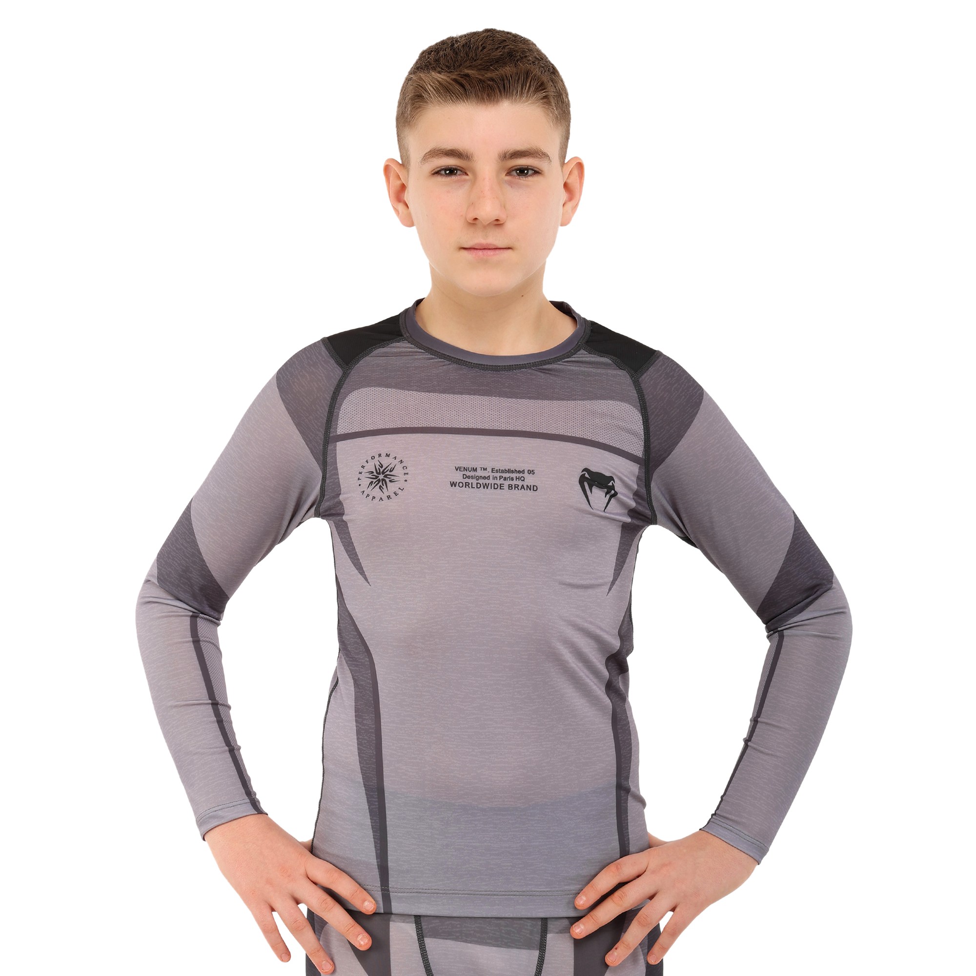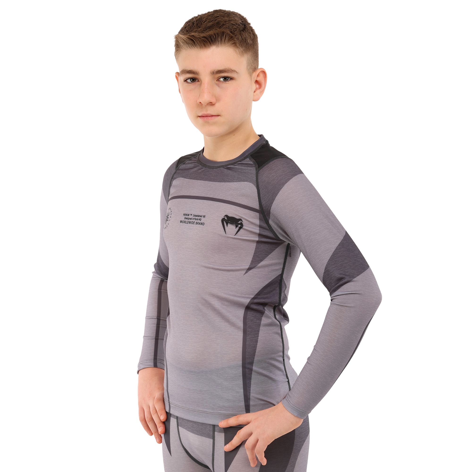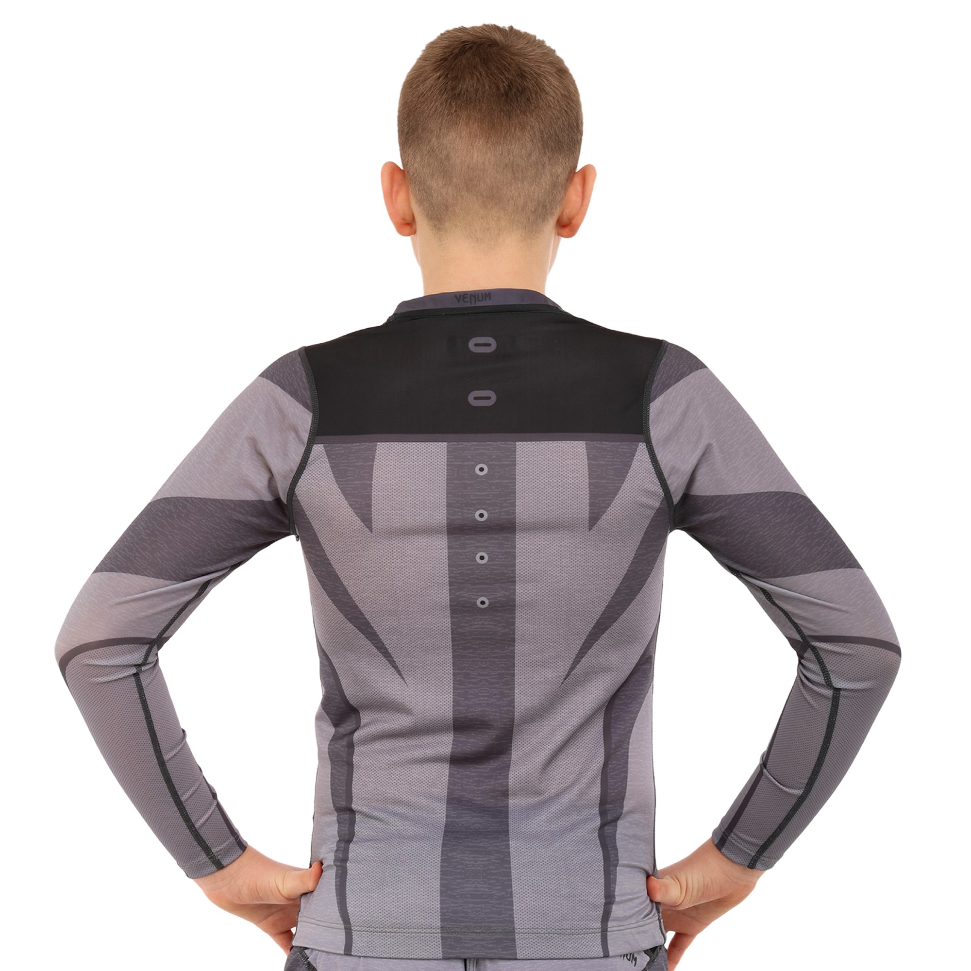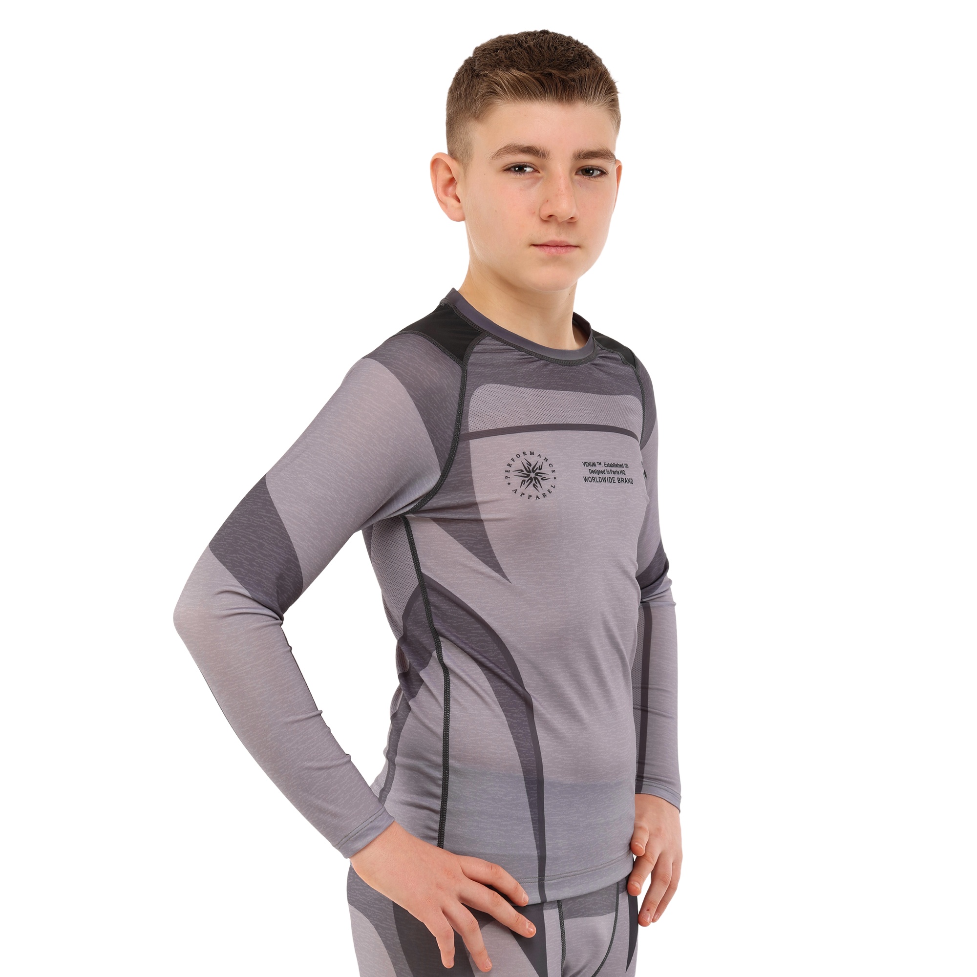 Рашгард з довгим рукавом призначений для хлопчиків. Тканина еластична і добре тягнеться, легко адаптується до обрисів тіла спортсмена. Використання лонгслів дозволяє підтримувати оптимальну температуру тіла протягом усього тренування. Під час занять єдиноборствами такий виріб захищає шкіру від контакту з татамі. Компресійний одяг надає м'язам підтримку, зменшує больові відчуття після тренування.