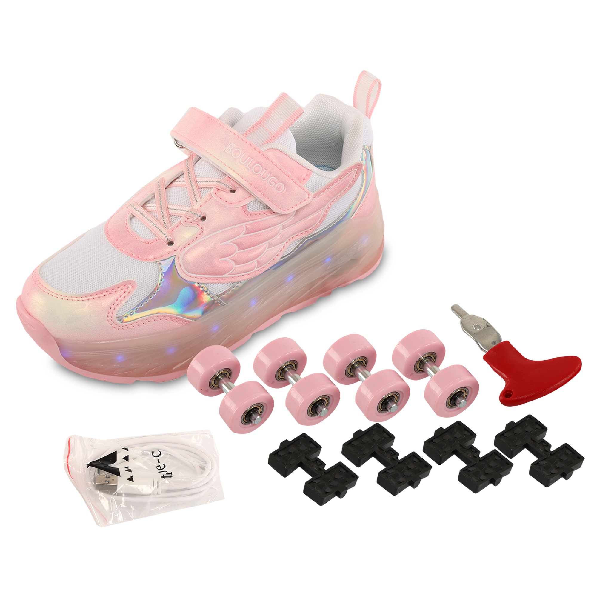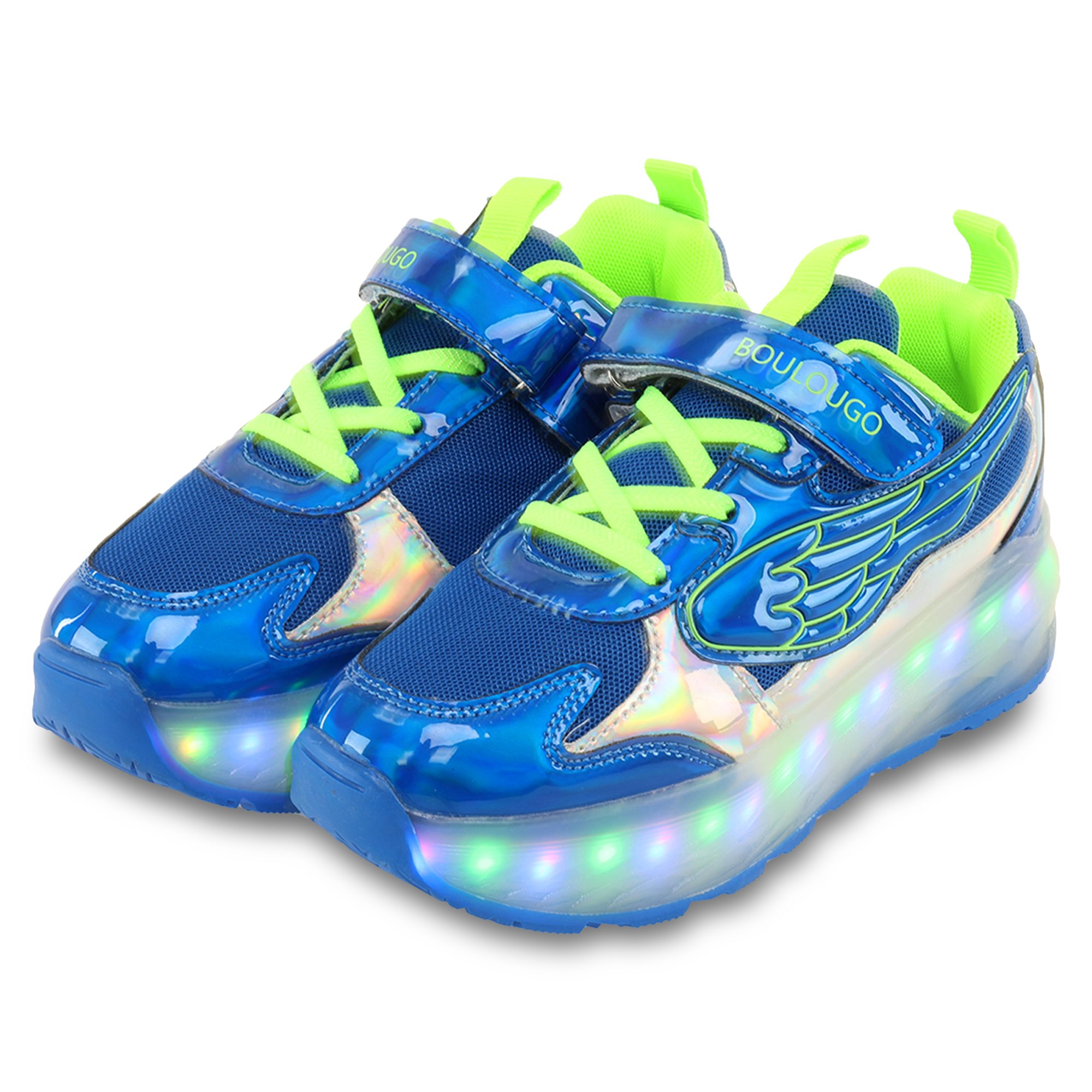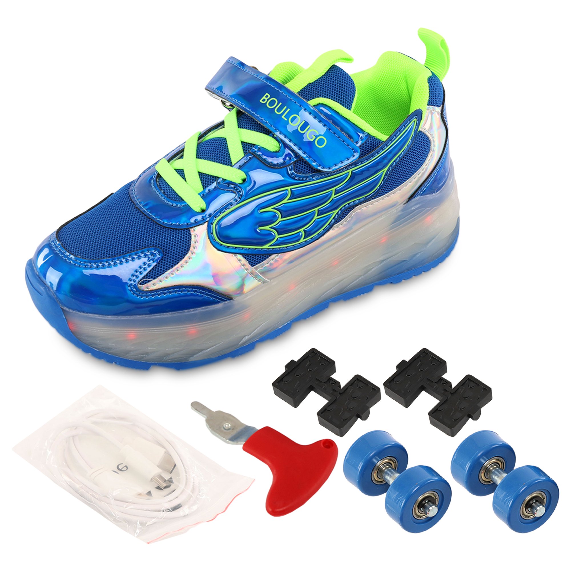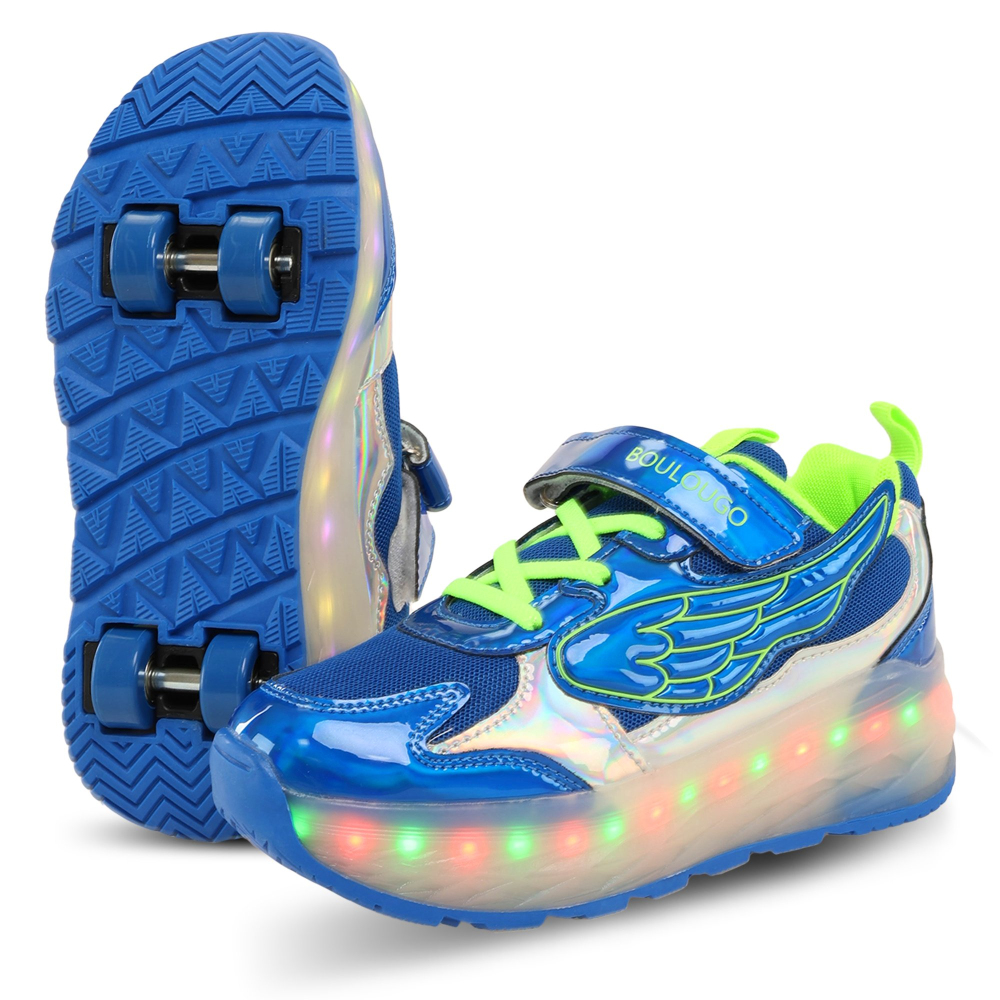 Роликові кросівки Huoleguo OB-6447 призначені для дітей і можуть витримати навантаження до 80 кг. Взуття оснащене підсвічуванням, яке працює від акумулятора. Комплект постачання включає кабель для зарядки, який підключається до прихованого USB-порту. Підсвічування світиться 7 різними кольорами і працює в 16 різних режимах. Шнурівка і липучка забезпечують надійну фіксацію на ногах і дуже зручну посадку.