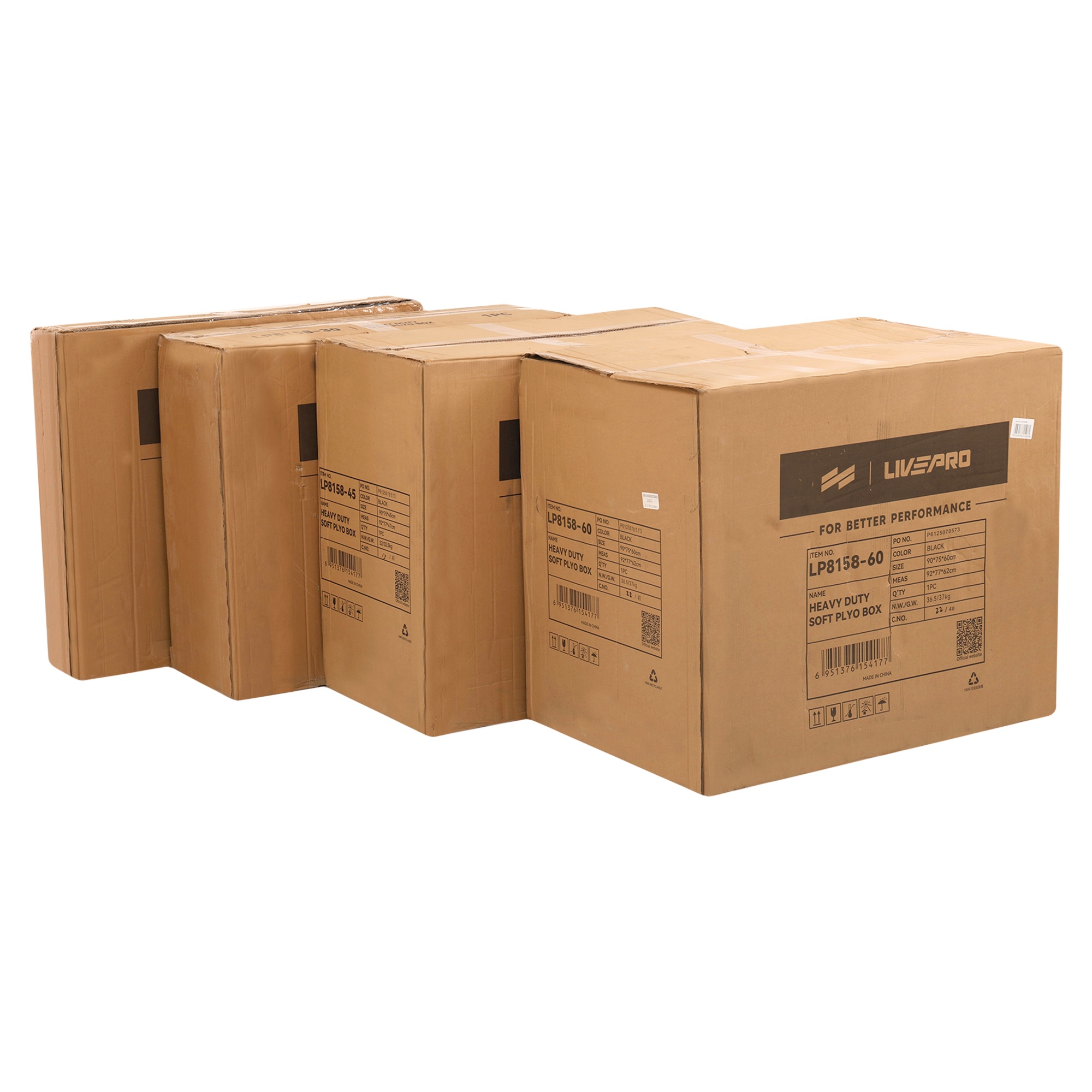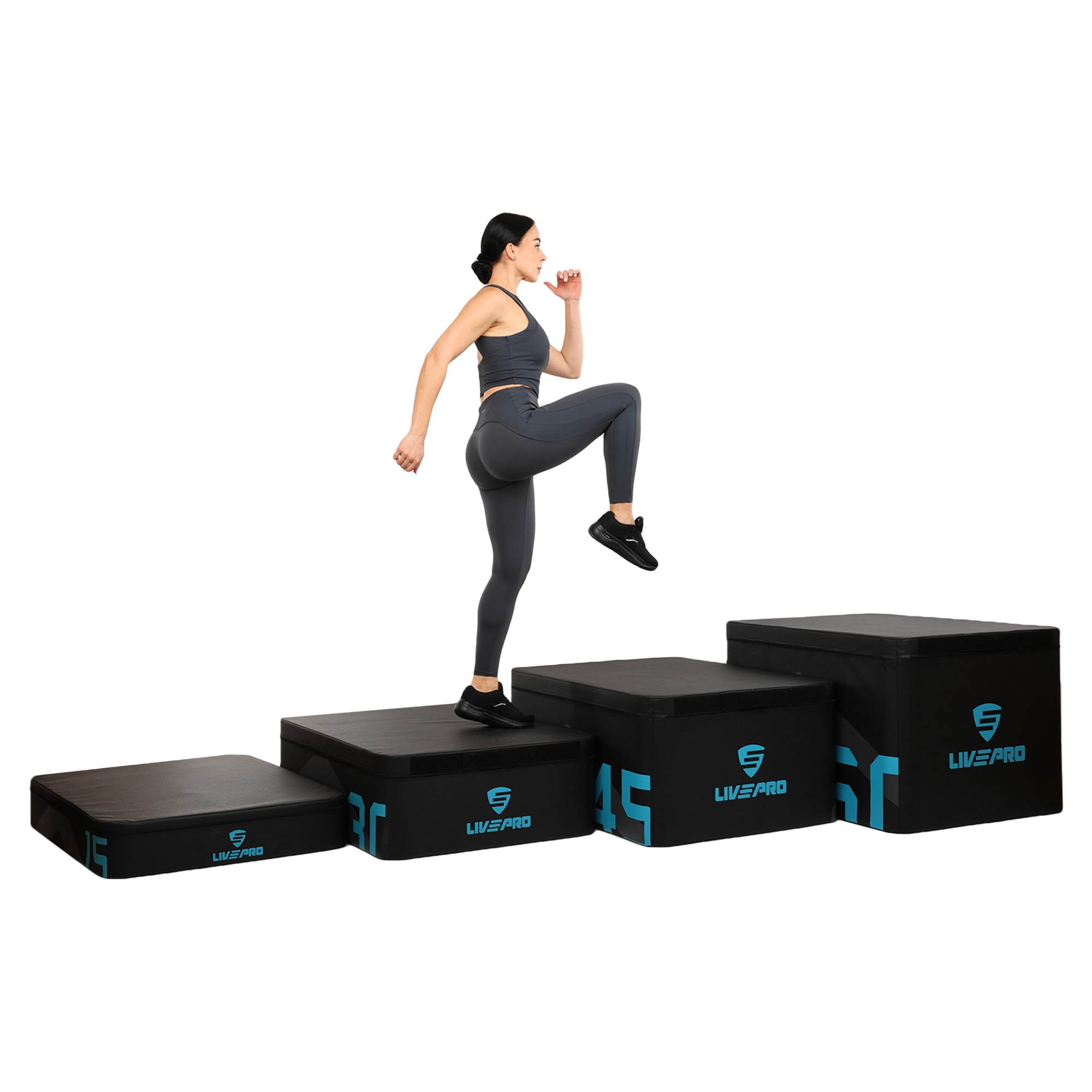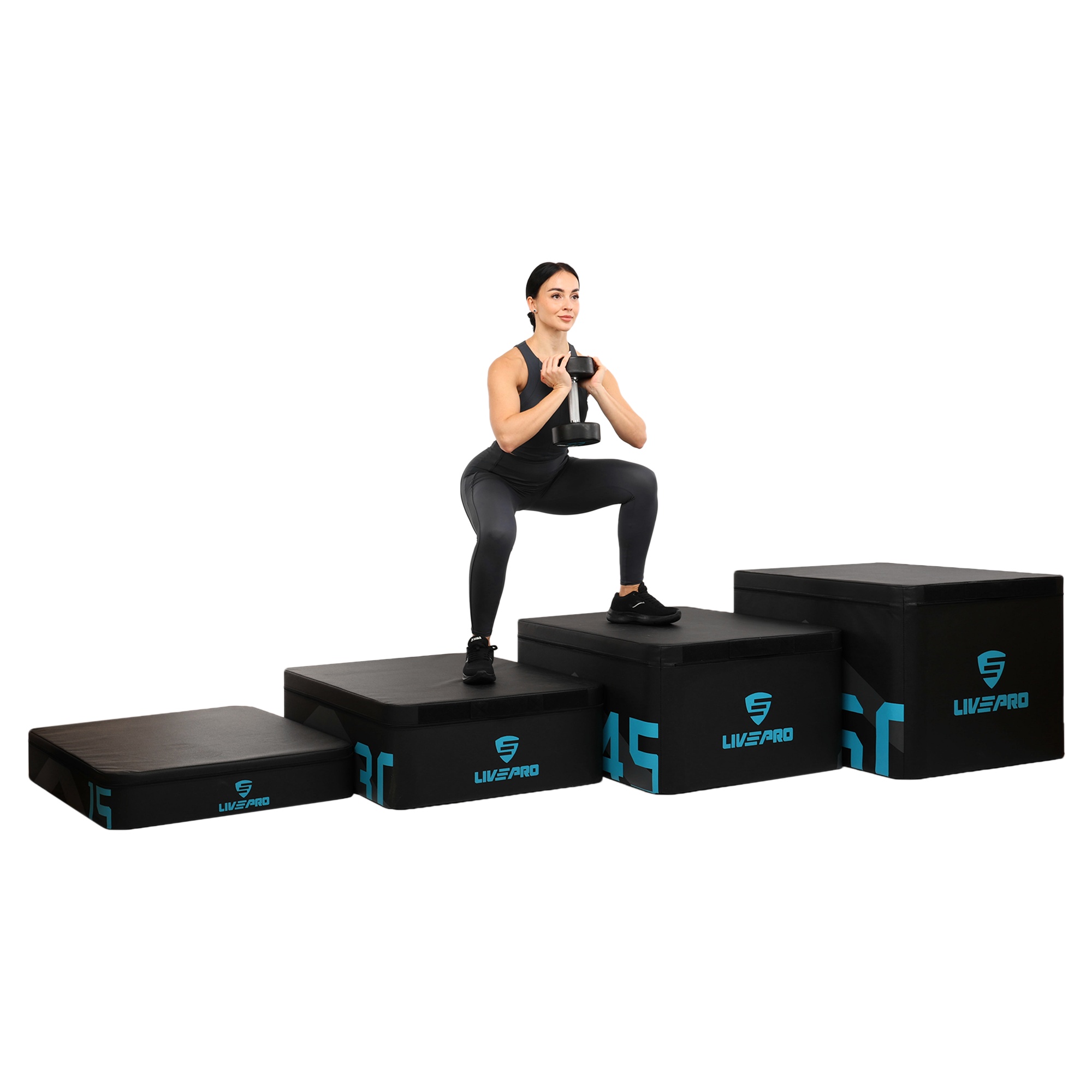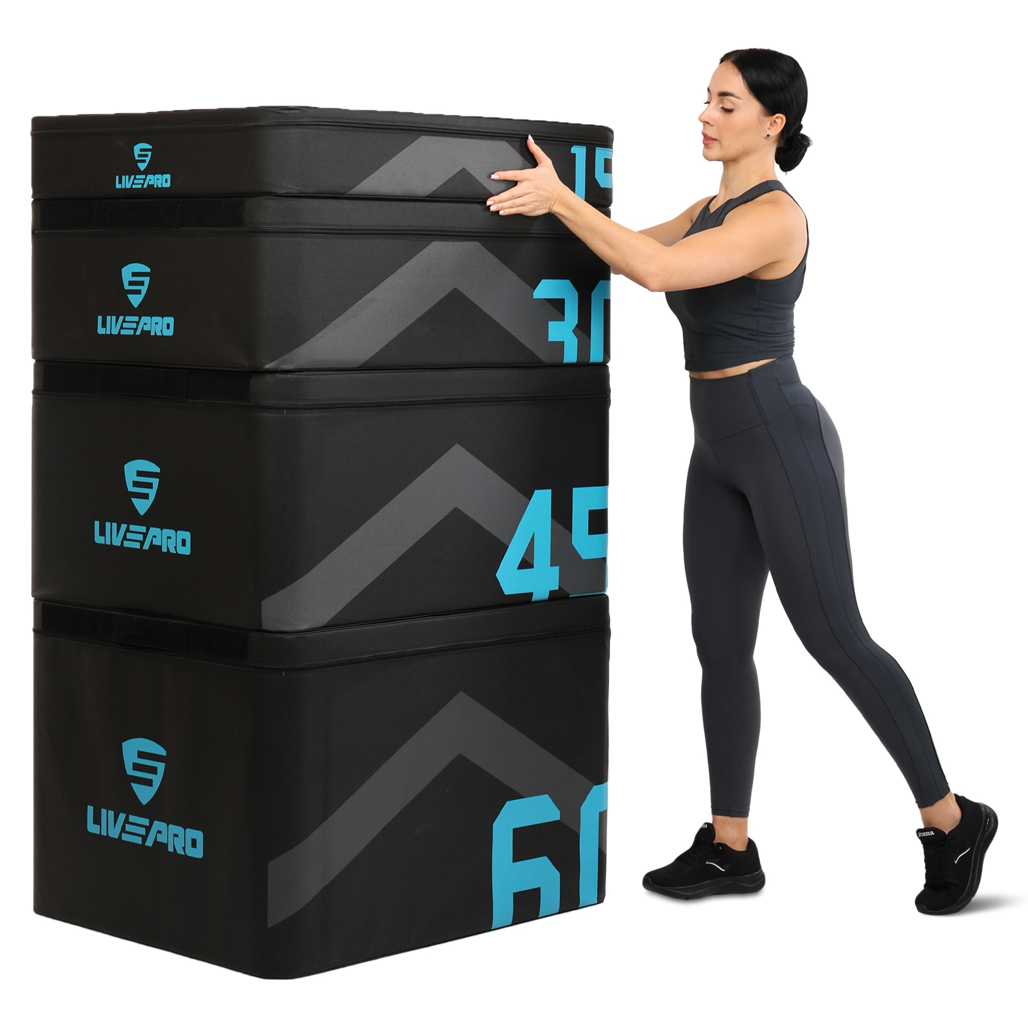 В комплекте четыре плиобокса высотой 15, 30, 45 и 60 см. Их можно использовать по отдельности или комбинировать между собой. Вес и размер боксов позволяют проводить тренировки различной сложности, плавно наращивать нагрузку и отслеживать прогресс.