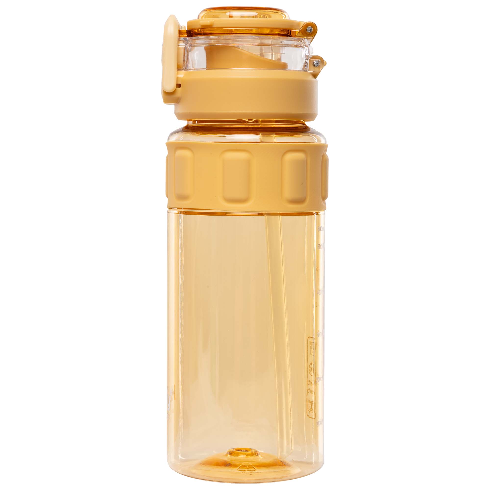 Материал — поликарбонат (PC). Этот прочный и лёгкий материал устойчив к ударам, не боится падений и сохраняет прозрачность даже при активном использовании. Он не впитывает запахи и сохраняет вкус напитка неизменным. Бутылка остаётся как новая после месяцев регулярного использования.