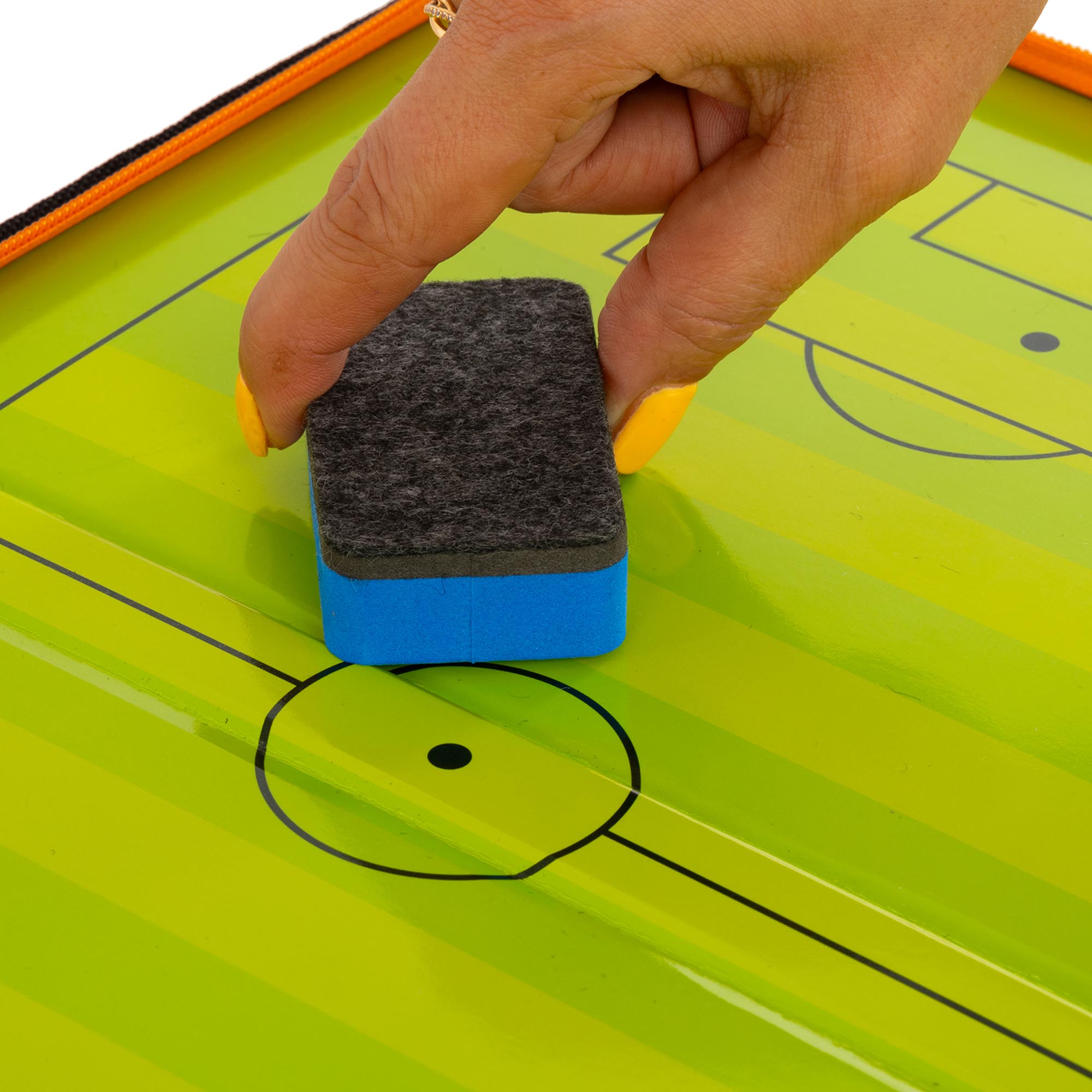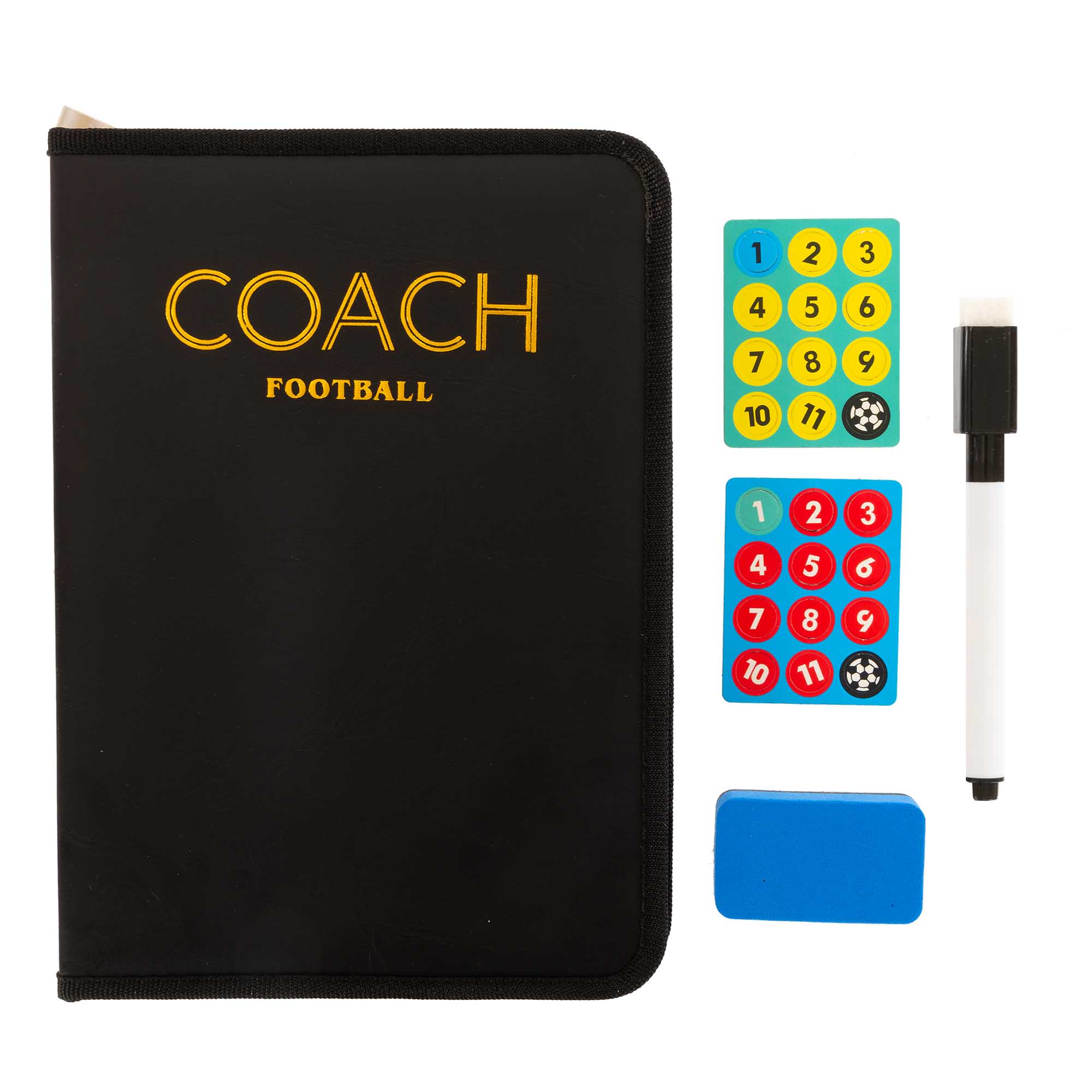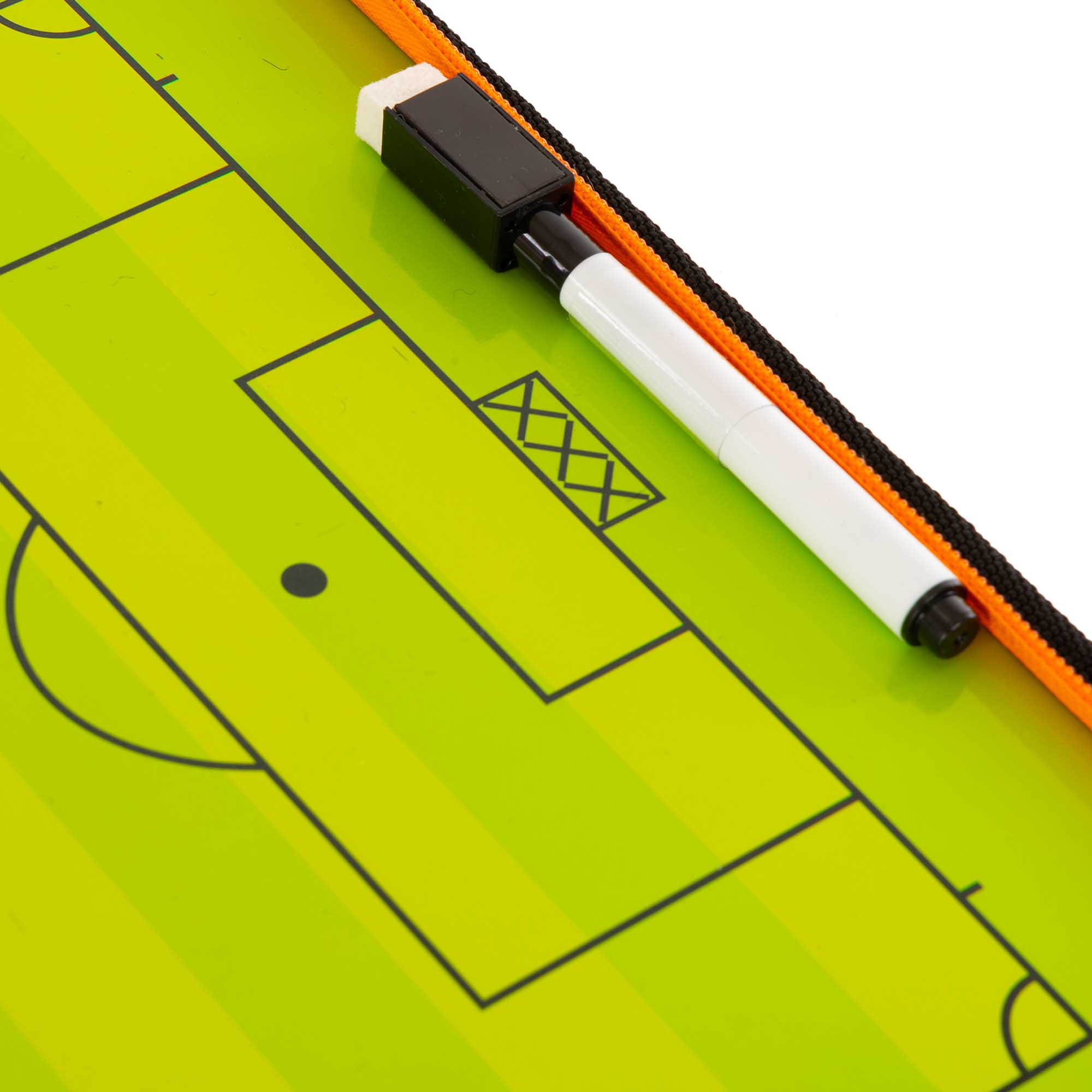 Папку из мягкой, приятной на ощупь эко-кожи удобно брать с собой на тренировки и матчи. Внутри расположена тактическая доска 42х28,5 см с полем для размещения игроков, линиями и воротами. Магнитная поверхность игрового поля позволяет размещать фишки и предотвращает их потерю или смещение. Это упрощает использование аксессуара во время матчей и позволяет тренеру передавать игрокам визуальные подсказки. Для детальной прорисовки схем предназначен специальный маркер.
