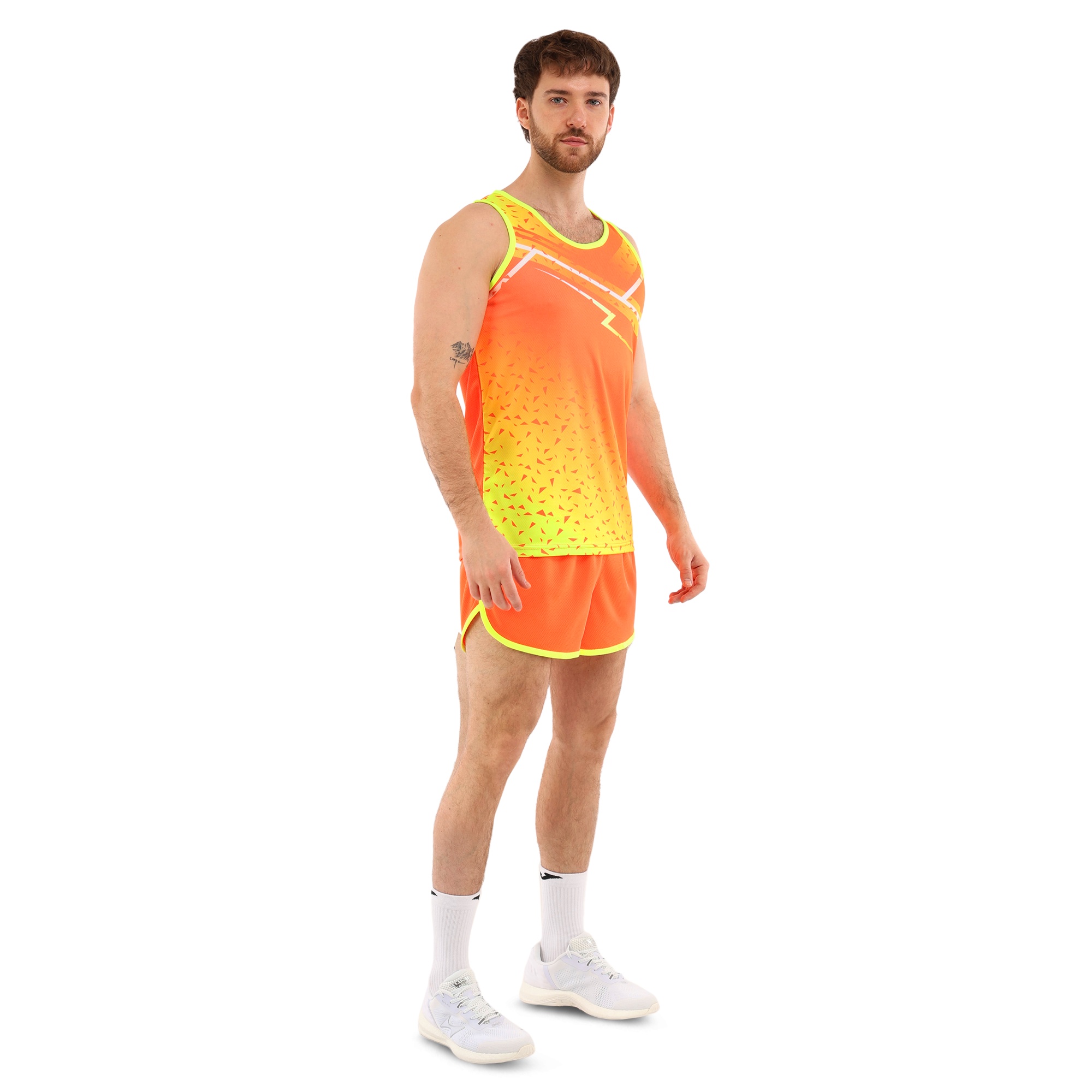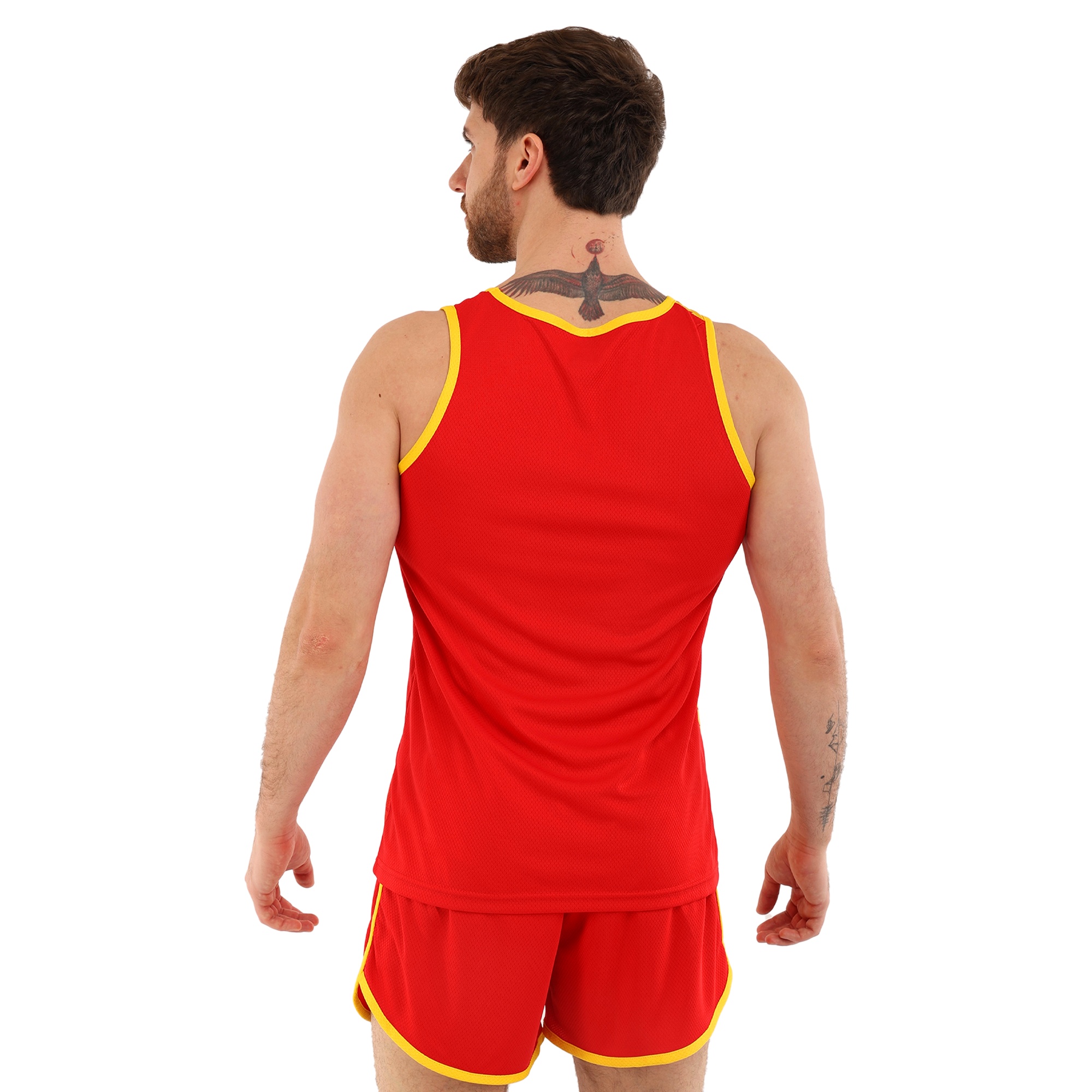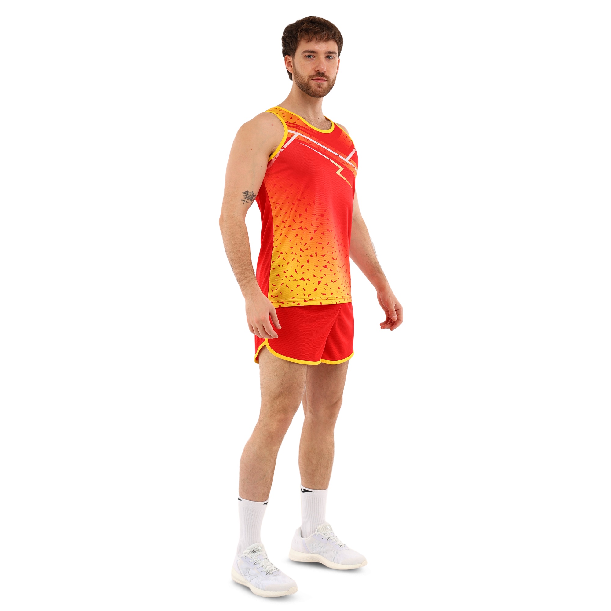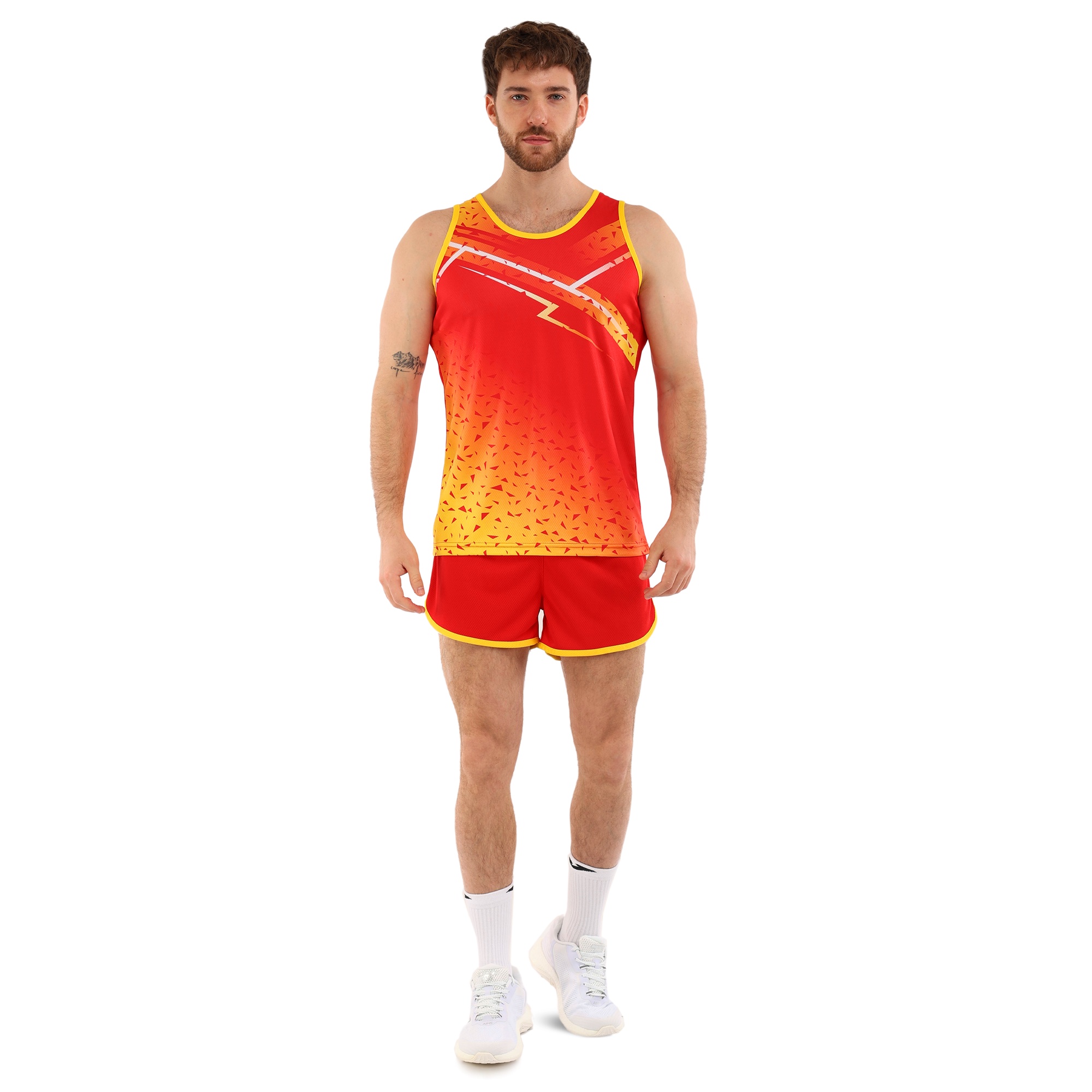 Форма состоит из двух частей: шорт и майки, выполненных из высококачественного полиэстера. Полиэстер – это синтетический материал, славящийся своими отличными эксплуатационными характеристиками. Он устойчив к износу, не выгорает на солнце, быстро сохнет и не теряет форму даже после многочисленных стирок. Этот материал обладает хорошей воздухопроницаемостью, что особенно важно при интенсивных физических нагрузках, поскольку обеспечивает оптимальную терморегуляцию и предотвращает перегрев.Шорты короткие, на резинке, что обеспечивает надежную фиксацию на талии и комфортное прилегание к телу. Благодаря эластичному поясу шорты не сдавливают и не натирают кожу, что делает их идеальными для длительных тренировок. Короткая длина модели обеспечивает полную свободу движений, не ограничивая атлета ни в беге, ни в прыжках.