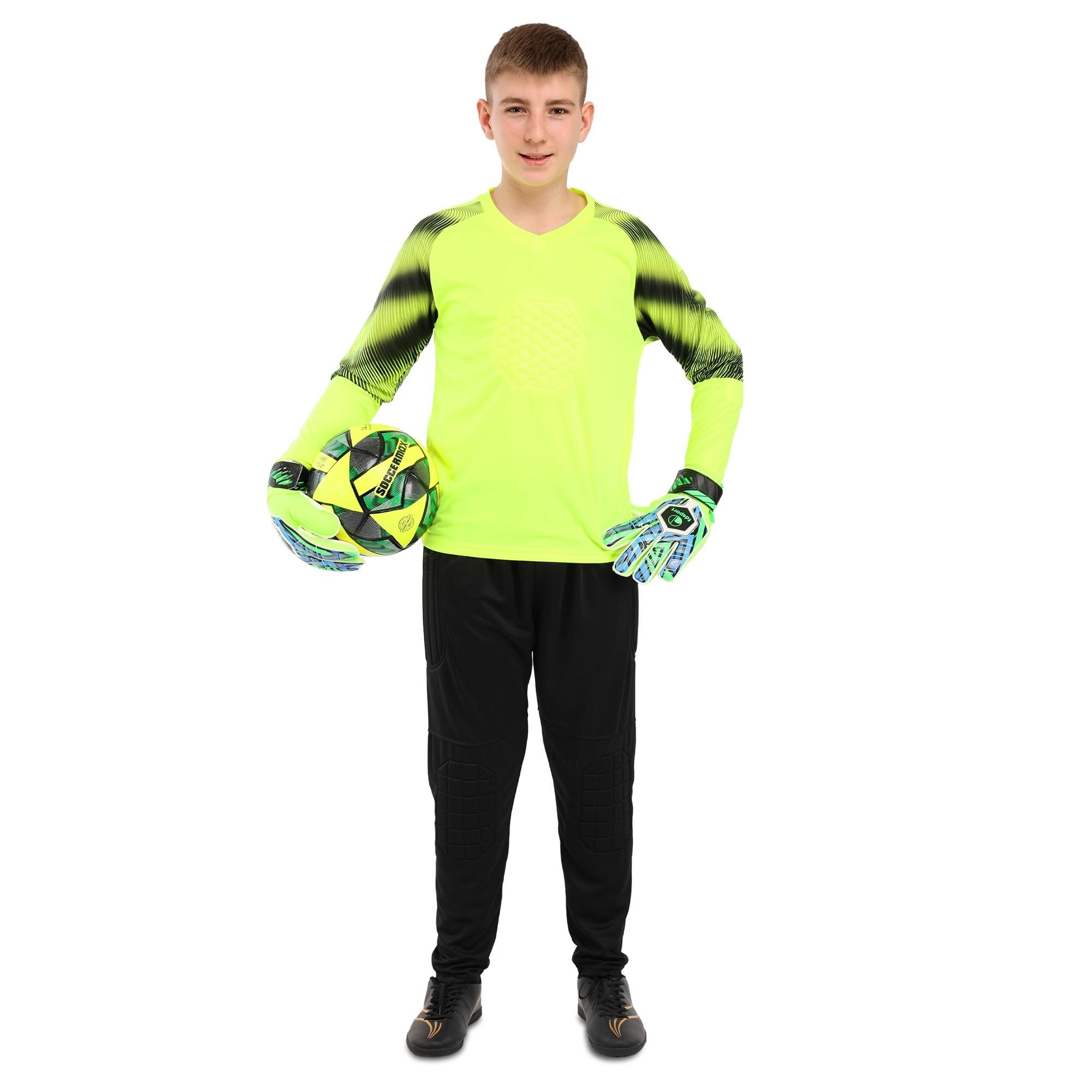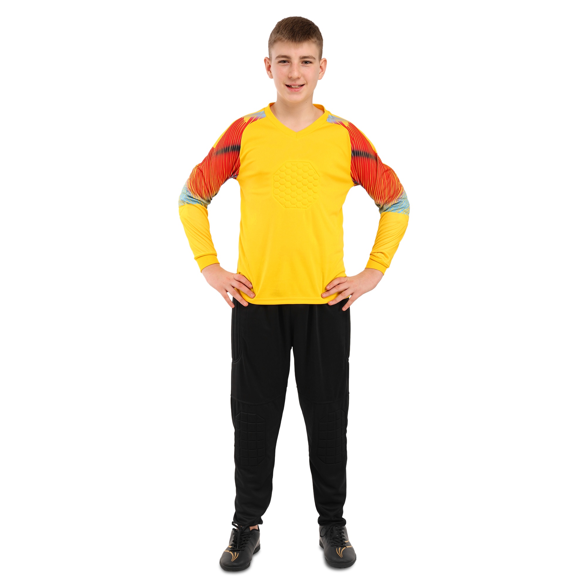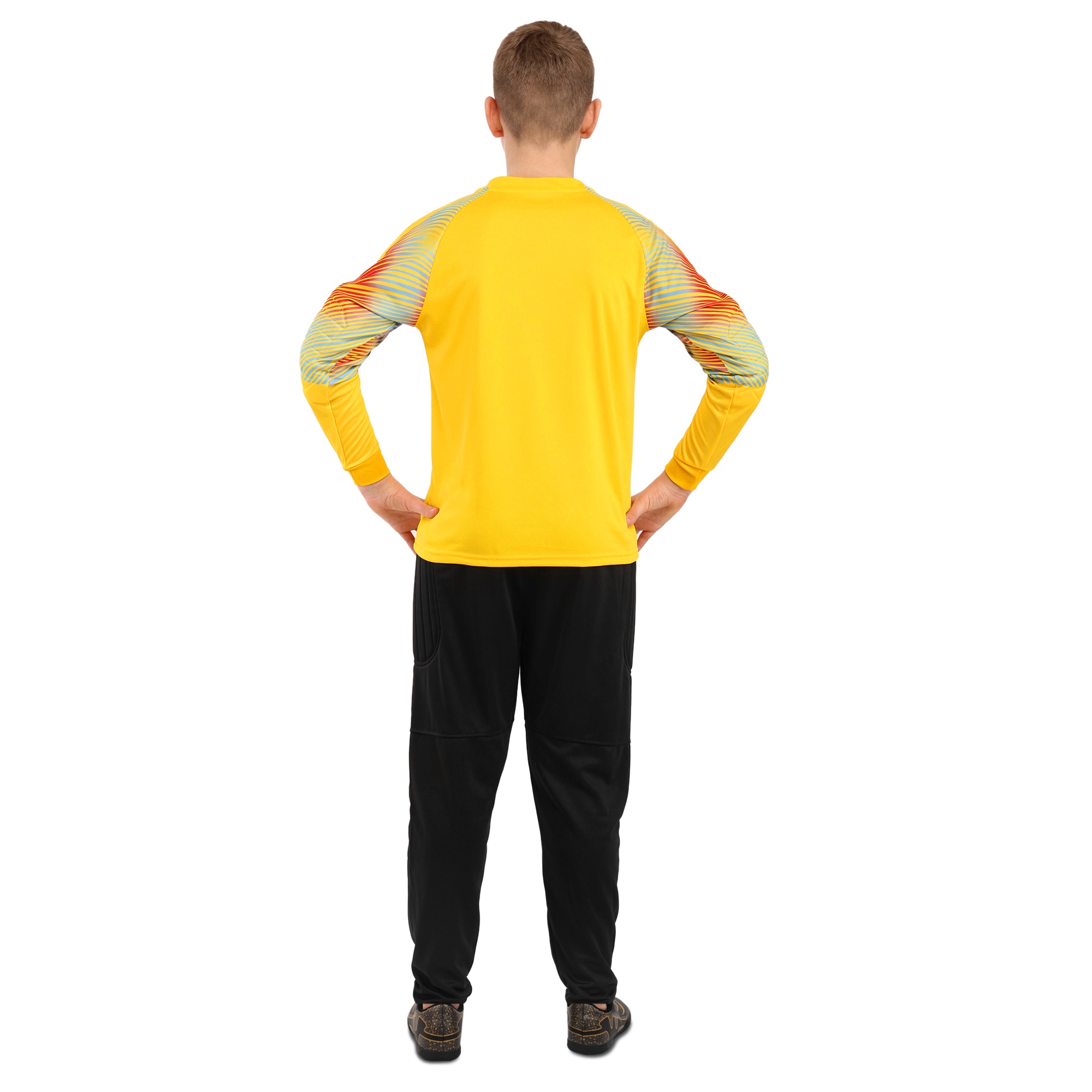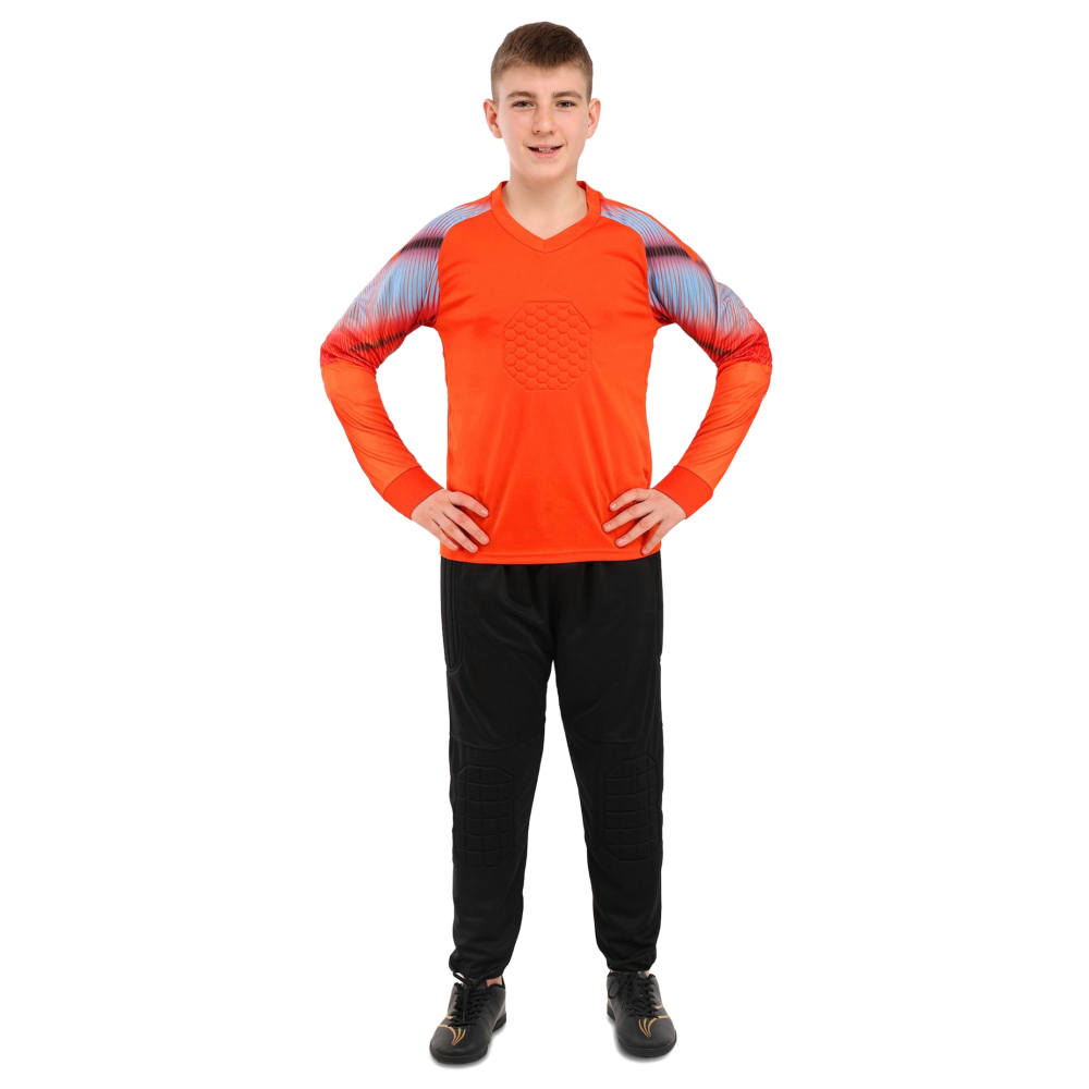 Форма футбольного вратаря SP-Sport предназначена для детей. Комплект включает вратарский свитер и штаны. Оба элемента экипировки изготовлены из полиэстера. Данная синтетическая ткань обеспечивает эффективный влагоотвод, пропускает воздух и не препятствует естественной терморегуляции. В случае падения на траву свитер с длинным рукавом и штаны защитят колени и локти ребёнка от царапин и ссадин. Футбольная экипировка обеспечивает вратарю максимальную свободу движений, возможность вытаскивать самые тяжёлые мячи. Вратарские штаны имеют специальные накладки в местах наиболее вероятного контакта с покрытием поля - на коленях и бёдрах. Аналогичная защитная вставка из мягкого материала расположена на груди.