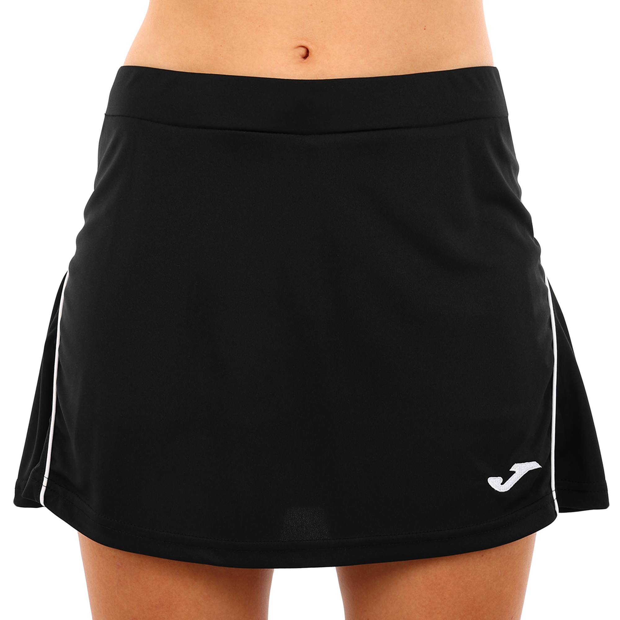Юбка имеет лаконичный однотонный дизайн с тонкой контрастной окантовкой. Спереди расположен вышитый логотип Joma.