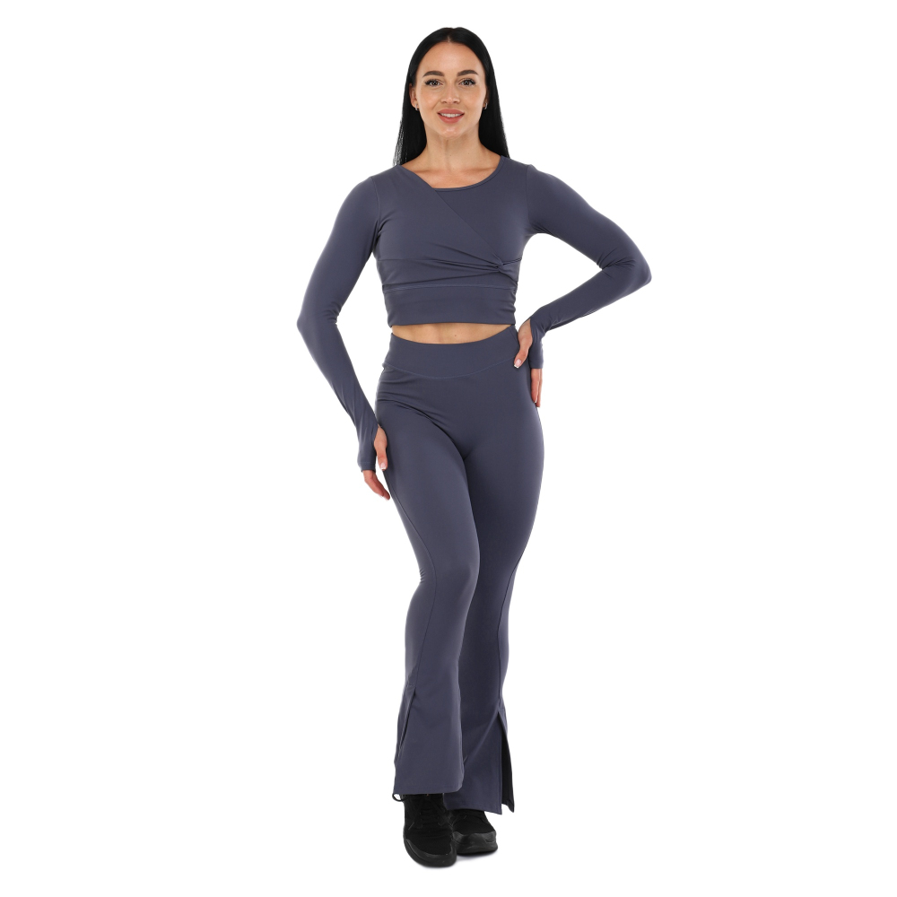Топ с длинными рукавами закрывает руки и не ограничивает подвижность. Лосины облегают ноги на бедрах, на голенях штанины расширяются.