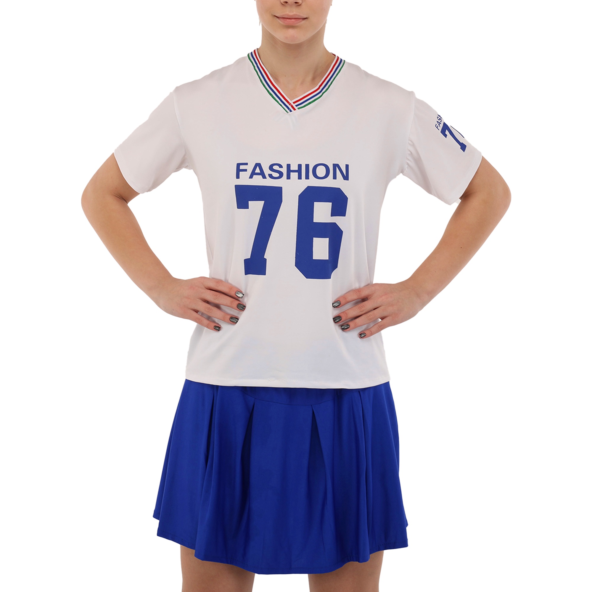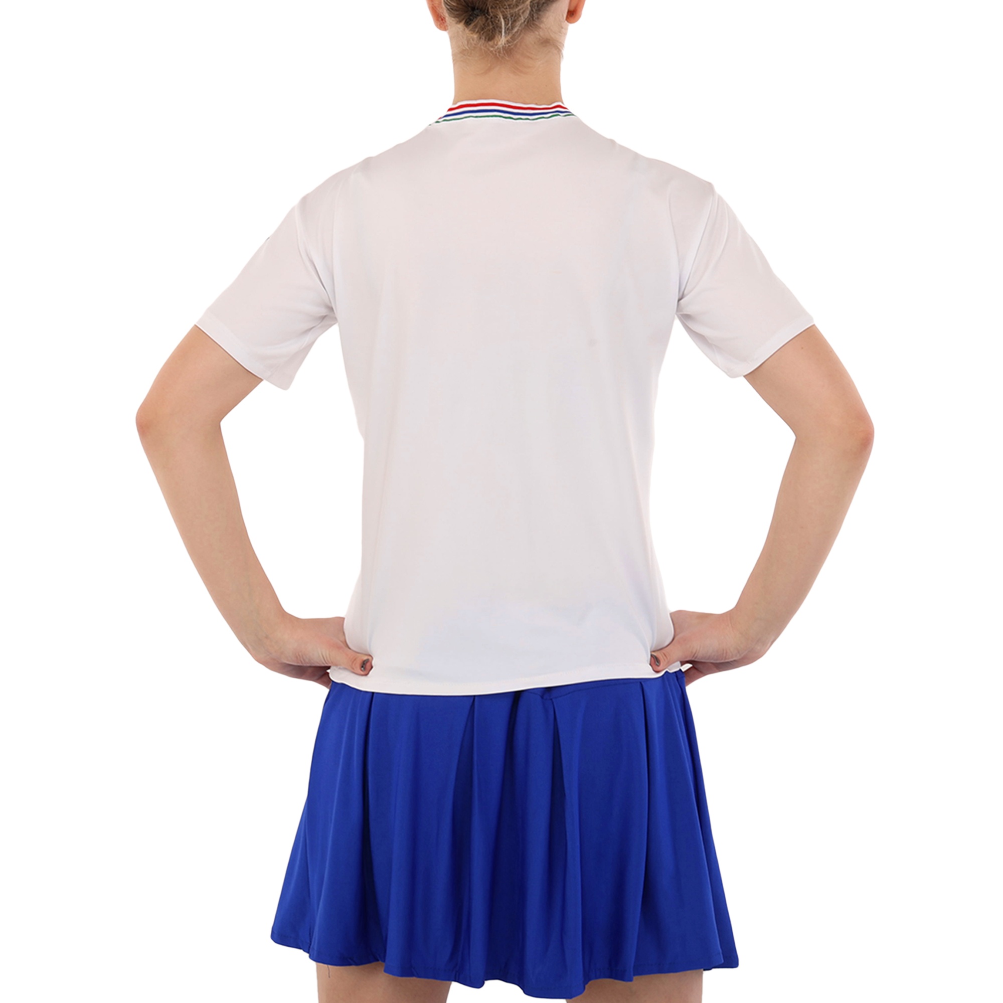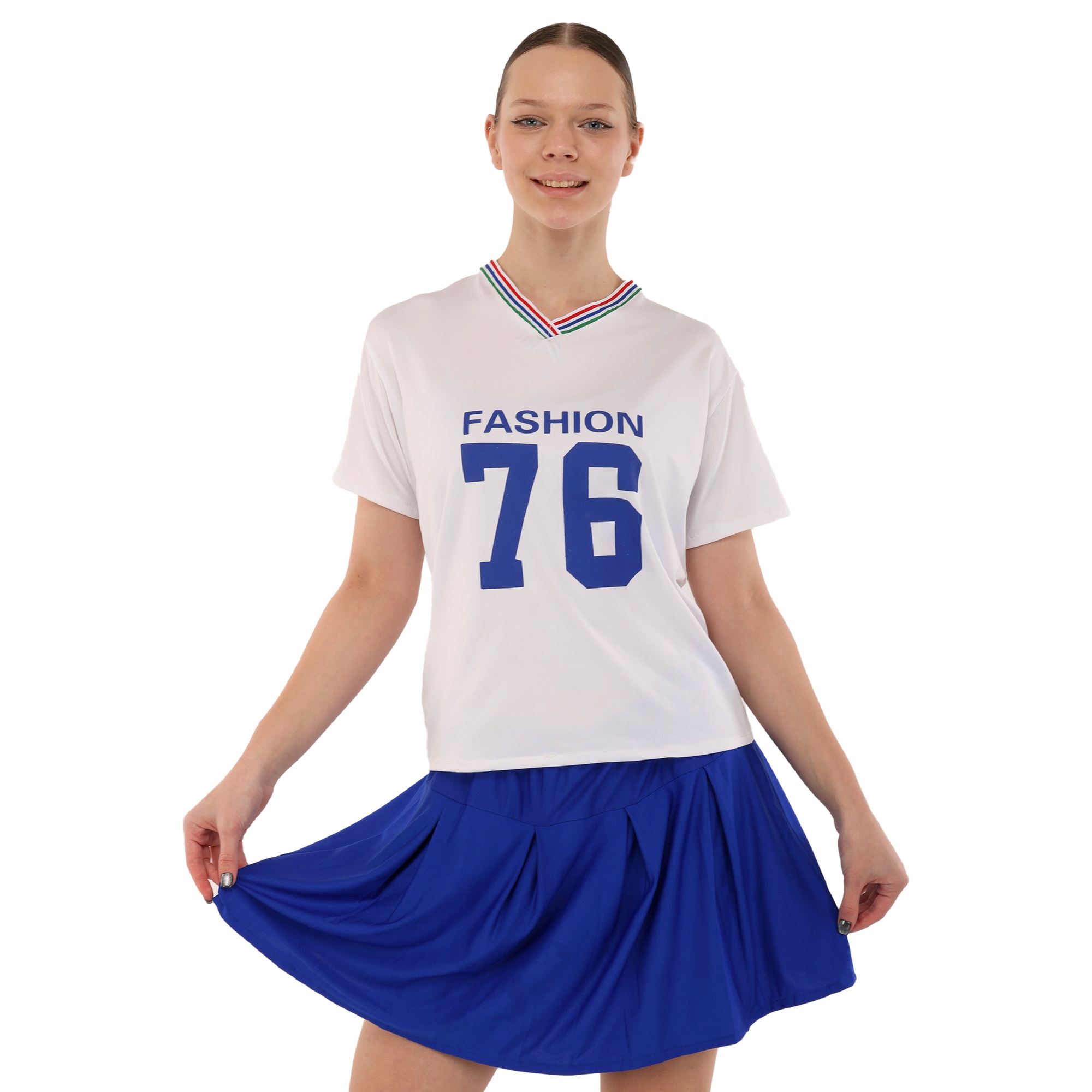 Комплект состоит из удобной футболки прямого кроя с коротким рукавом и широкой горловиной, и плиссированной мини-юбки. Классический дизайн сочетает в себе стиль и спортивную функциональность. Он позволяет выполнять любые движения и выгодно подчеркивает спортивную фигуру спортсменки. Одежда из полиэстера практически не мнется, имеет приятную на ощупь текстуру и сохраняет свои форму и цвет даже после многократных стирок.