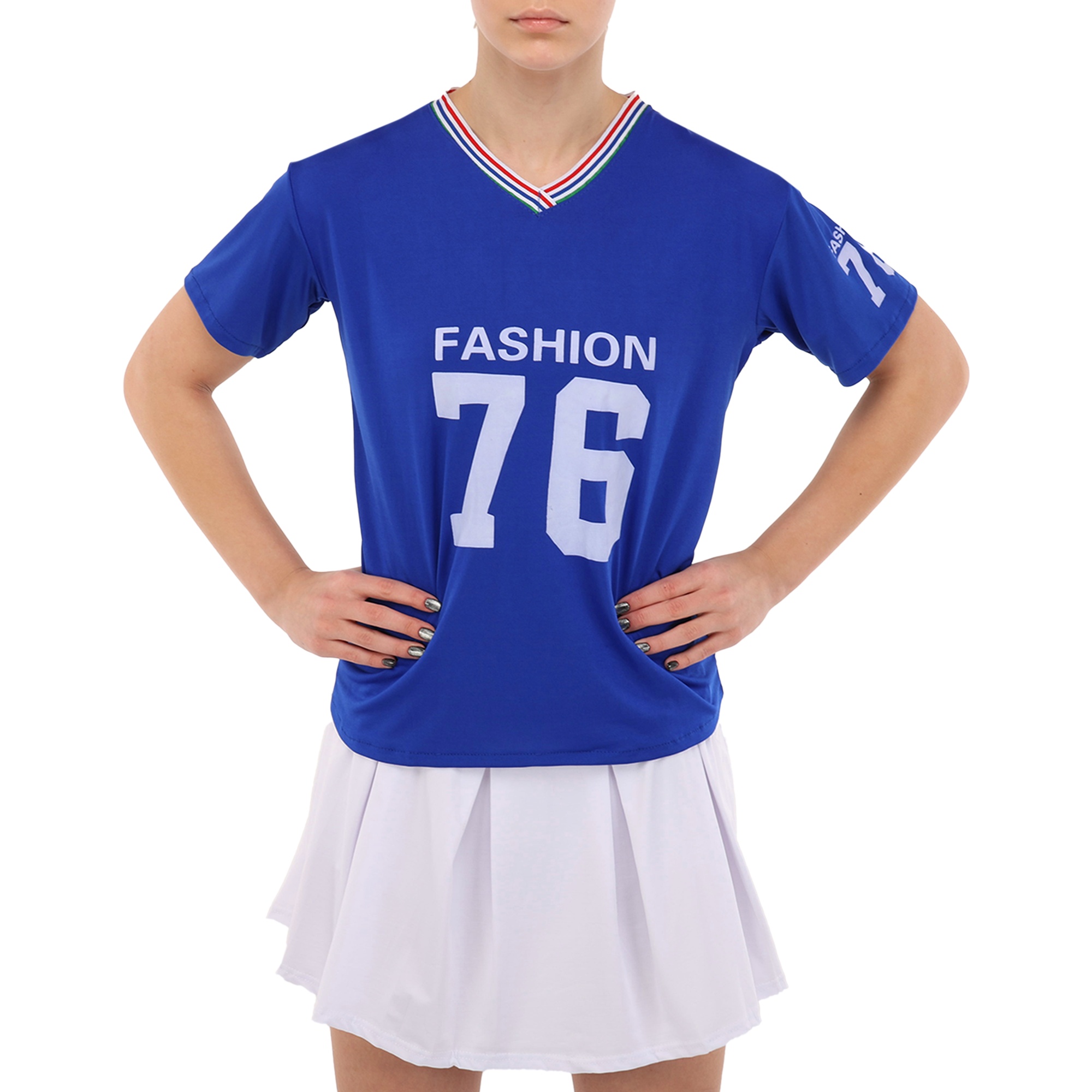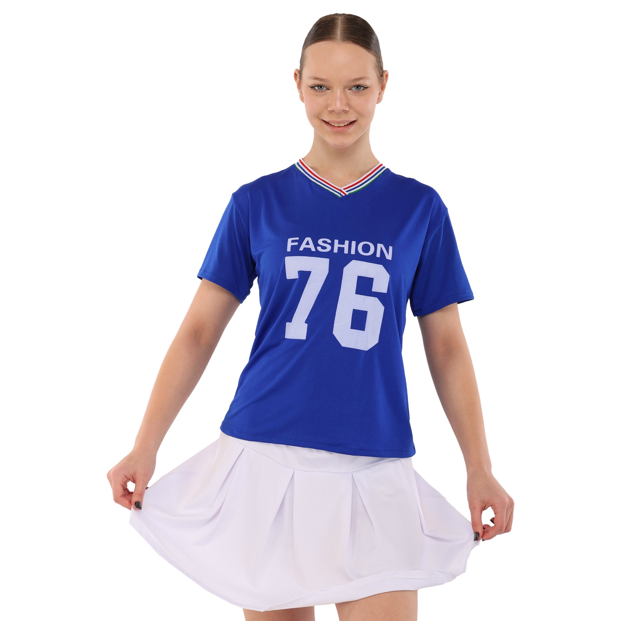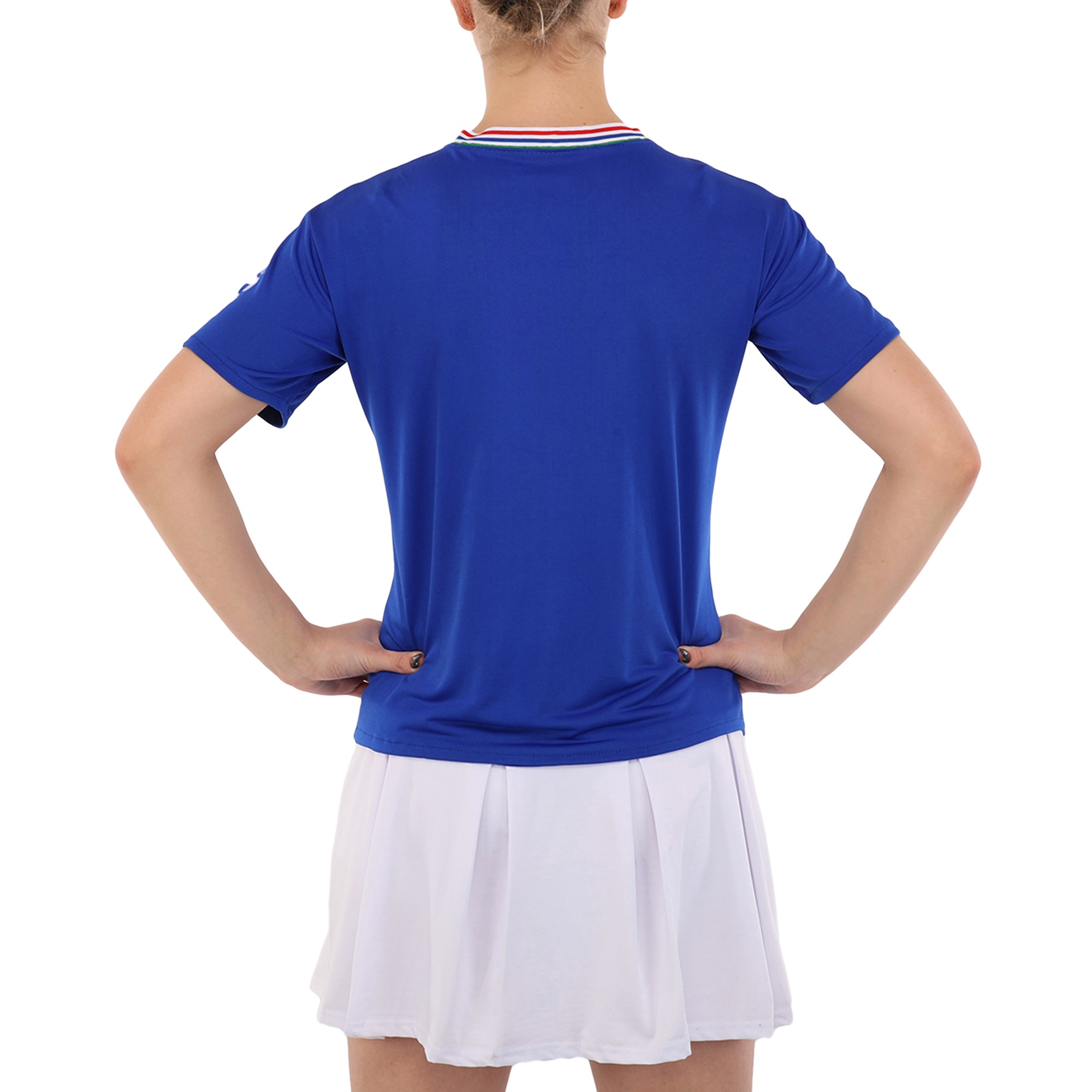 Комплект состоит из удобной футболки прямого кроя с коротким рукавом и широкой горловиной, и плиссированной мини-юбки. Классический дизайн сочетает в себе стиль и спортивную функциональность. Он позволяет выполнять любые движения и выгодно подчеркивает спортивную фигуру спортсменки. Одежда из полиэстера практически не мнется, имеет приятную на ощупь текстуру и сохраняет свои форму и цвет даже после многократных стирок.