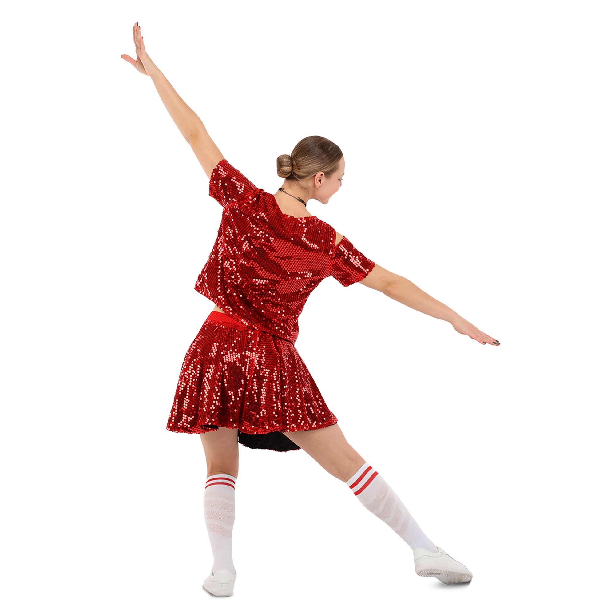 Комплект состоит из кроп-топа с плотной фиксацией и плиссированной мини-юбки. Во время выполнения танцевальных и акробатических элементов одежда красиво движется, создавая визуальную динамику и делая выступление более эстетичным. Ткань, используемая в производстве, отличается легким весом и устойчивостью к деформации. Она практически не мнется, надолго сохраняет насыщенность цветов и легко очищается от загрязнений.