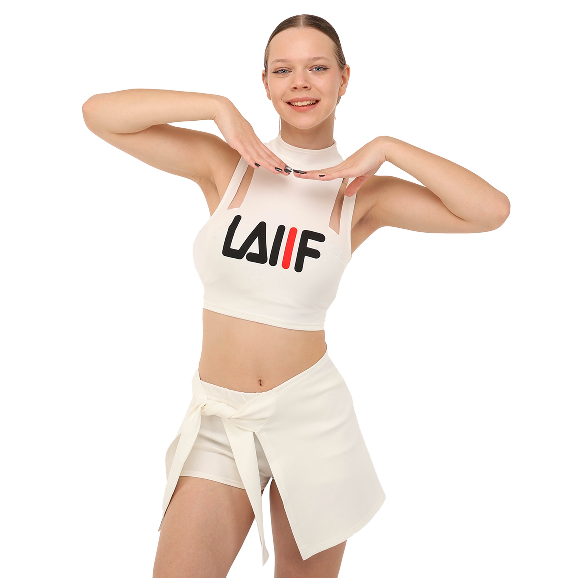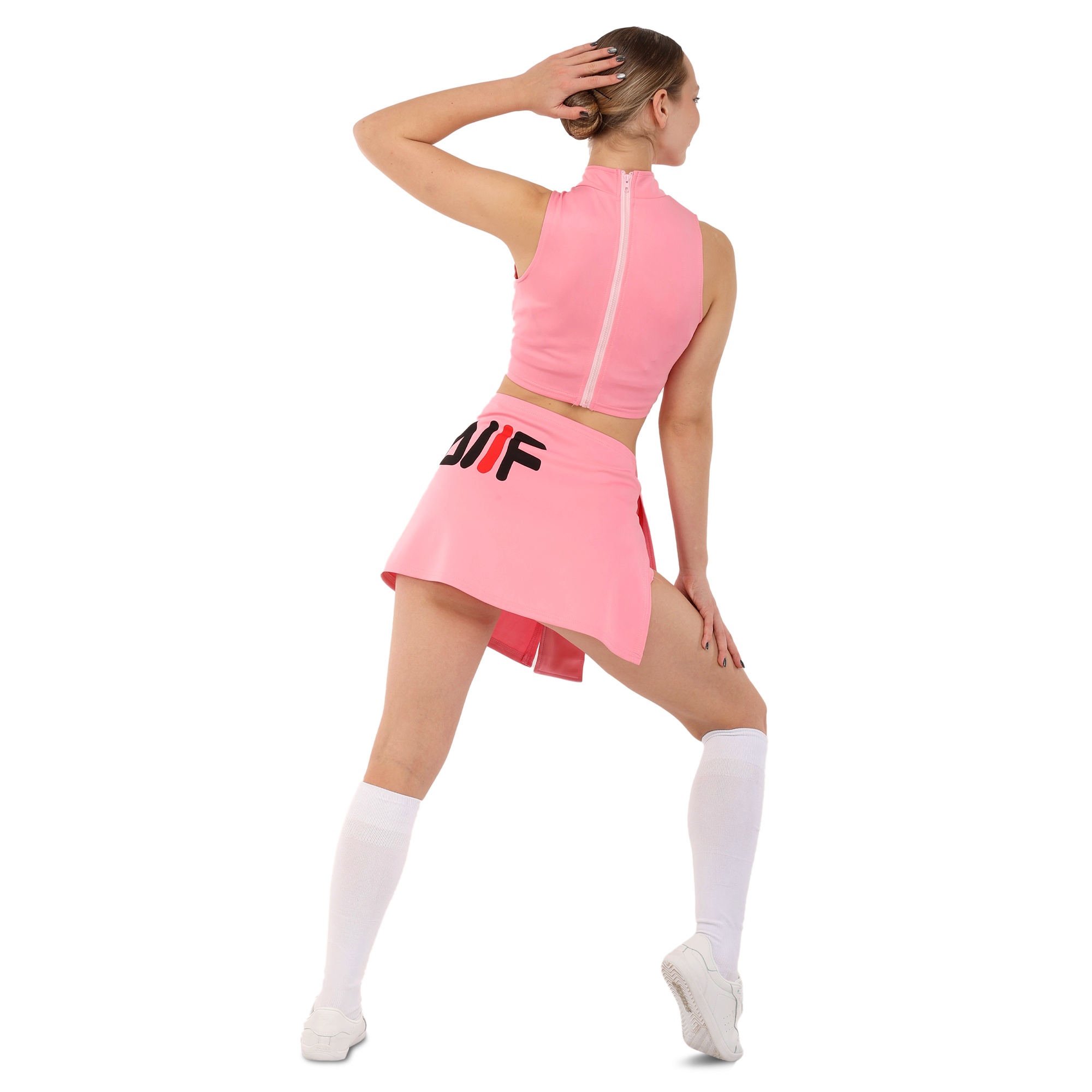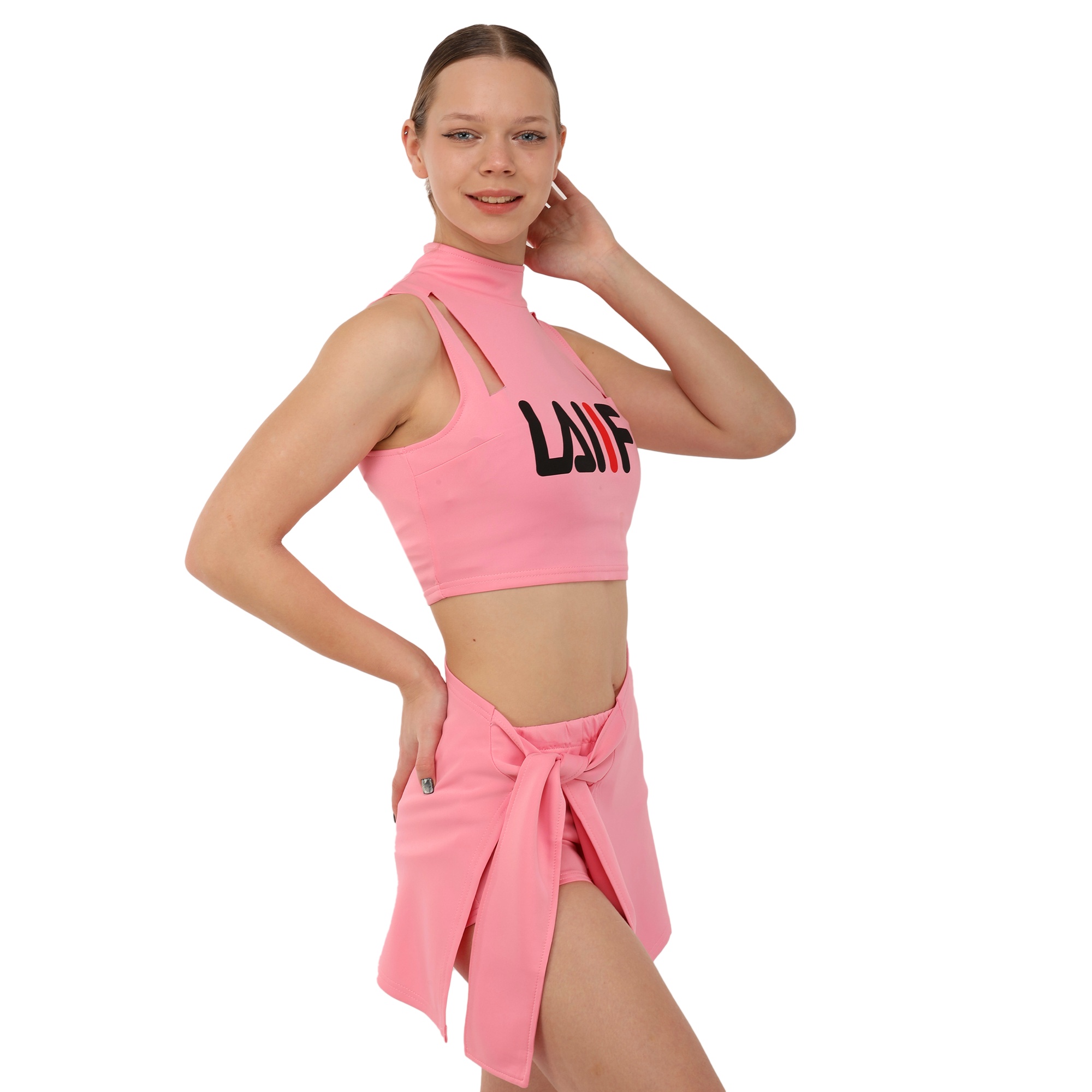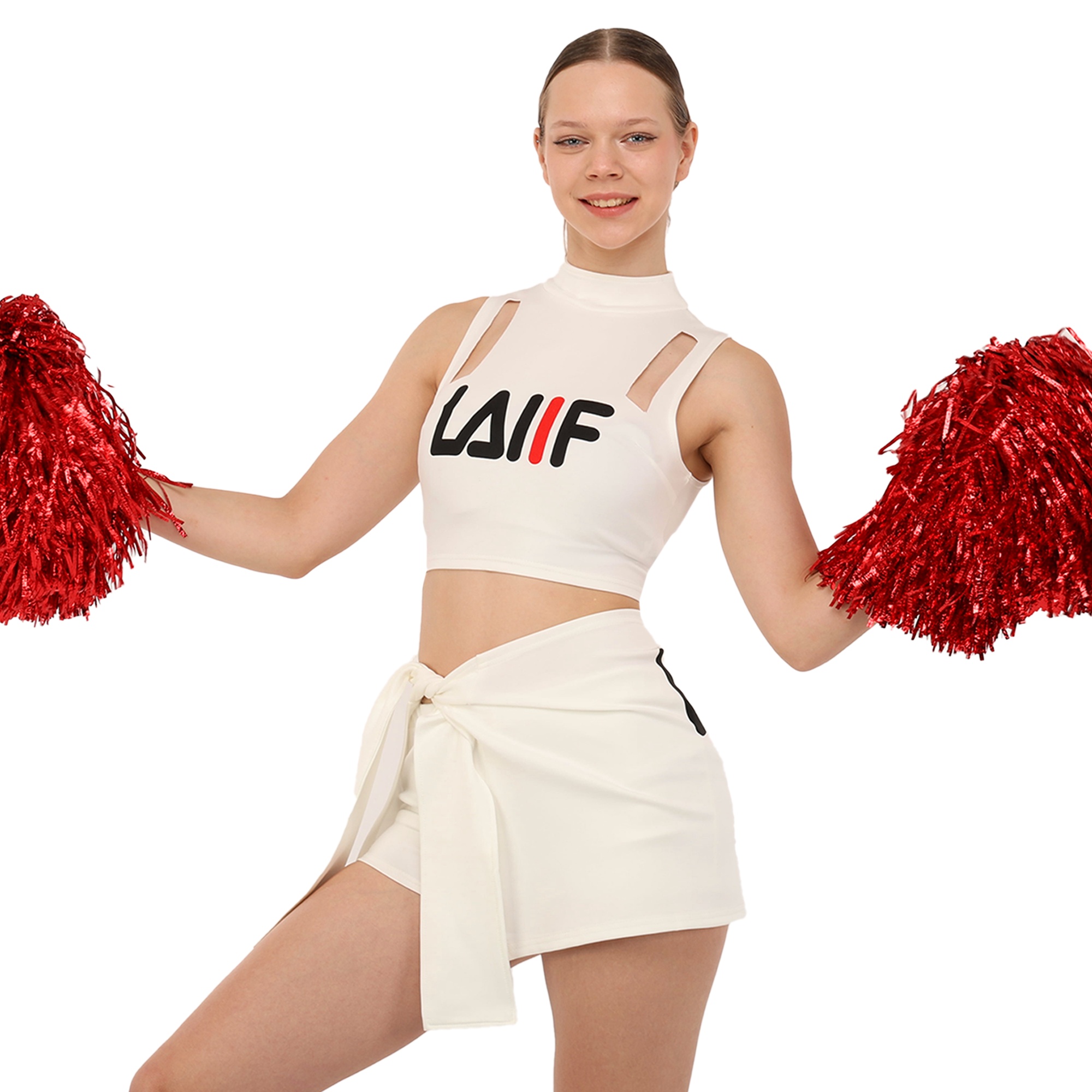 Костюм состоит из короткого топа и мини-юбки. Приталенный топ с воротником стойкой и художественными вырезами не имеет рукавов для большей свободы в плечах. Мини-юбка А-силуэта с внутренними шортами идеально подходит для выполнения классических прыжковых элементов чирлидинга. Ткань одежды хорошо пропускает воздух, быстро сохнет, не мнется и не впитывает неприятные запахи.