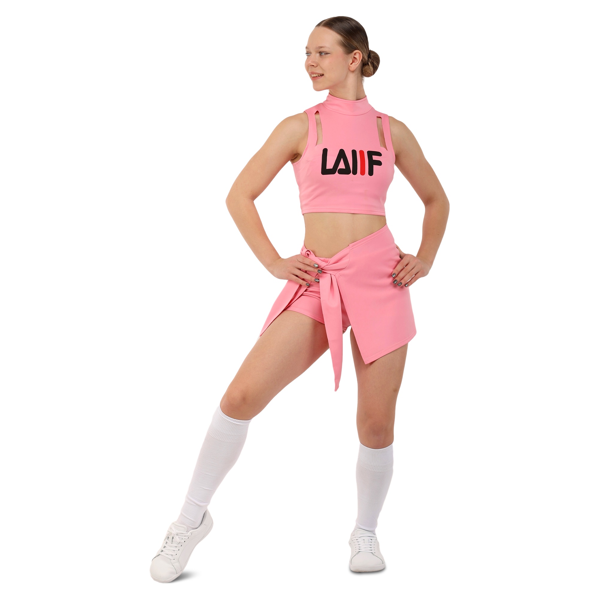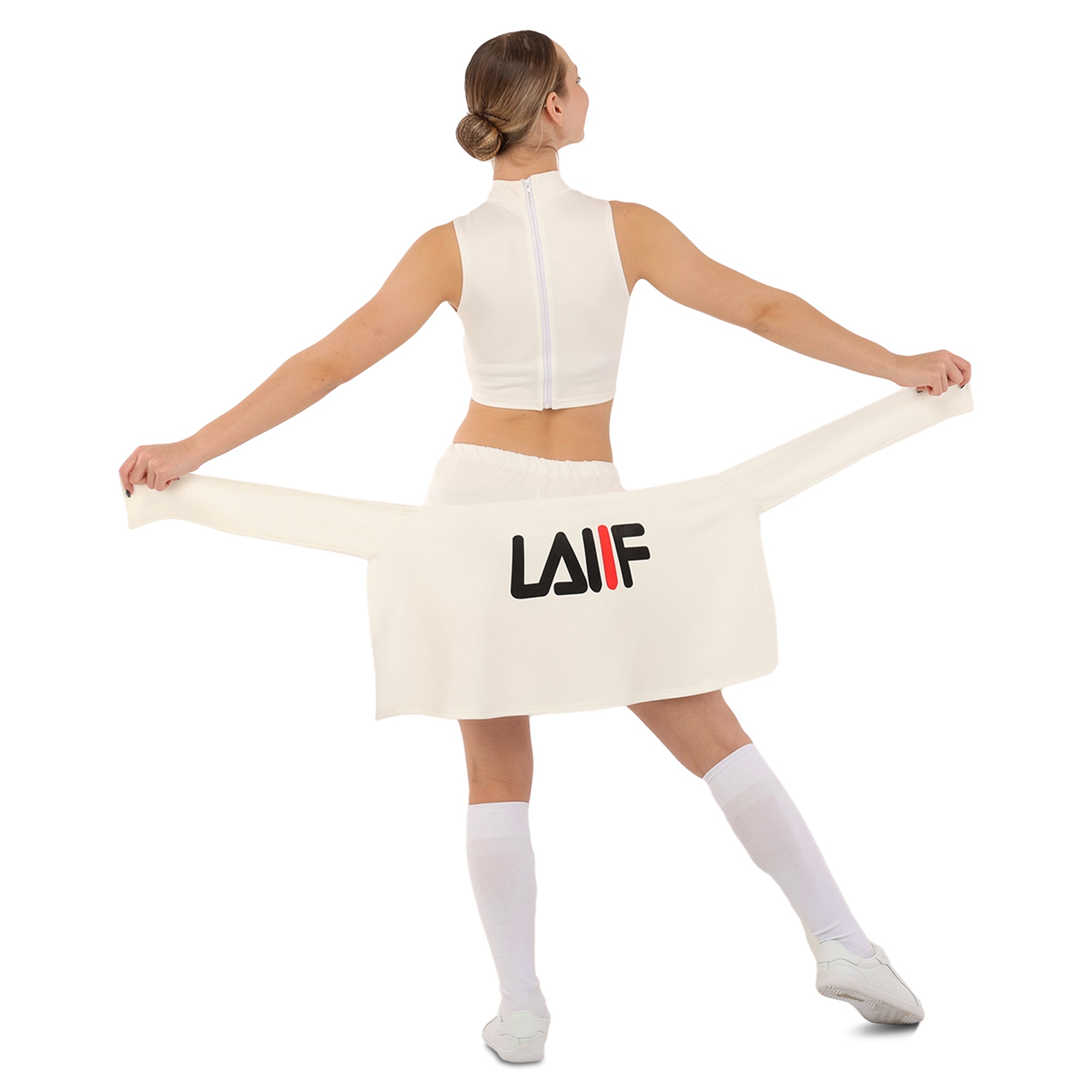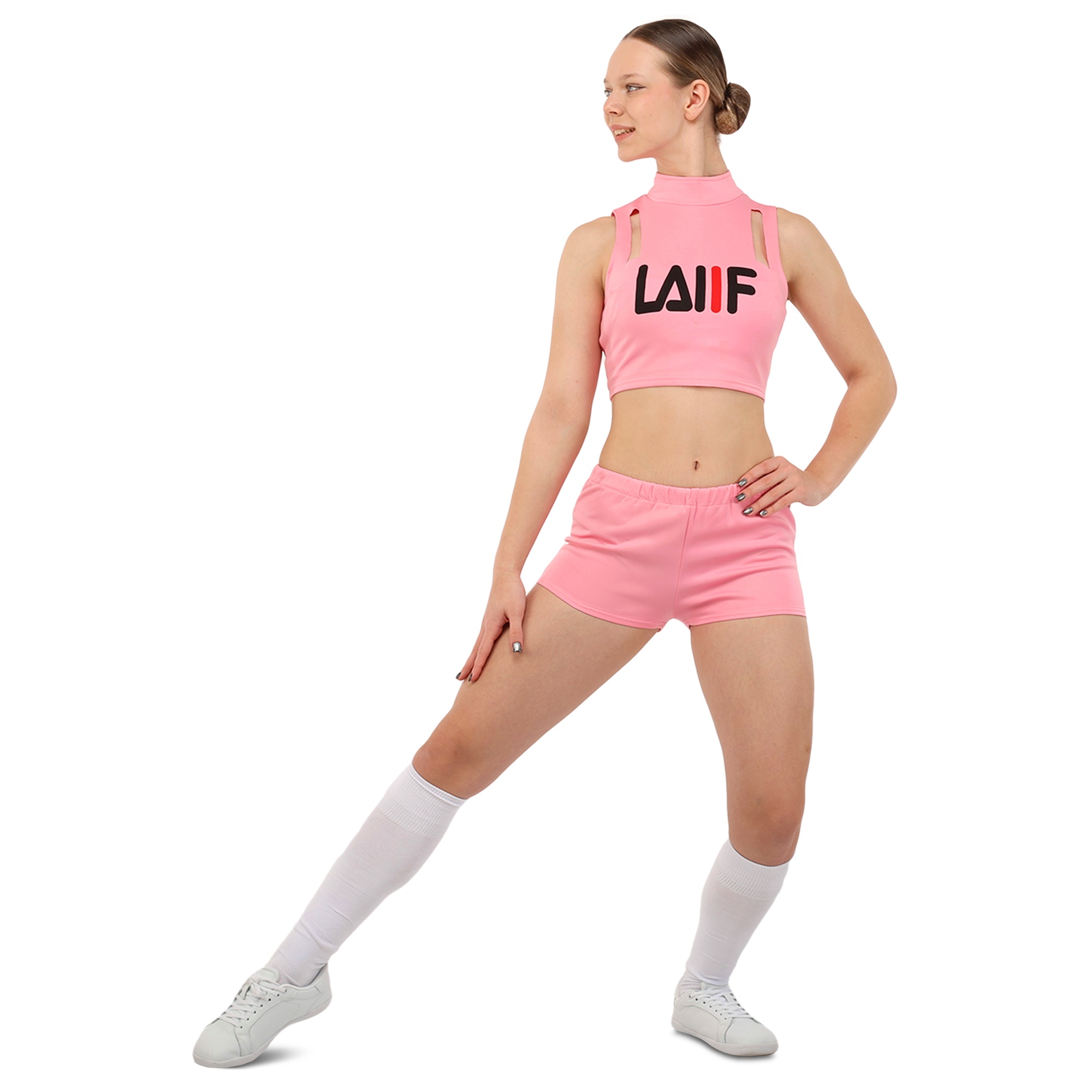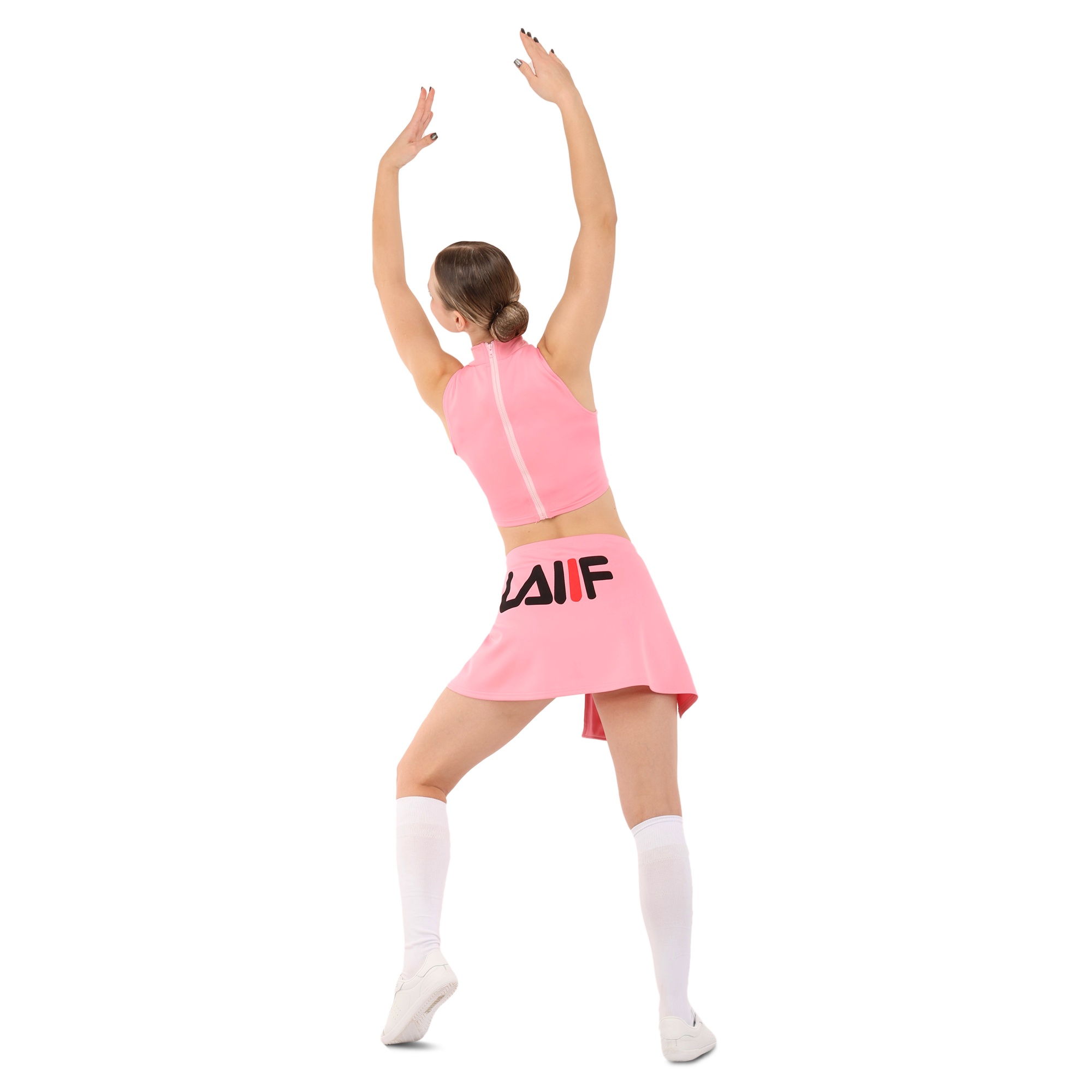 Костюм состоит из короткого топа и мини-юбки. Приталенный топ с воротником стойкой и художественными вырезами не имеет рукавов для большей свободы в плечах. Мини-юбка А-силуэта с внутренними шортами идеально подходит для выполнения классических прыжковых элементов чирлидинга. Ткань одежды хорошо пропускает воздух, быстро сохнет, не мнется и не впитывает неприятные запахи.