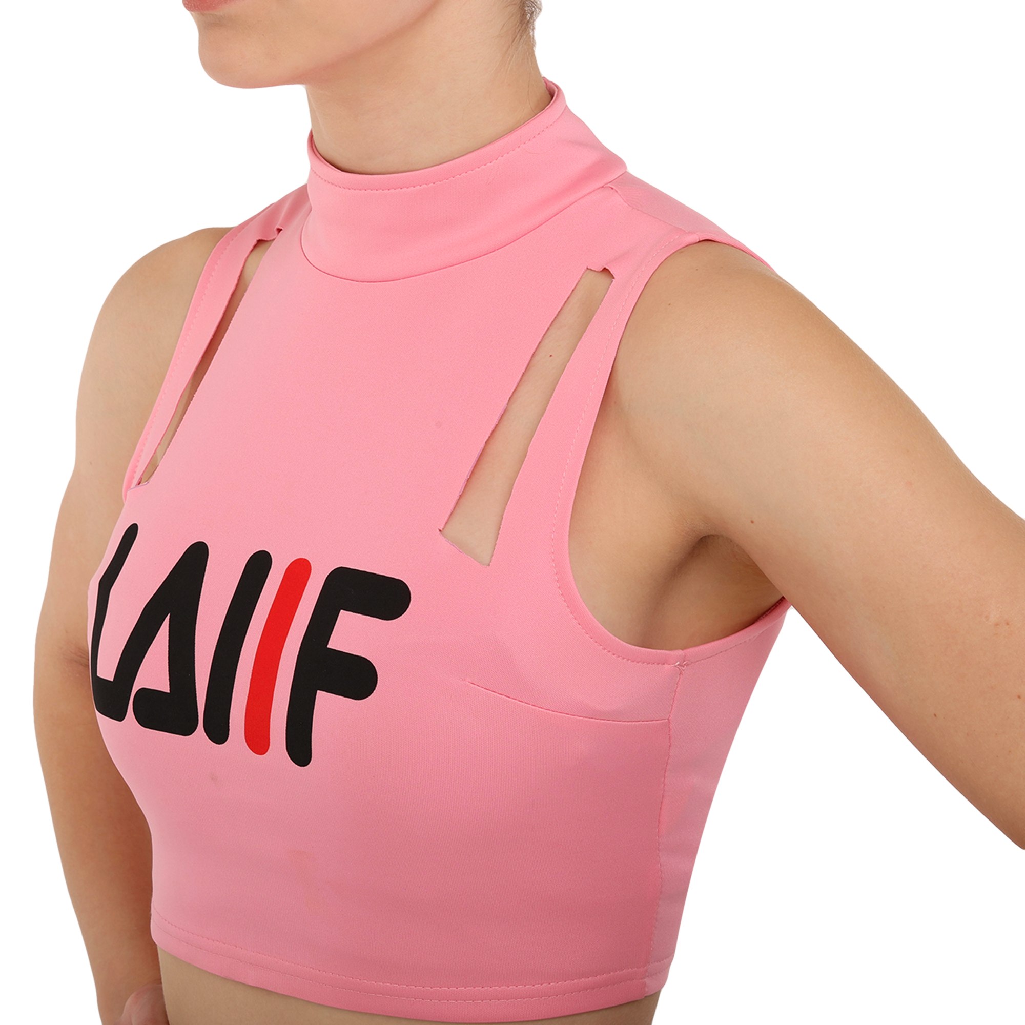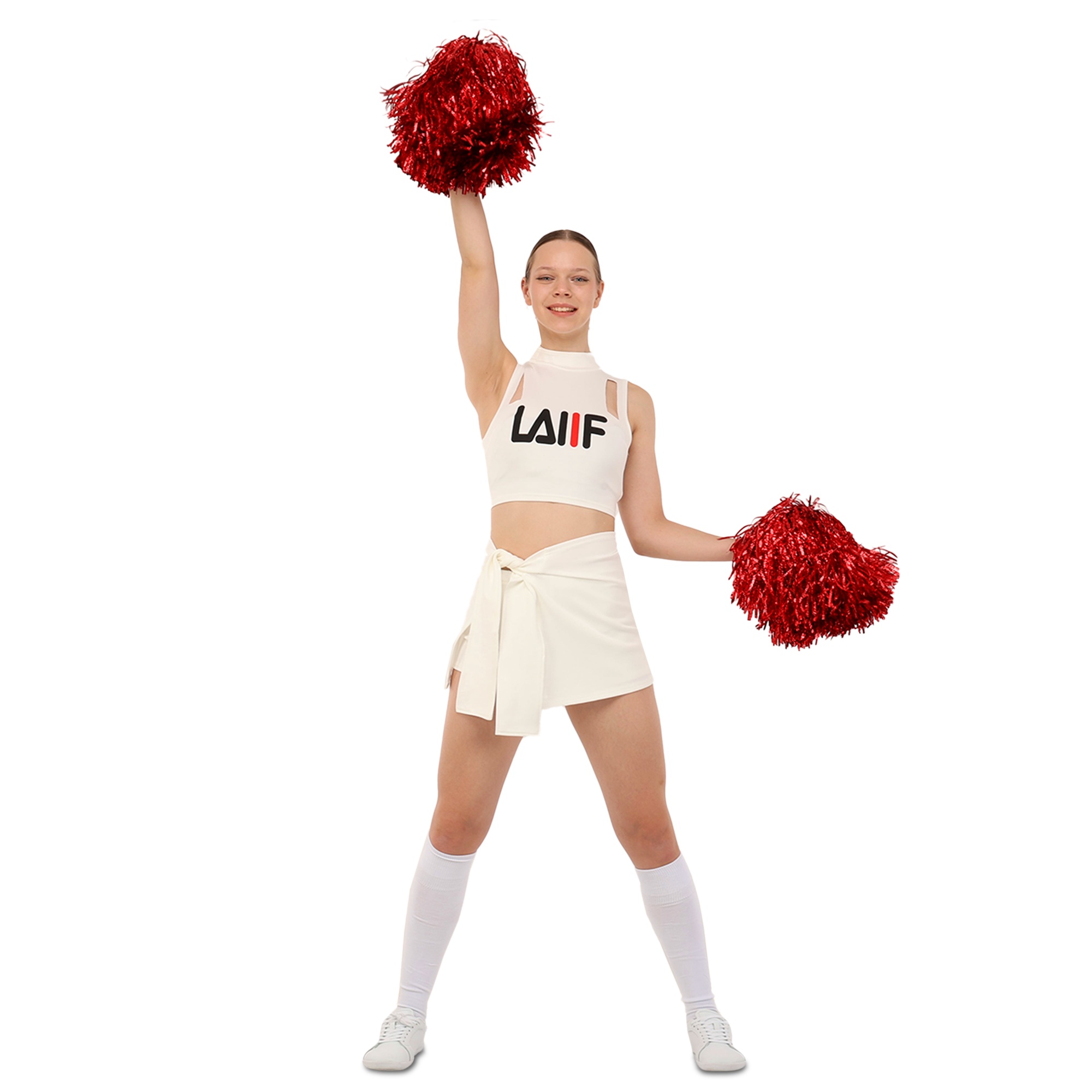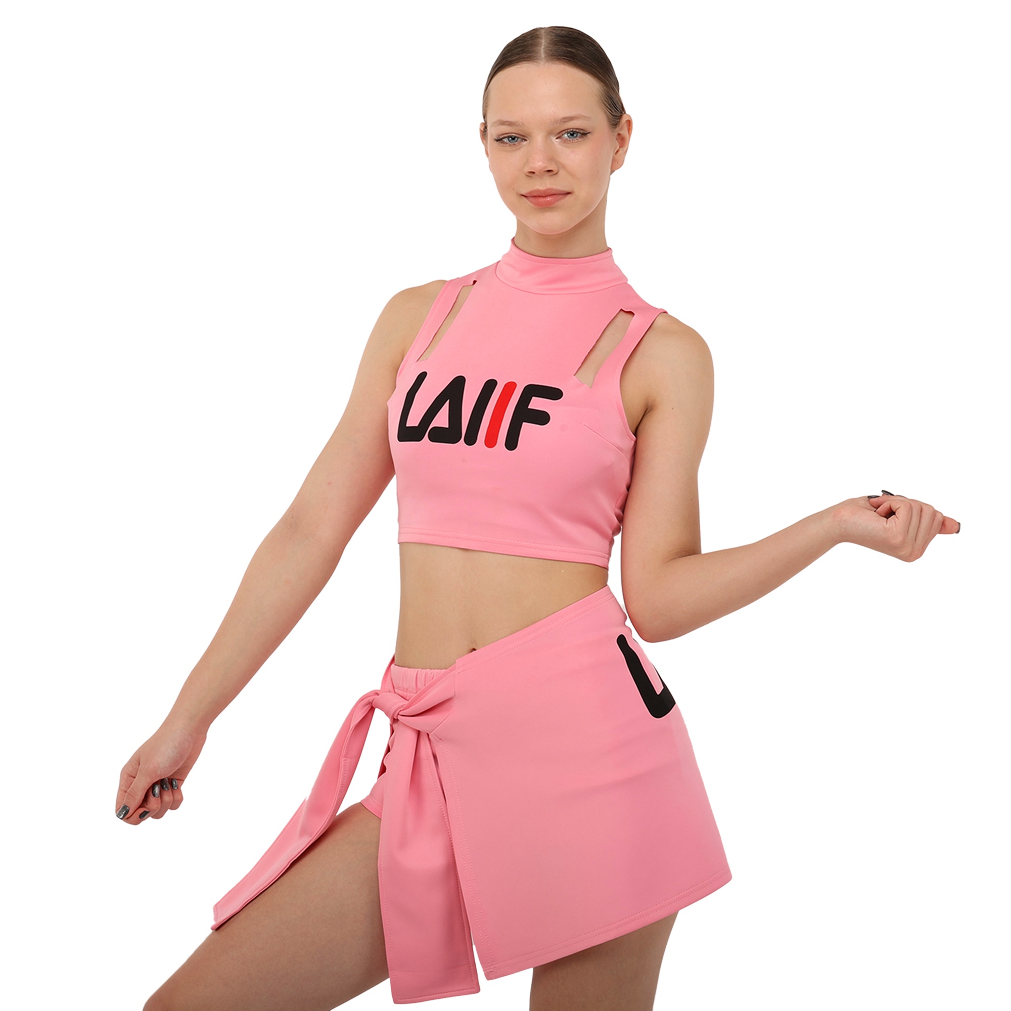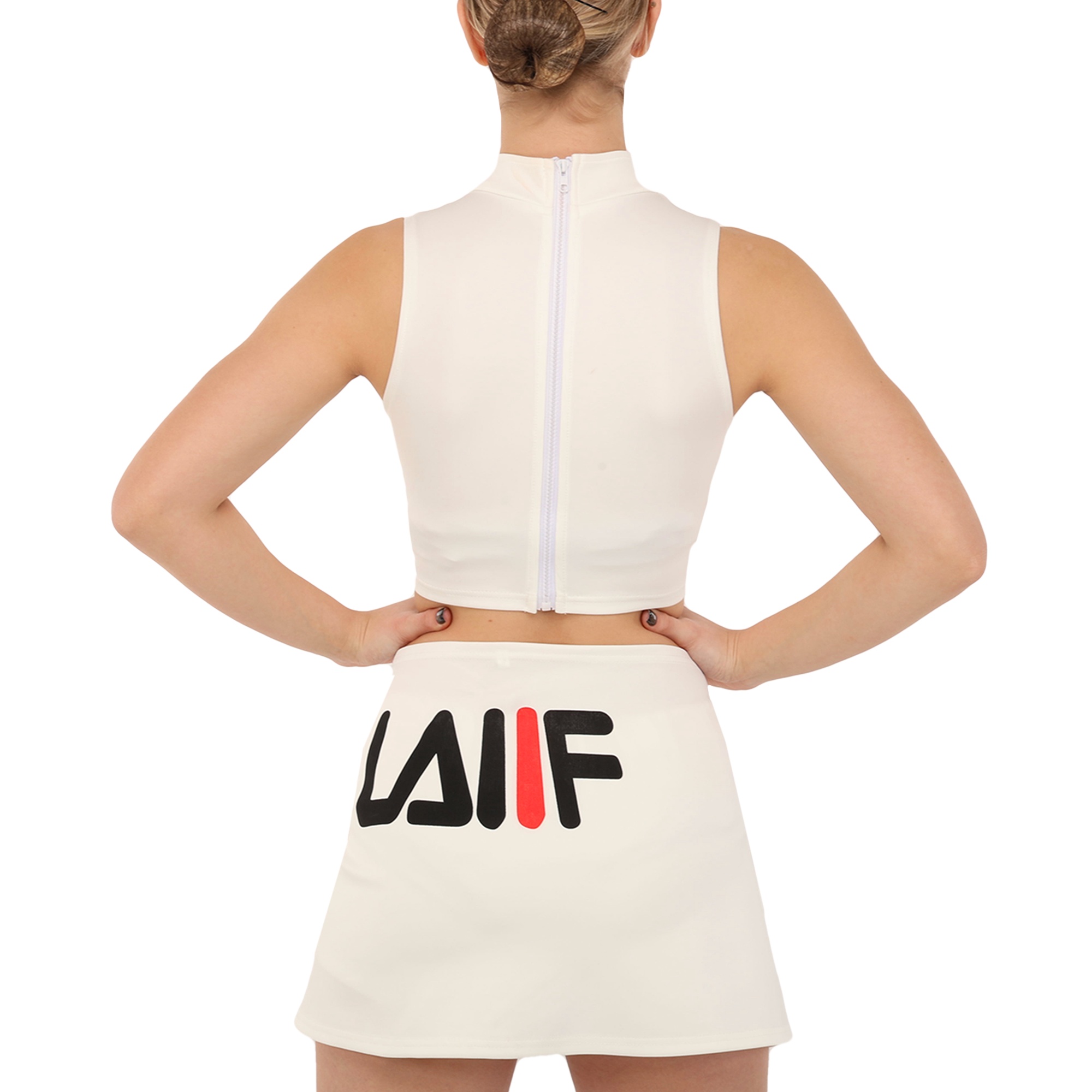 Костюм состоит из короткого топа и мини-юбки. Приталенный топ с воротником стойкой и художественными вырезами не имеет рукавов для большей свободы в плечах. Мини-юбка А-силуэта с внутренними шортами идеально подходит для выполнения классических прыжковых элементов чирлидинга. Ткань одежды хорошо пропускает воздух, быстро сохнет, не мнется и не впитывает неприятные запахи.